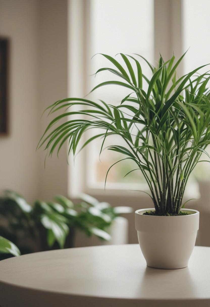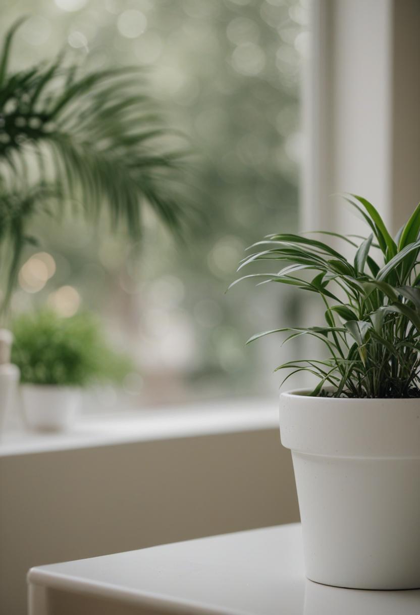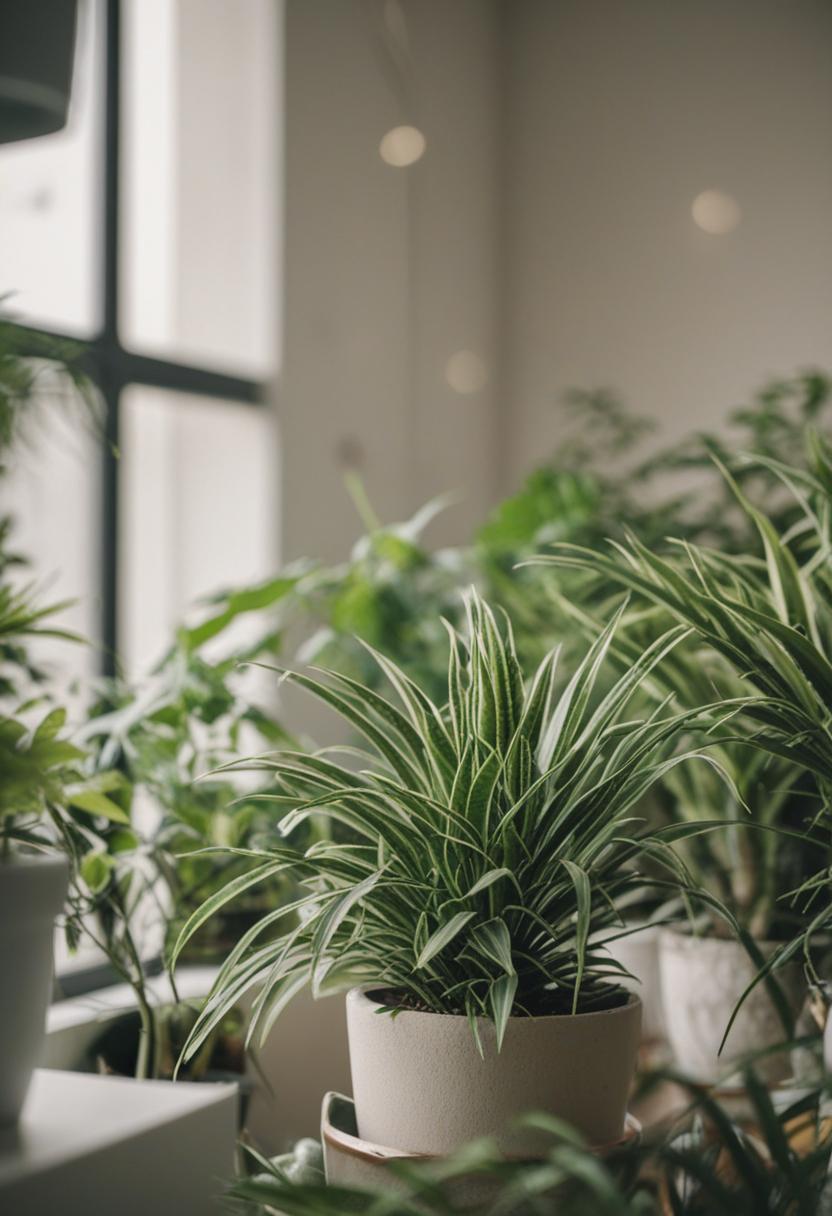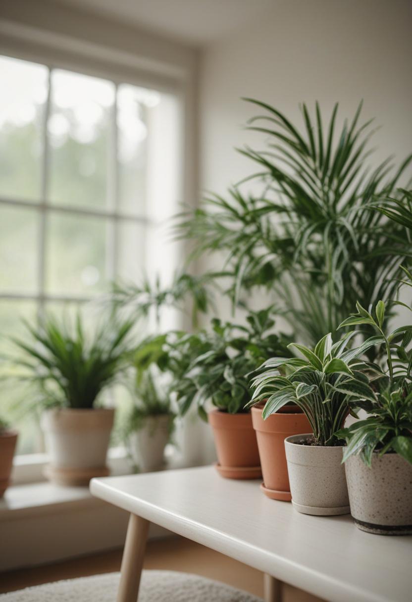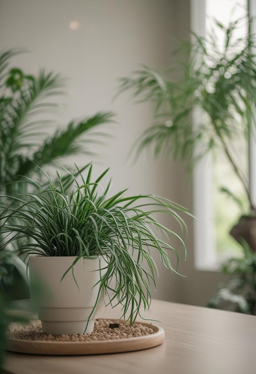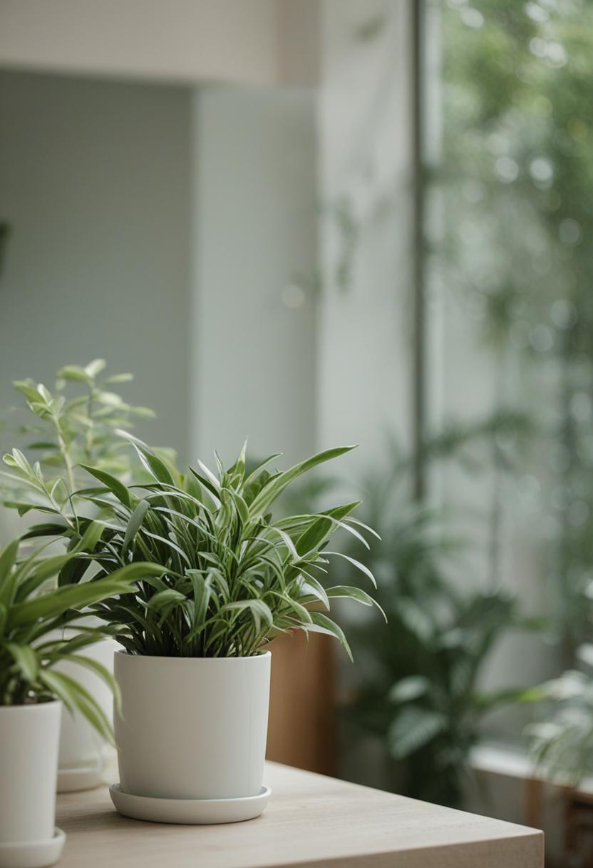 2. A serene scene featuring lush, vibrant plants arranged in a calming, nature-inspired background, perfect for a minimalist or bohemian aesthetic. Soft greens and earthy tones create a peaceful, inviting atmosphere.