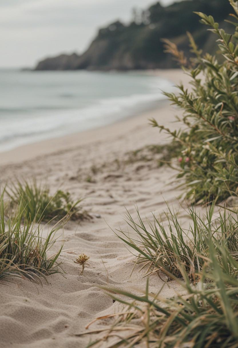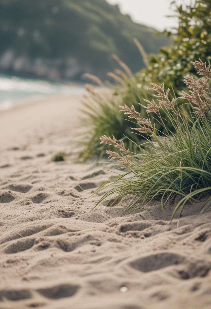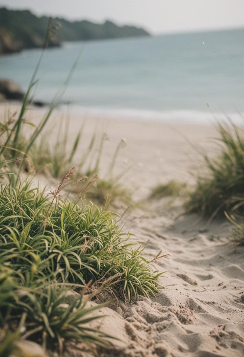 6. A serene beach scene with lush green plants, soft sands, and gentle waves. The image captures a tranquil, coastal vibe with natural elements blending seamlessly into the shoreline.