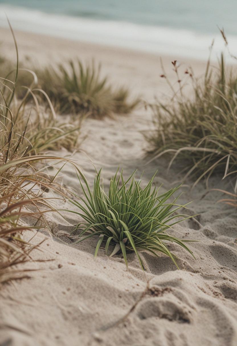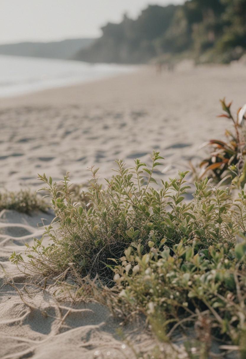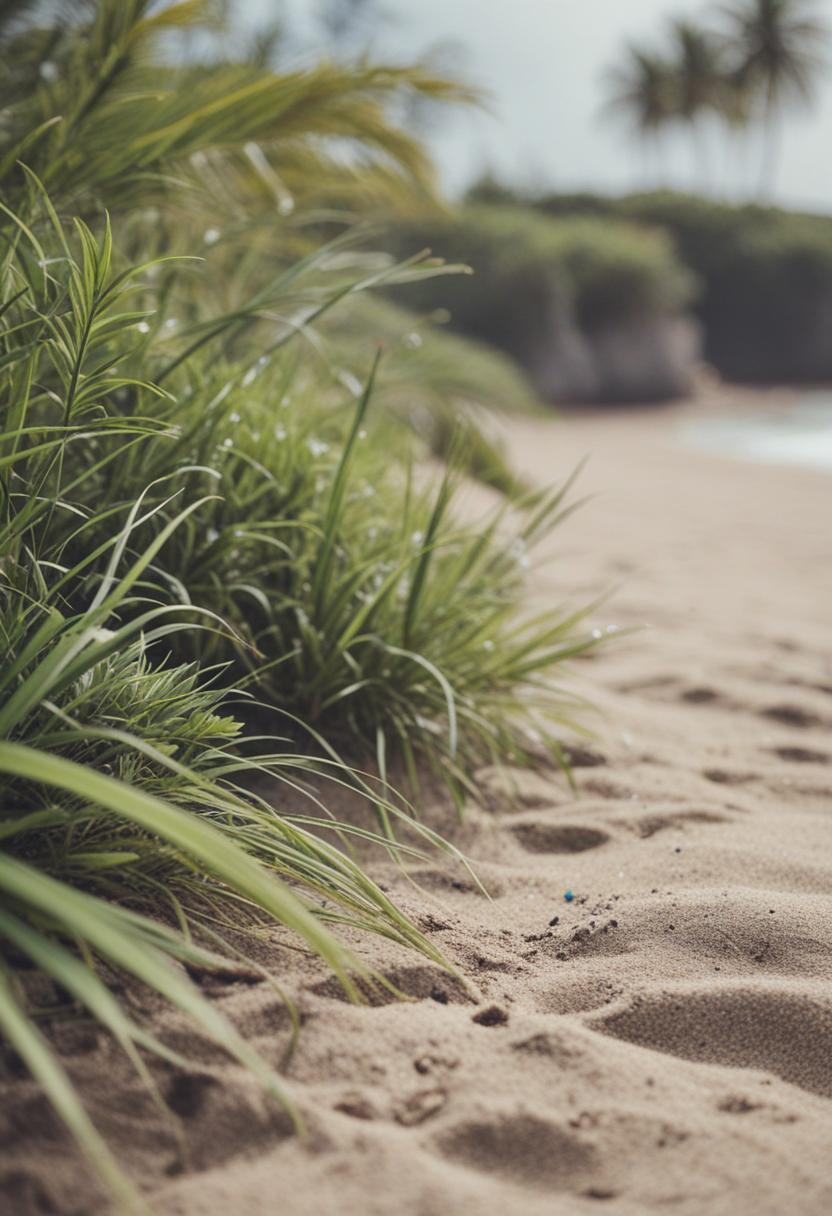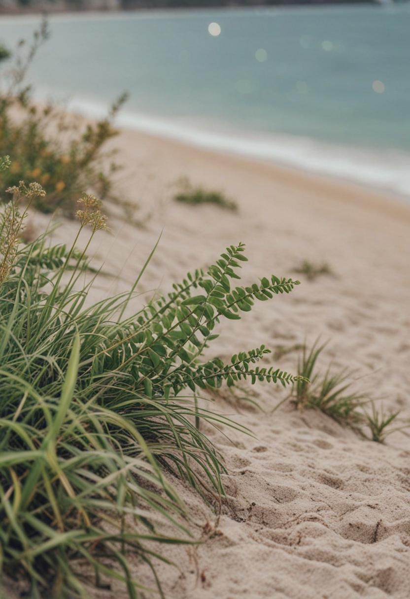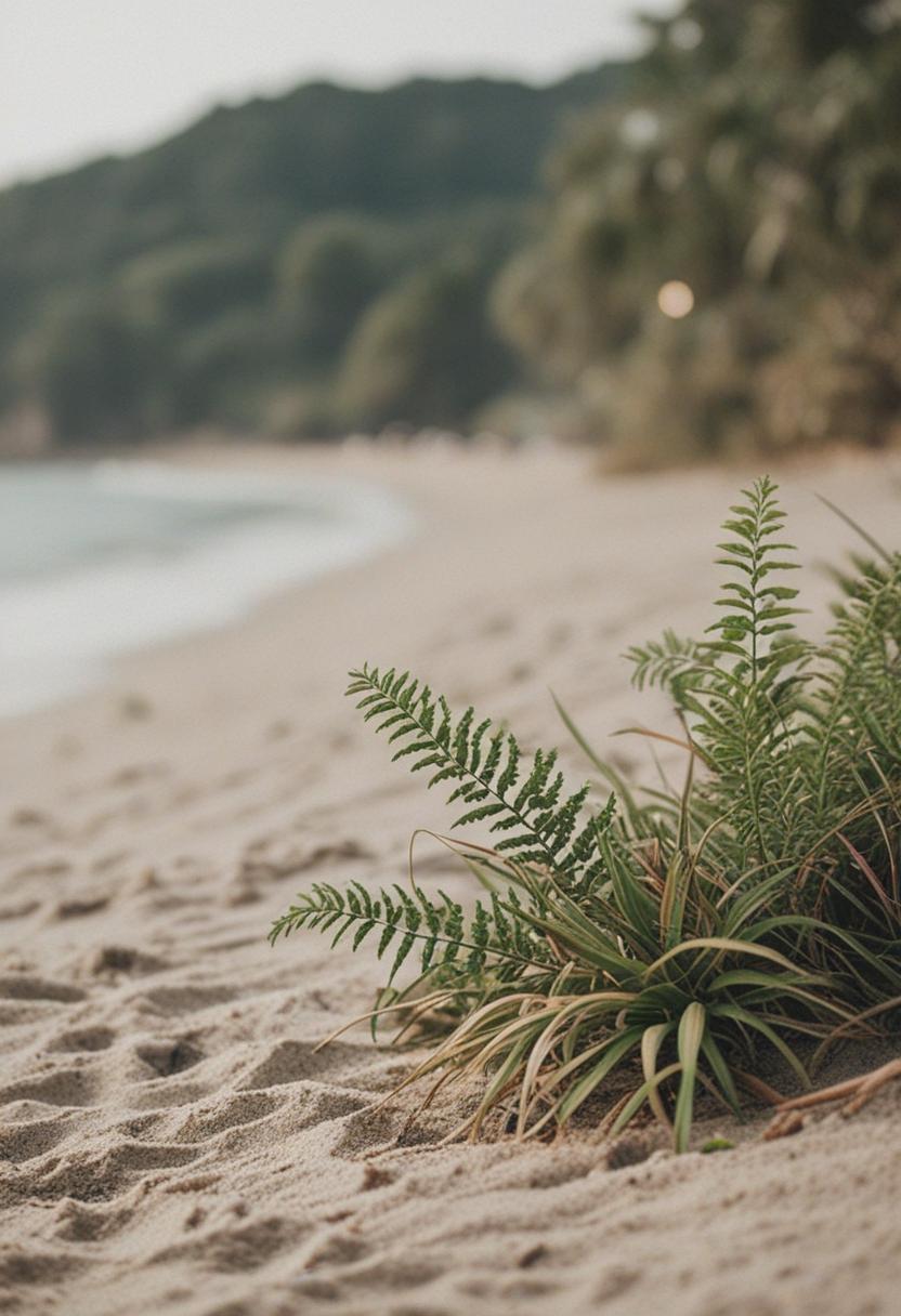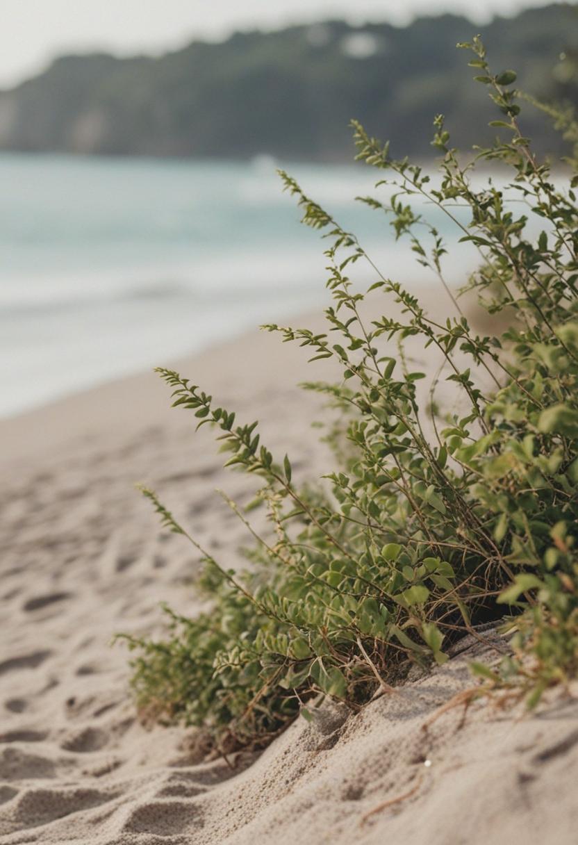 8. A serene beach scene featuring lush green plants with soft, natural textures, capturing the calm and peaceful essence of a coastal environment.