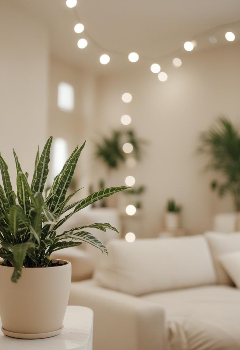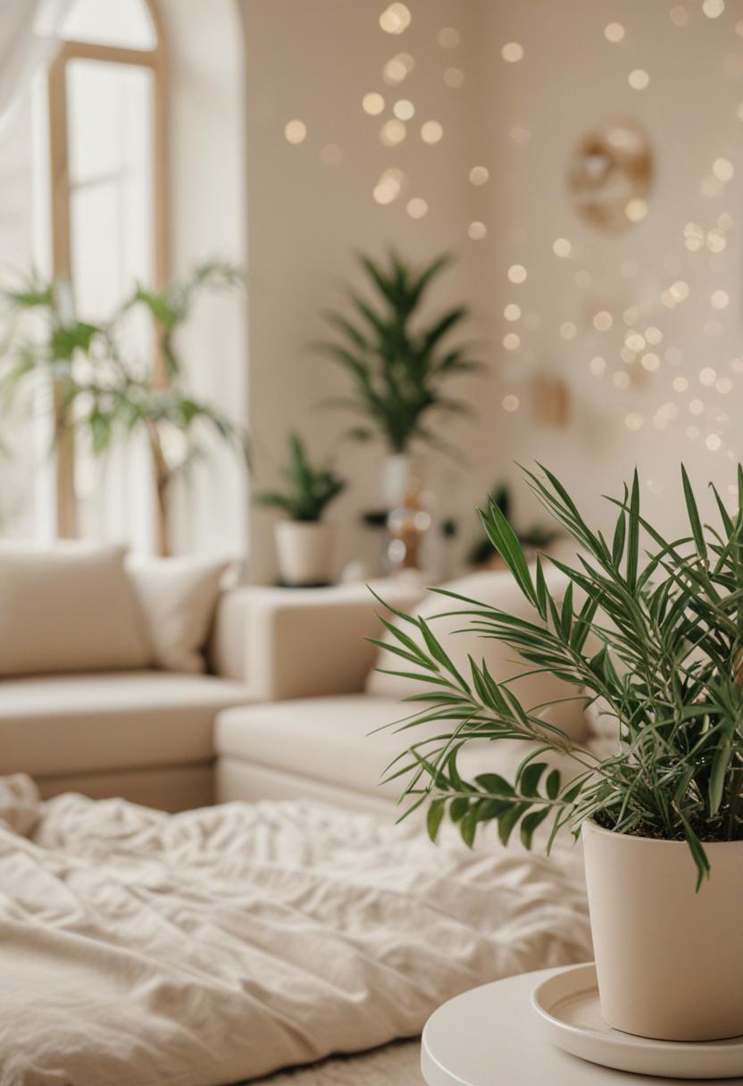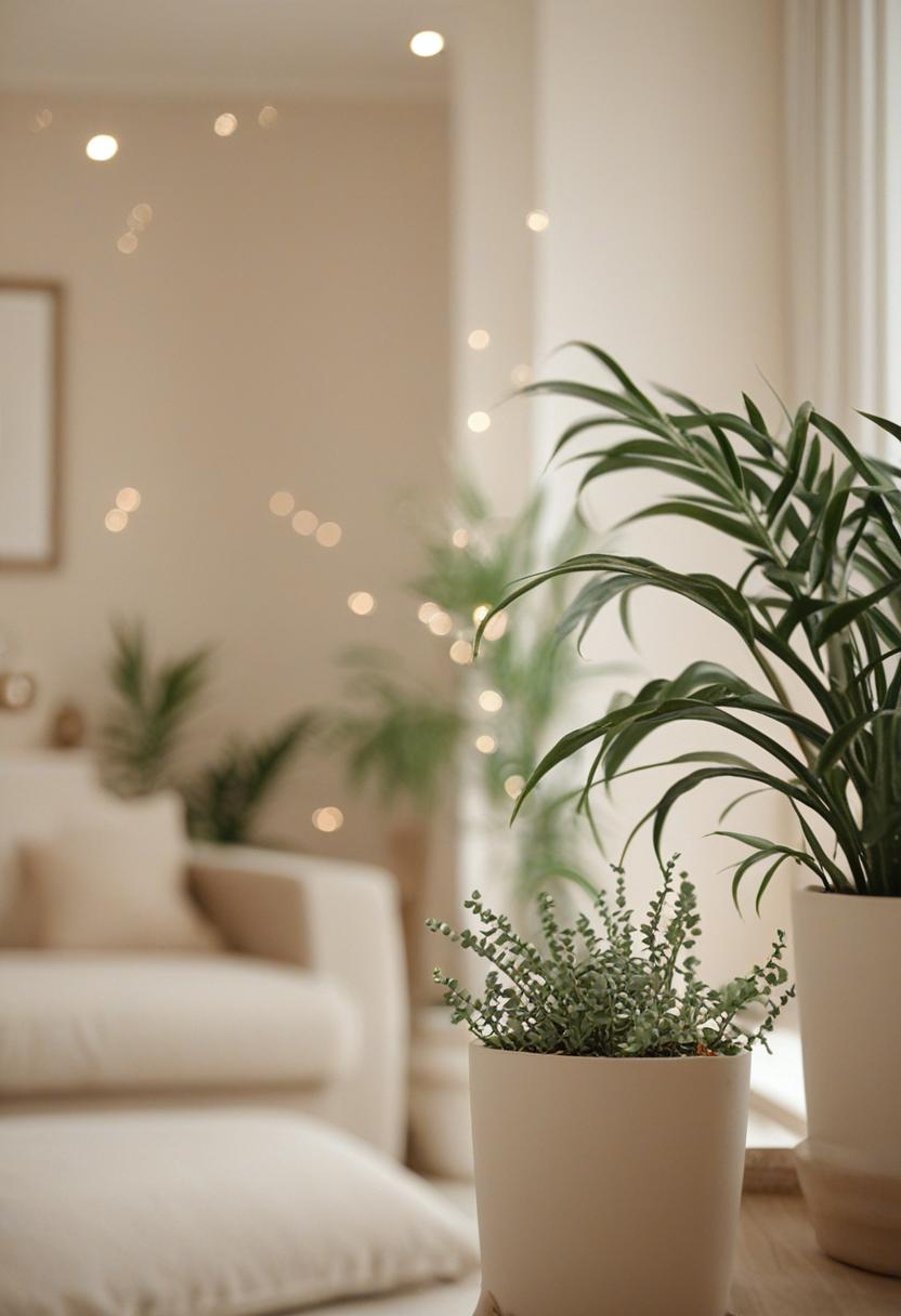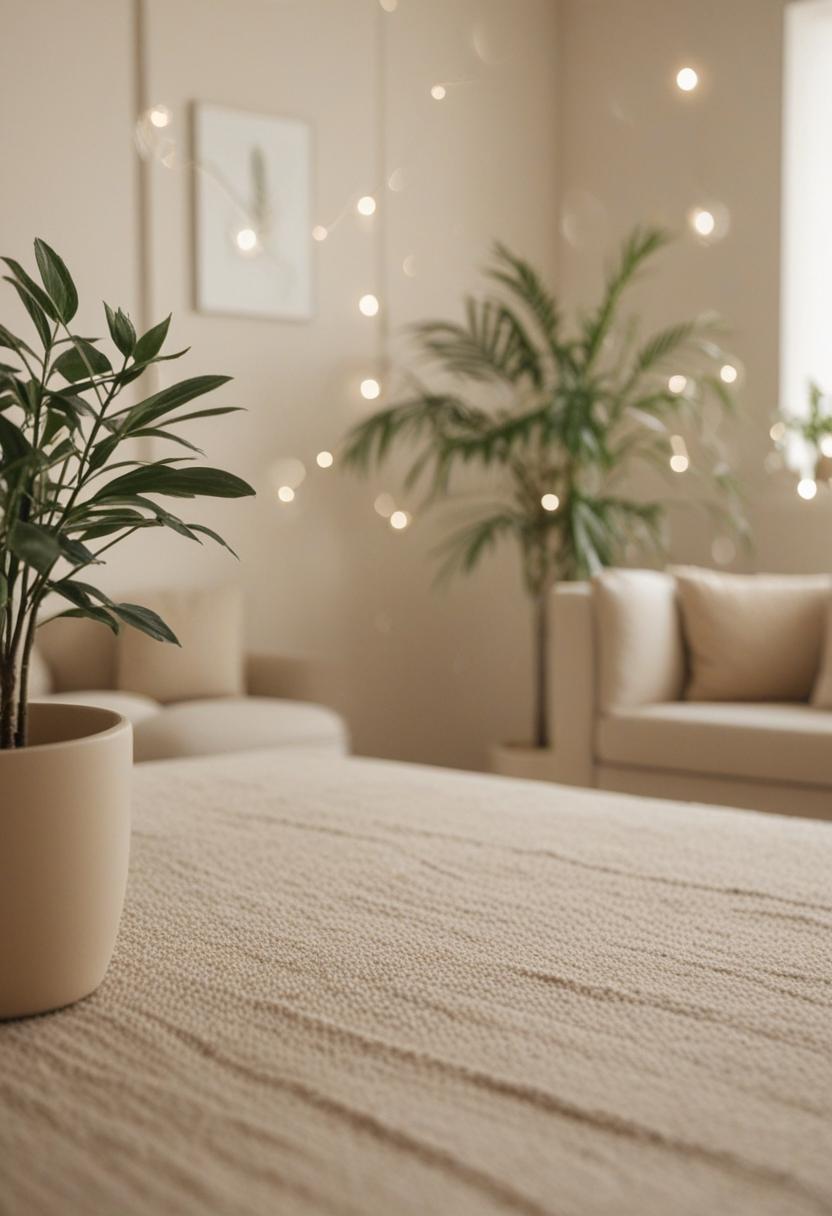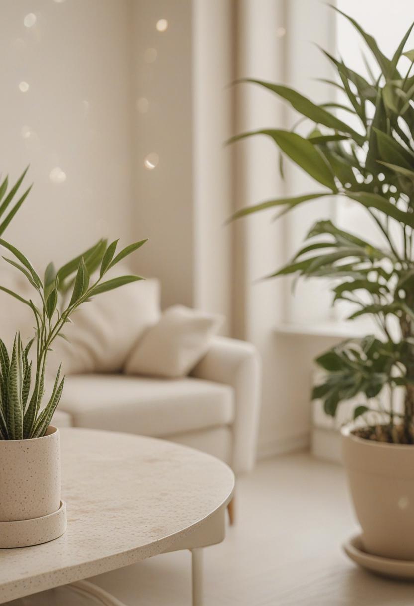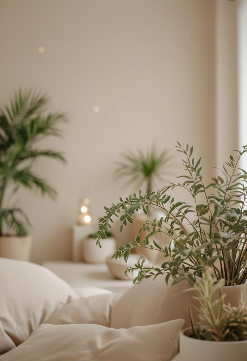 4. A serene beige aesthetic with lush green plants, soft textures, and warm lighting. Minimalist design, natural elements, and a calm, cozy atmosphere perfect for a peaceful space.