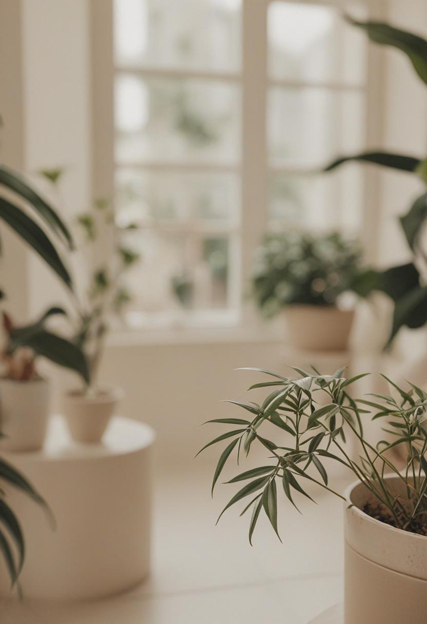 9. A serene arrangement of lush green plants in a minimalist beige setting, blending nature with simplicity. Soft textures and gentle tones create a calming, modern indoor atmosphere.