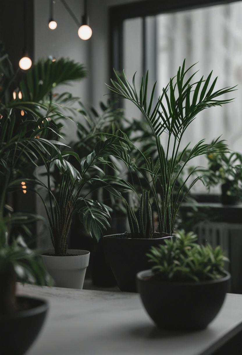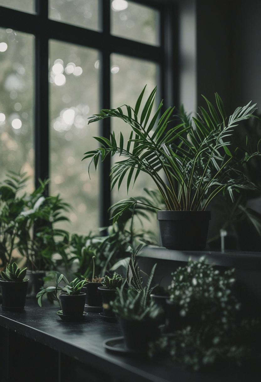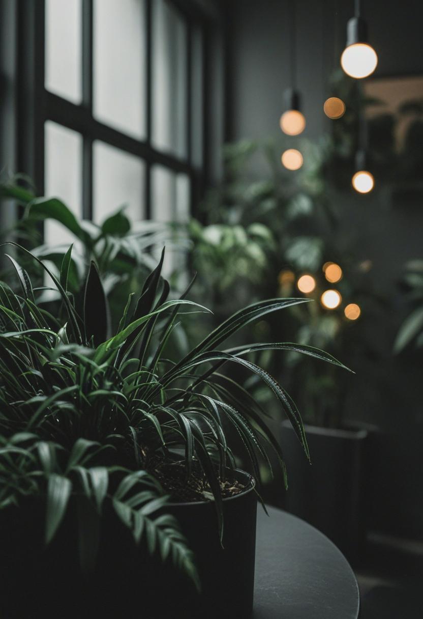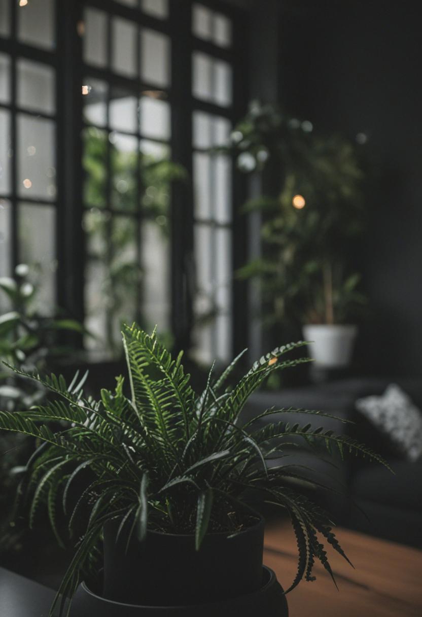 6. Dark, moody plants with deep greens and rich browns, surrounded by shadows and minimalist decor, exuding a mysterious and edgy vibe. Perfect for a gothic or moody interior style.