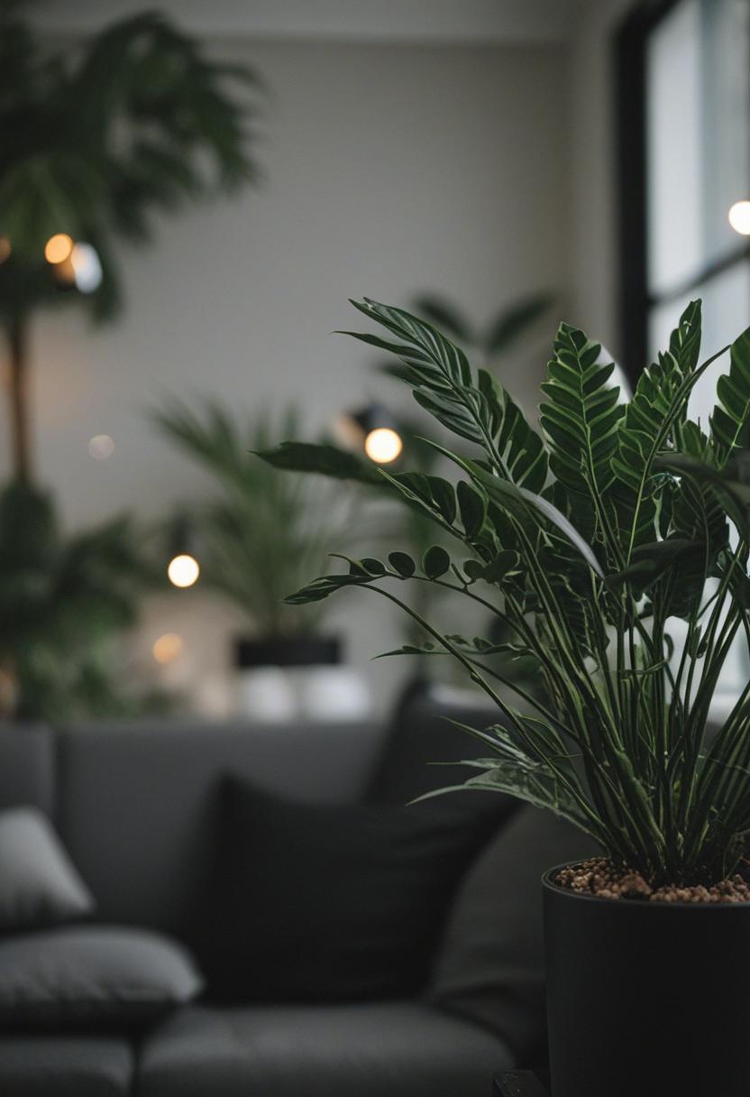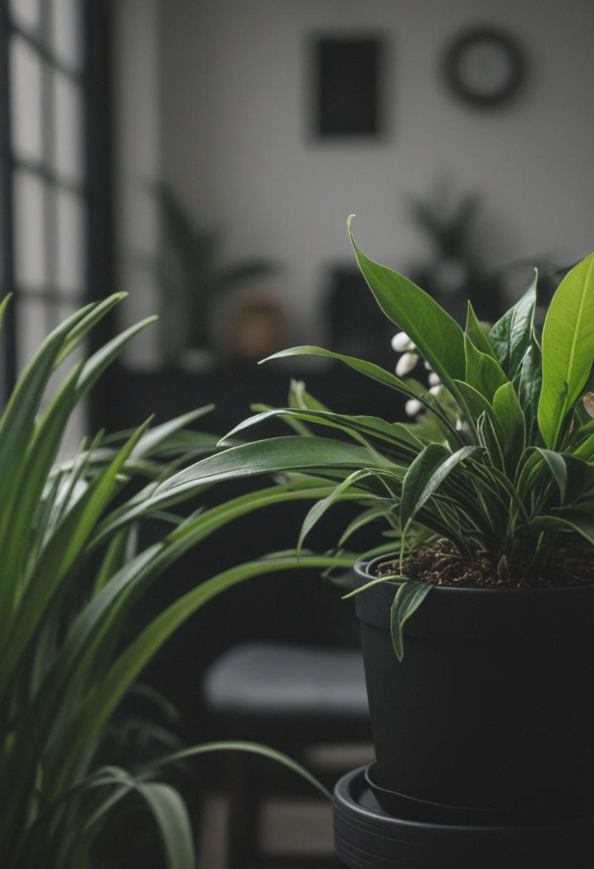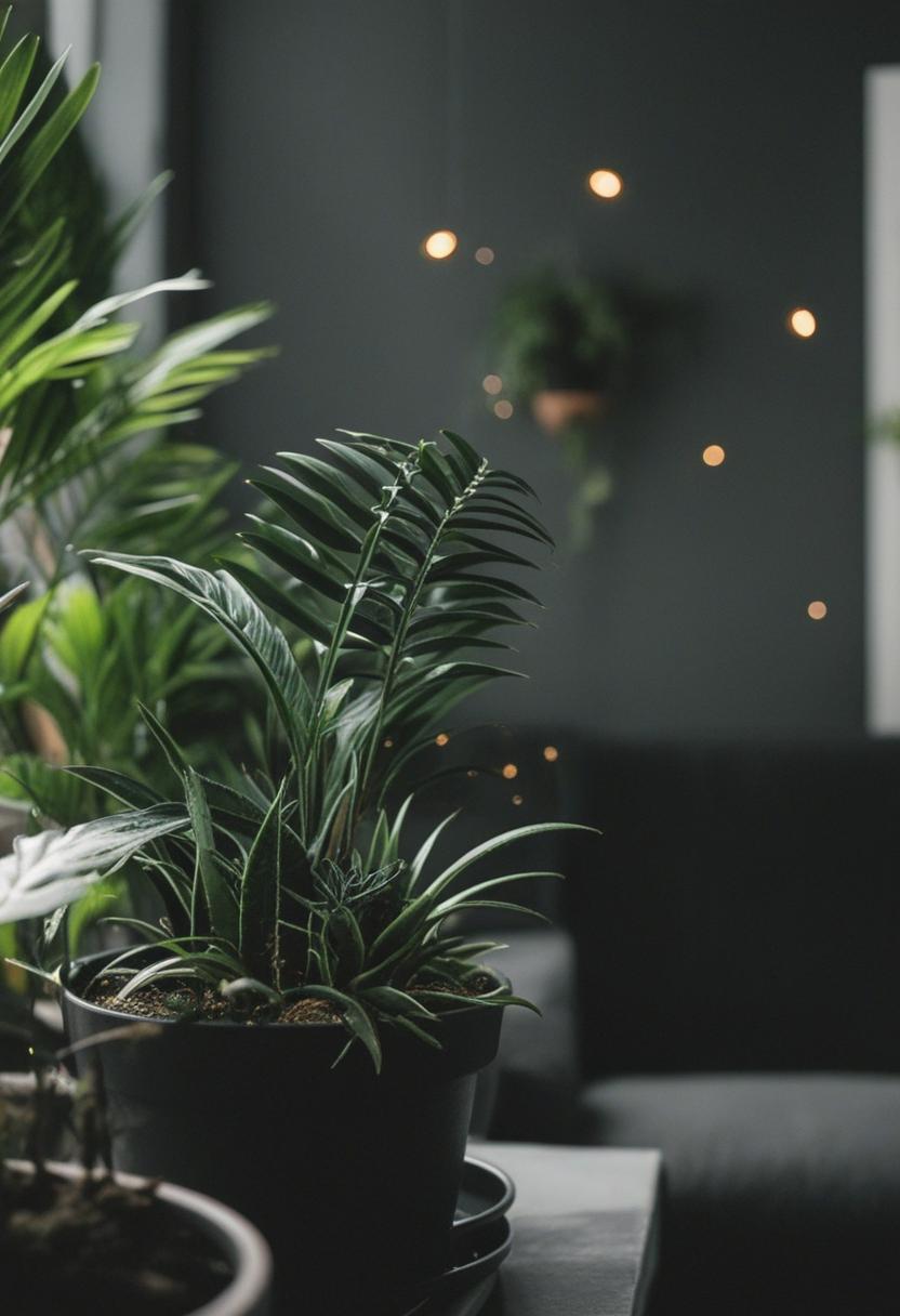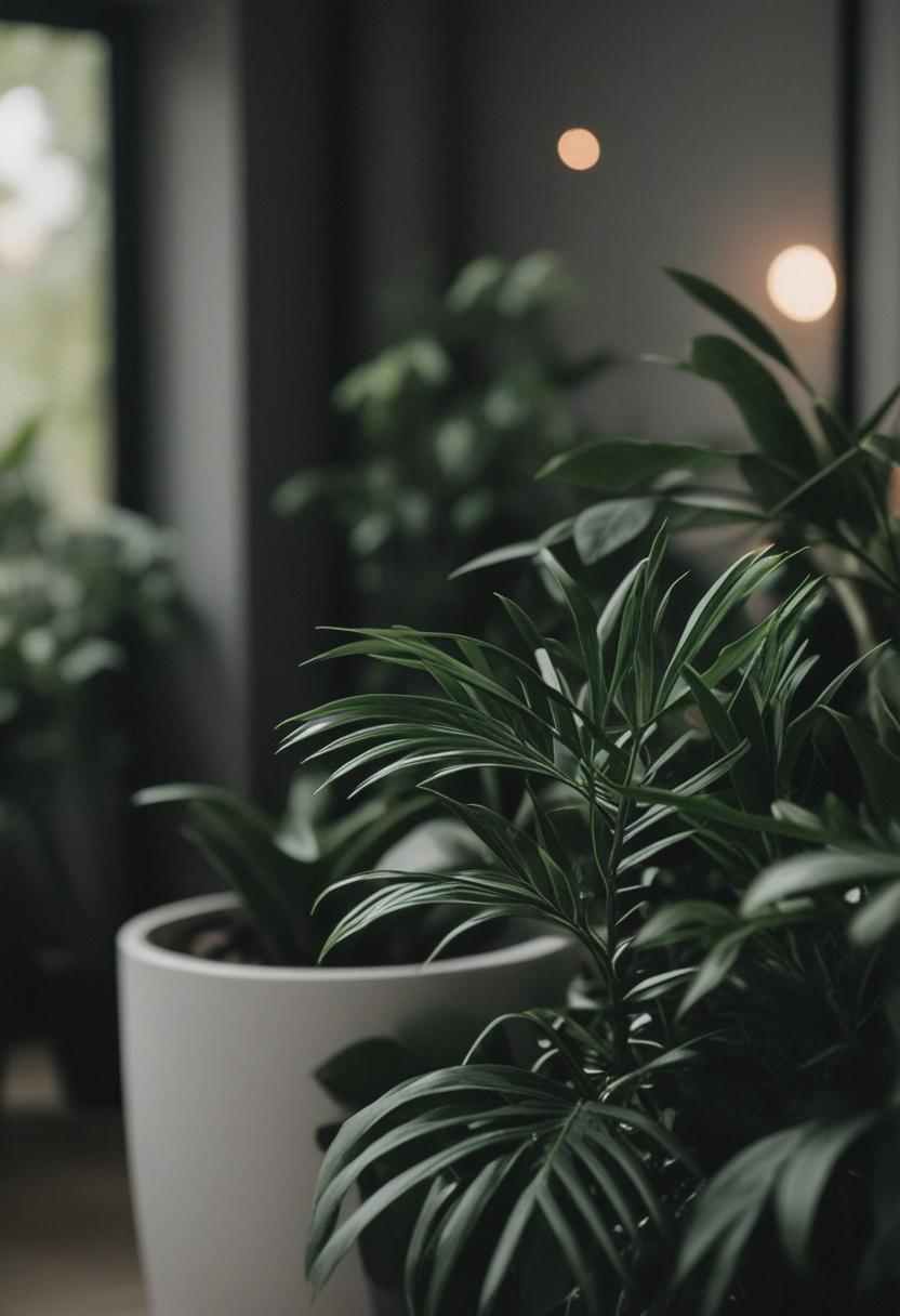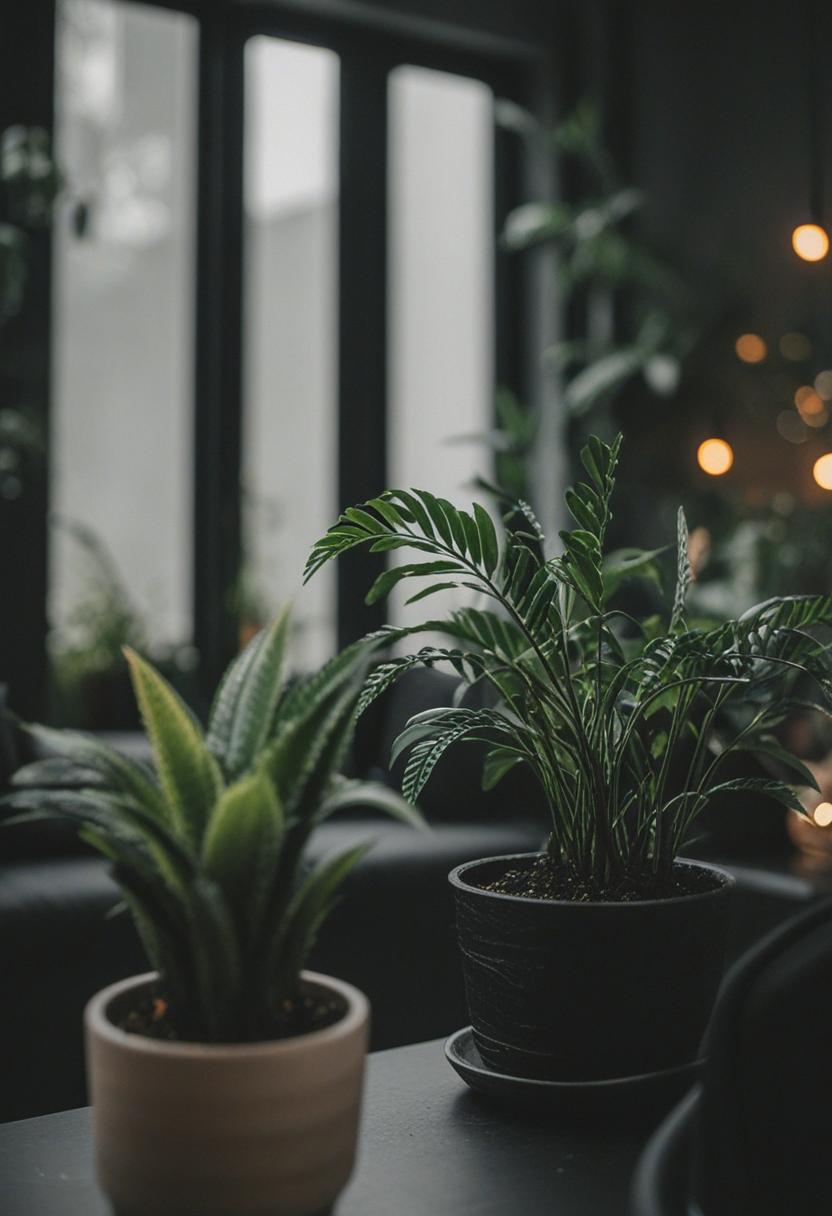6. Dark, moody plants with deep greens and rich browns, surrounded by shadows and minimalist decor, exuding a mysterious and edgy vibe. Perfect for a gothic or moody interior style.