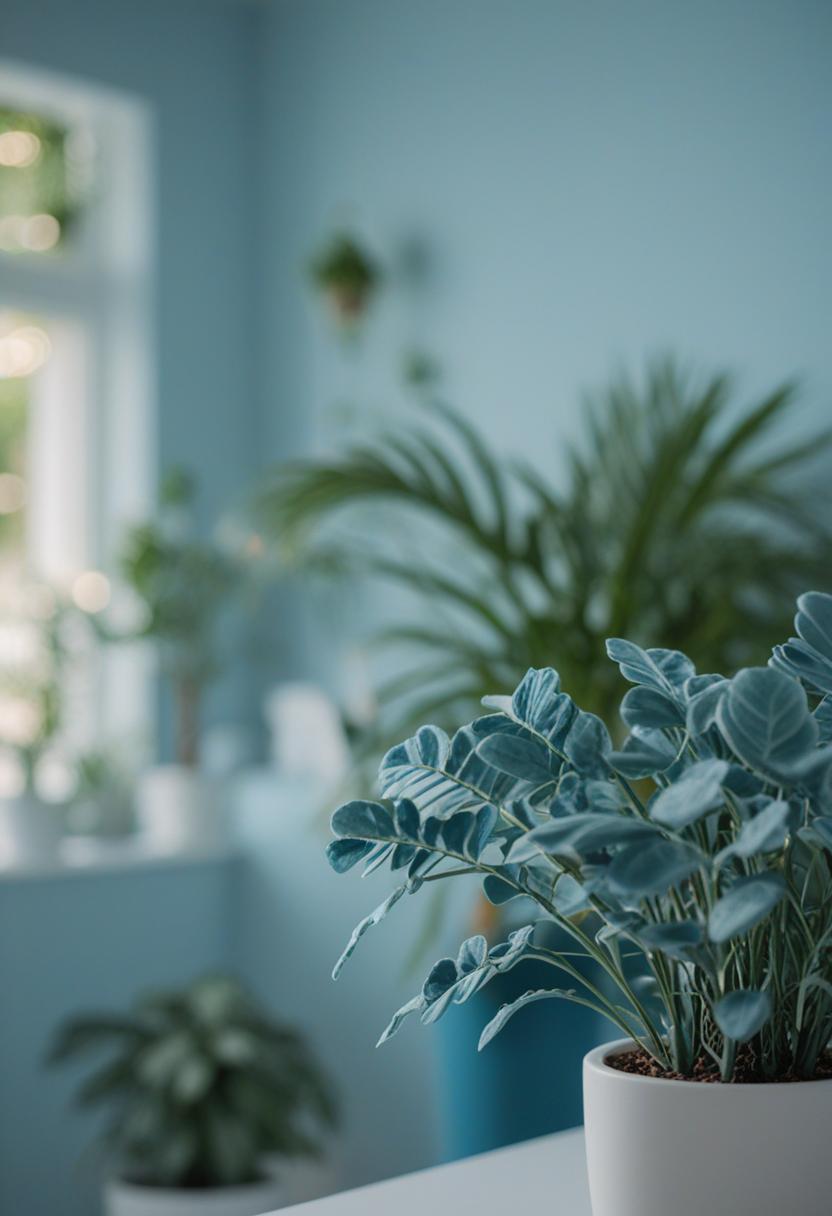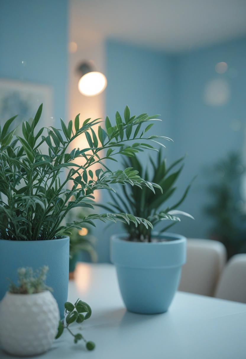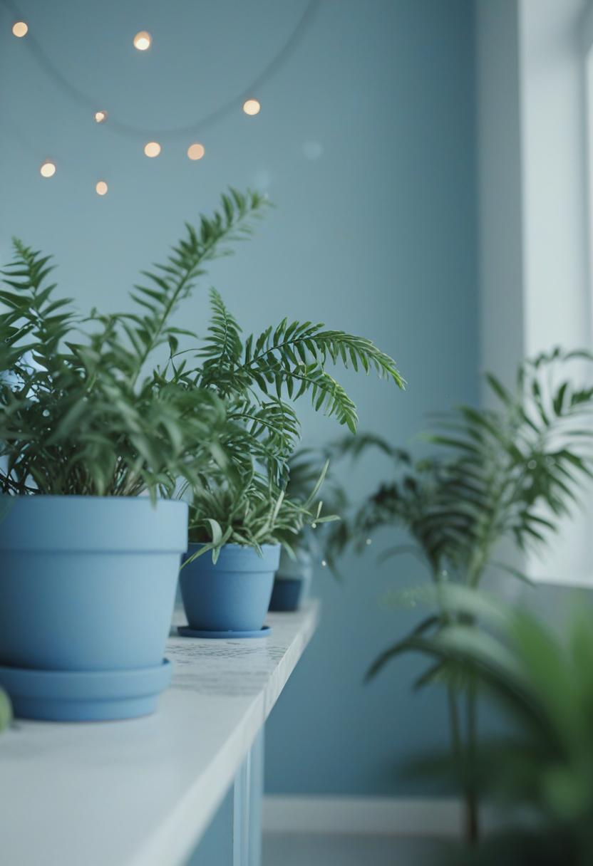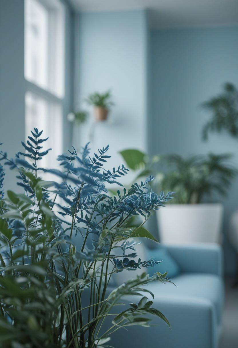 10. A serene scene featuring blue-hued plants in a minimalist setting, evoking a calm and calming blue aesthetic. Soft tones and natural textures create a peaceful, modern interior vibe.