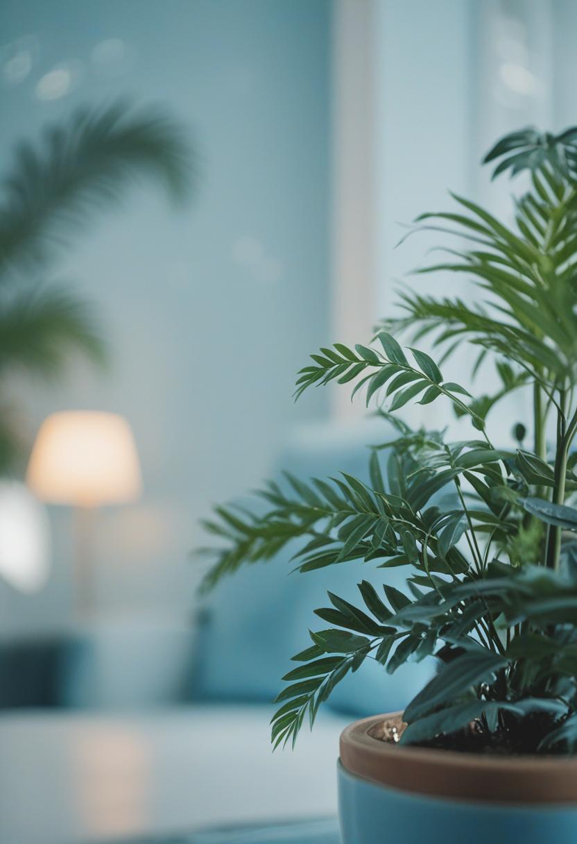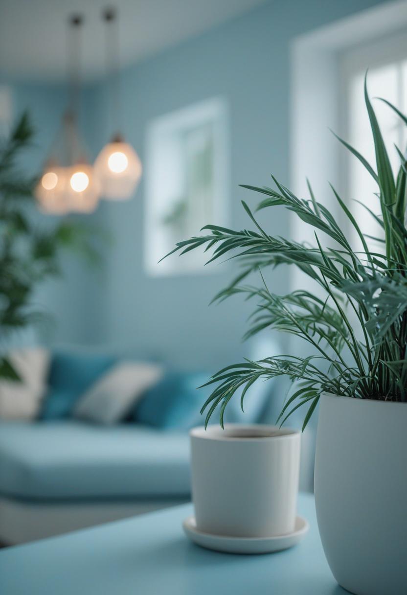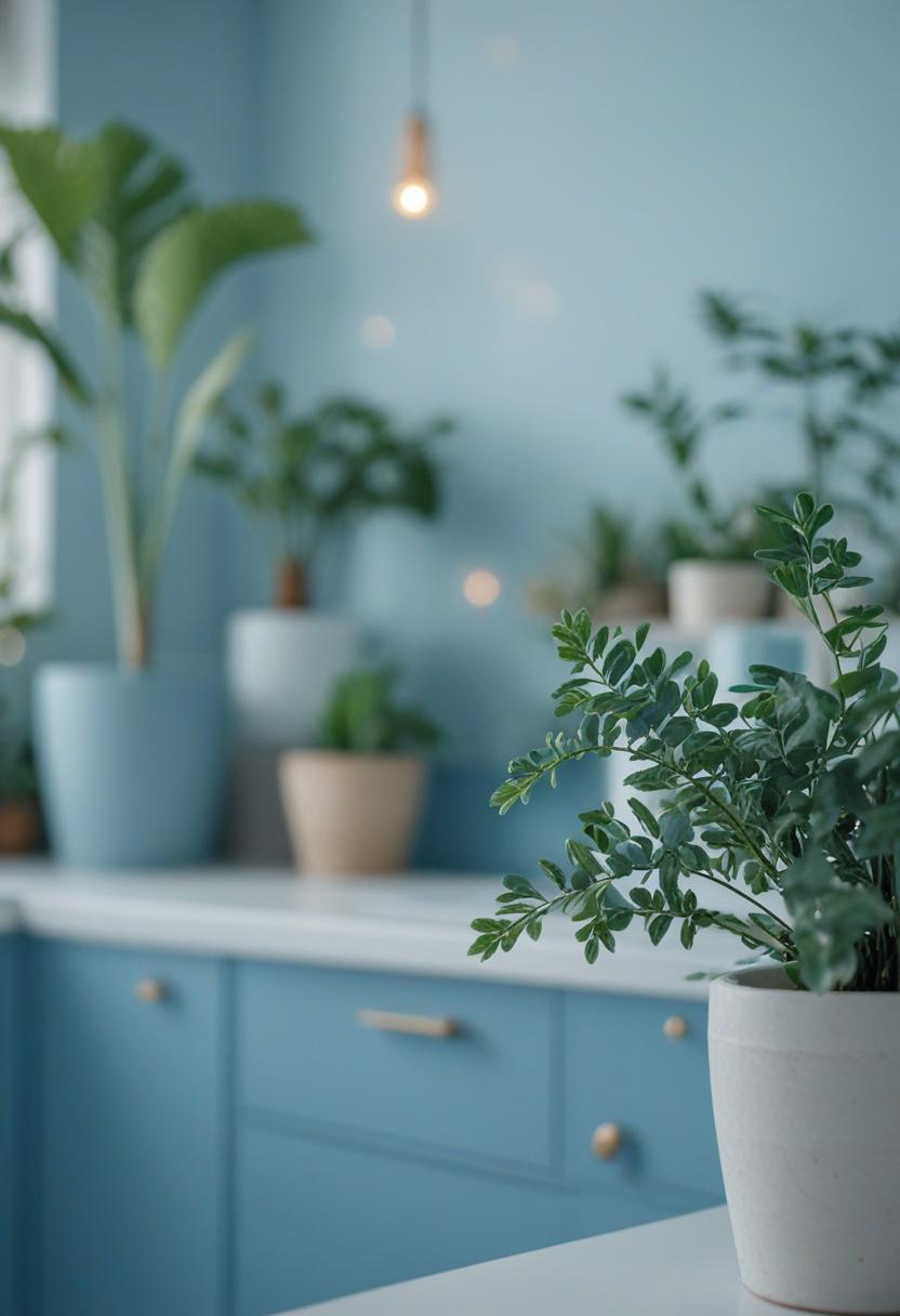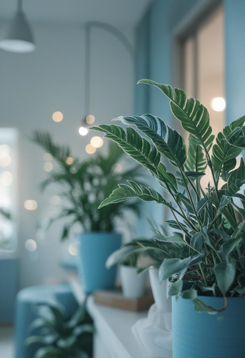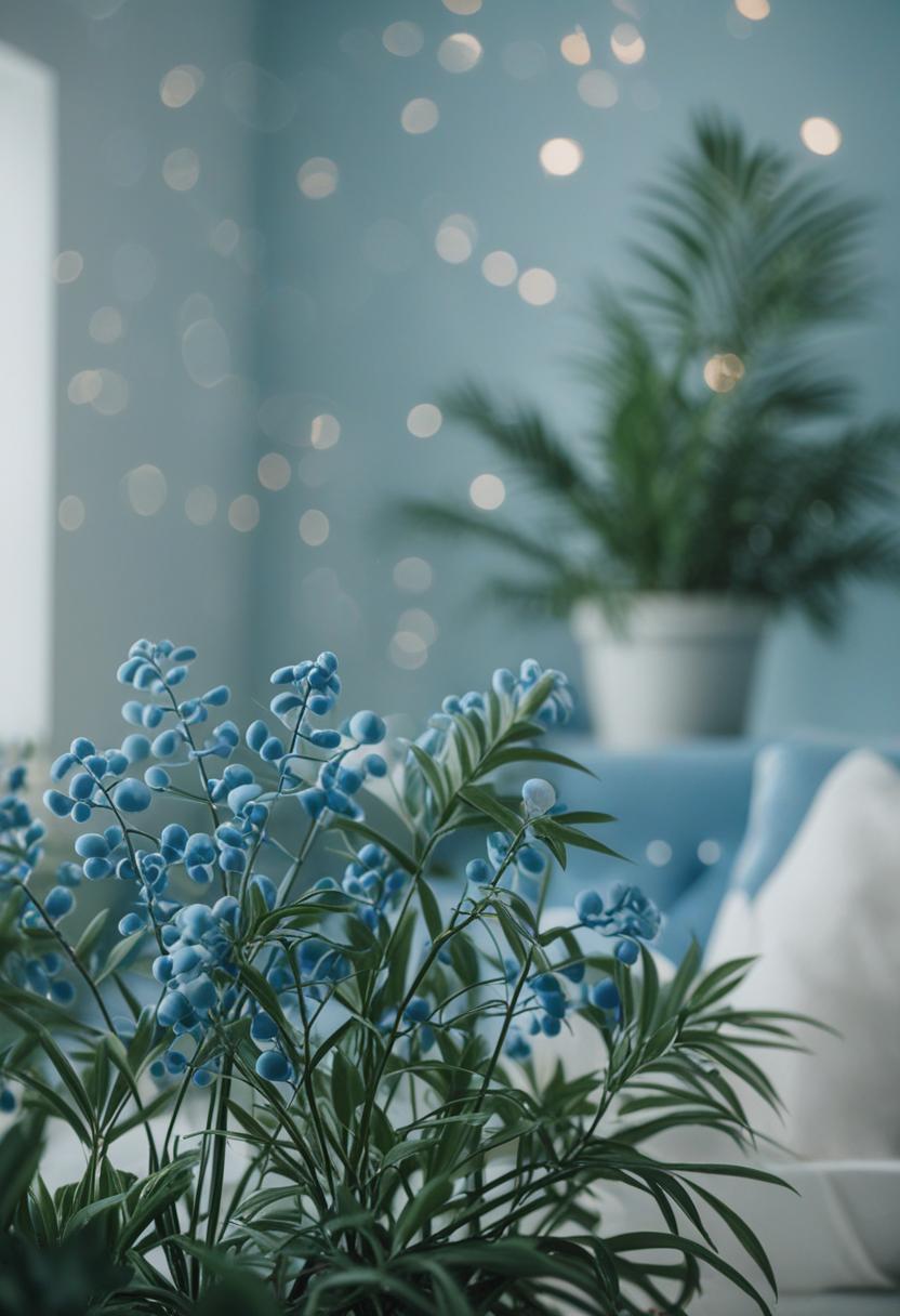 10. A serene scene featuring blue-hued plants in a minimalist setting, evoking a calm and calming blue aesthetic. Soft tones and natural textures create a peaceful, modern interior vibe.