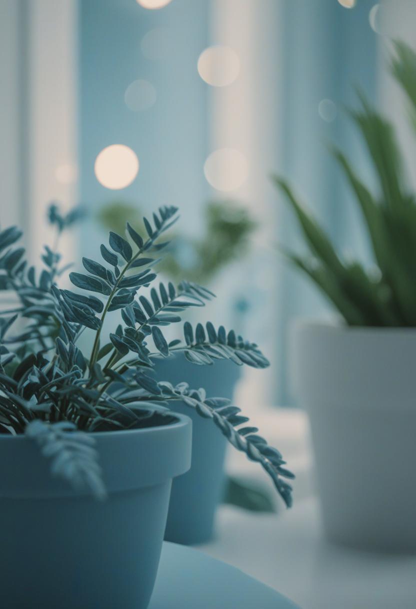 5. A serene arrangement of blue-hued plants in a minimalist setting, evoking a calming, modern blue aesthetic. Soft tones and clean lines create a peaceful, tranquil atmosphere.