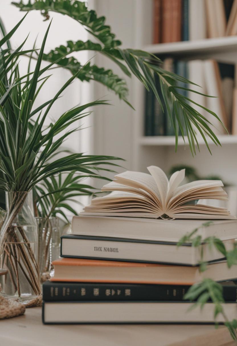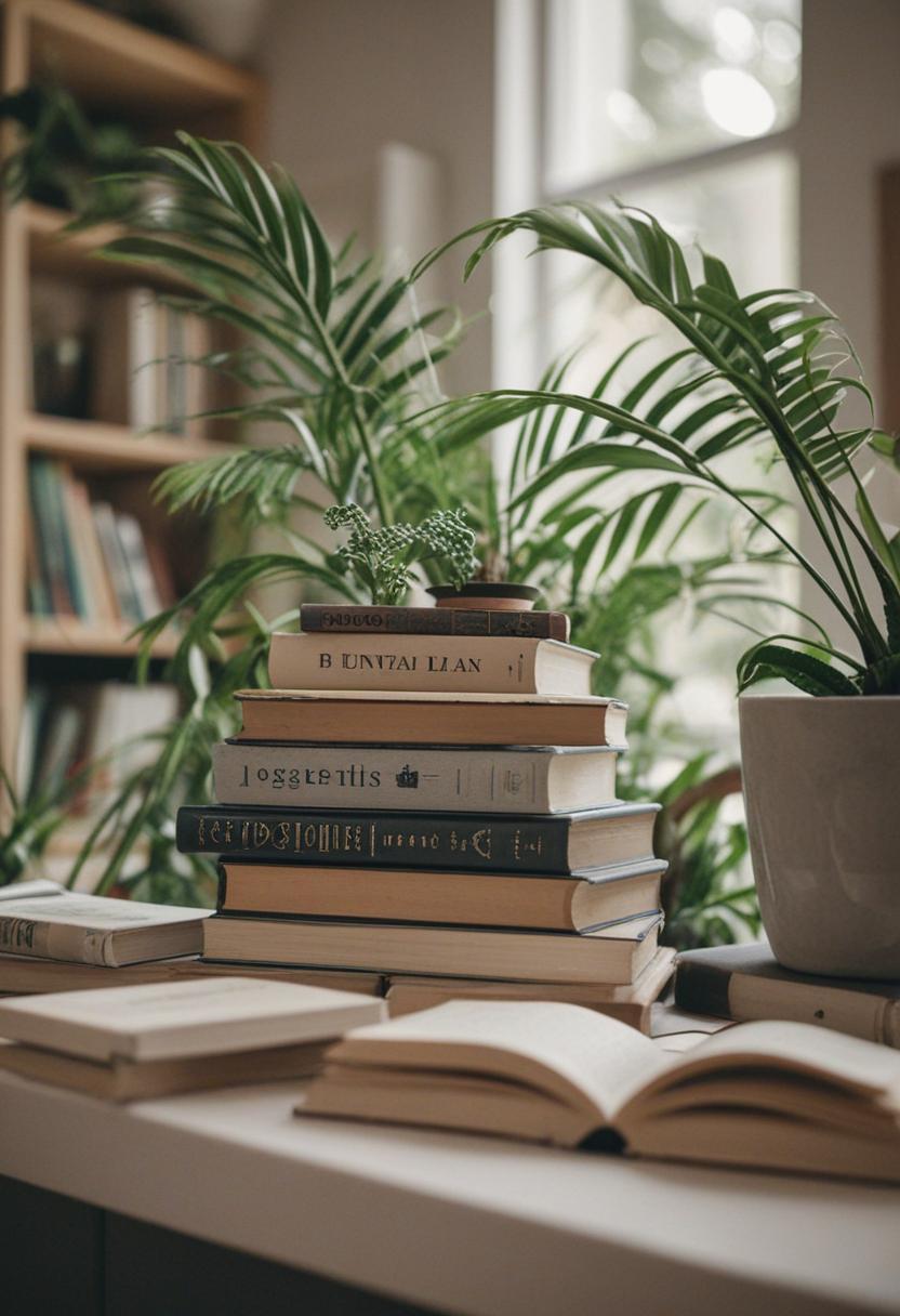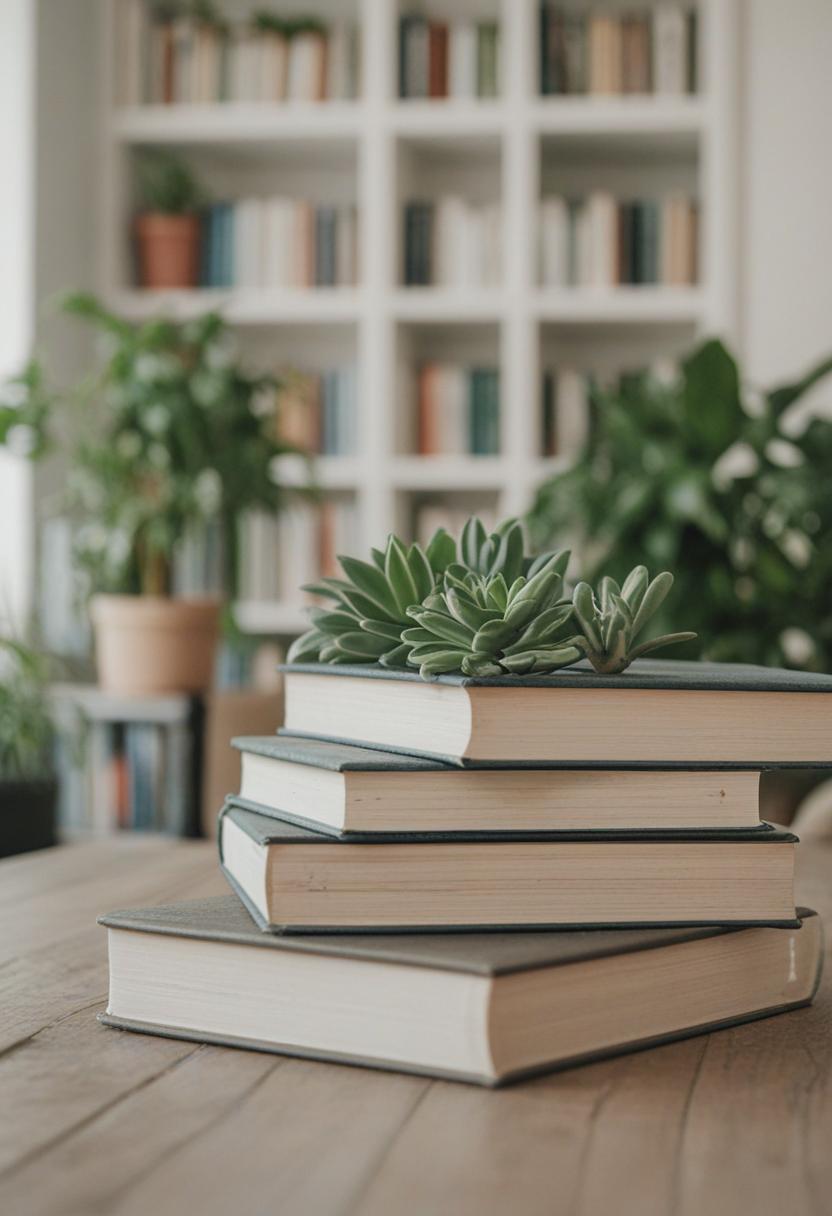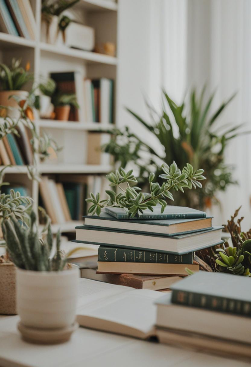 The fusion of books and plants creates a serene and inspiring aesthetic that blends knowledge with nature.