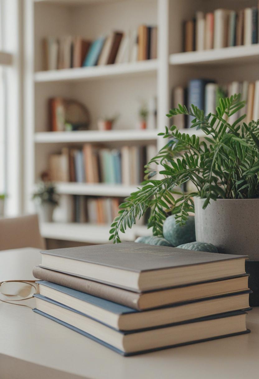 4. A cozy corner filled with books, plants, and a warm aesthetic. Shelves overflow with novels, while greenery adds life and tranquility. Perfect for a reading nook or a peaceful study space.