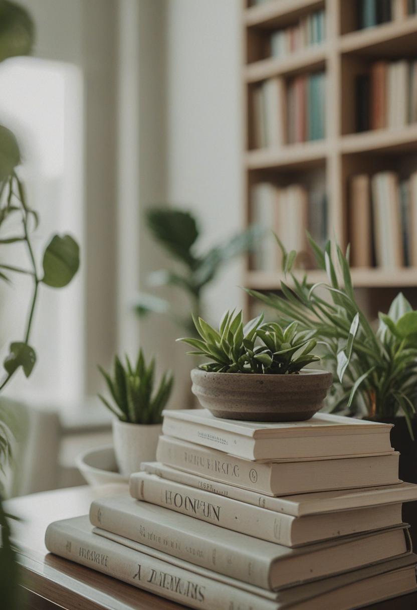 7. A cozy corner filled with books, plants, and a warm, calming atmosphere. The image captures a serene, book-lover's space where nature and literature blend harmoniously.