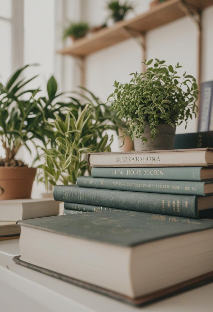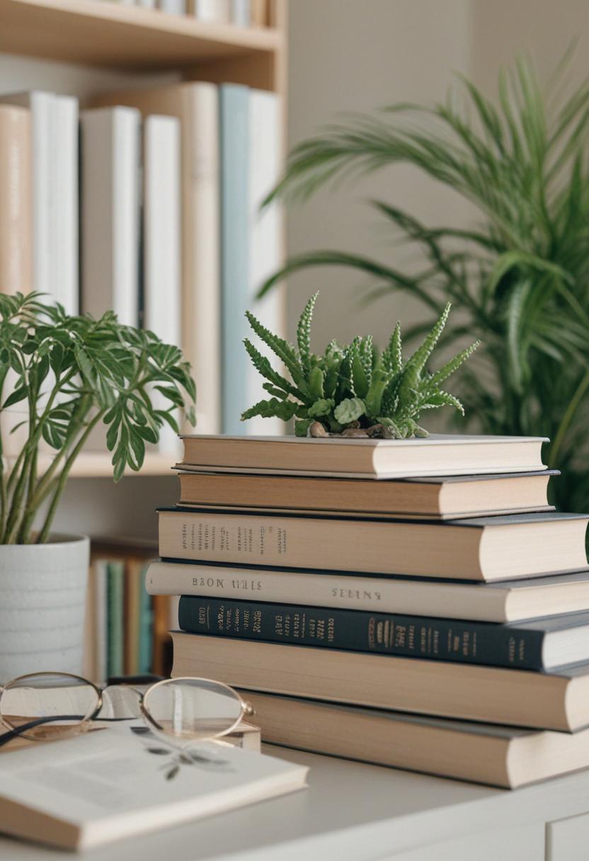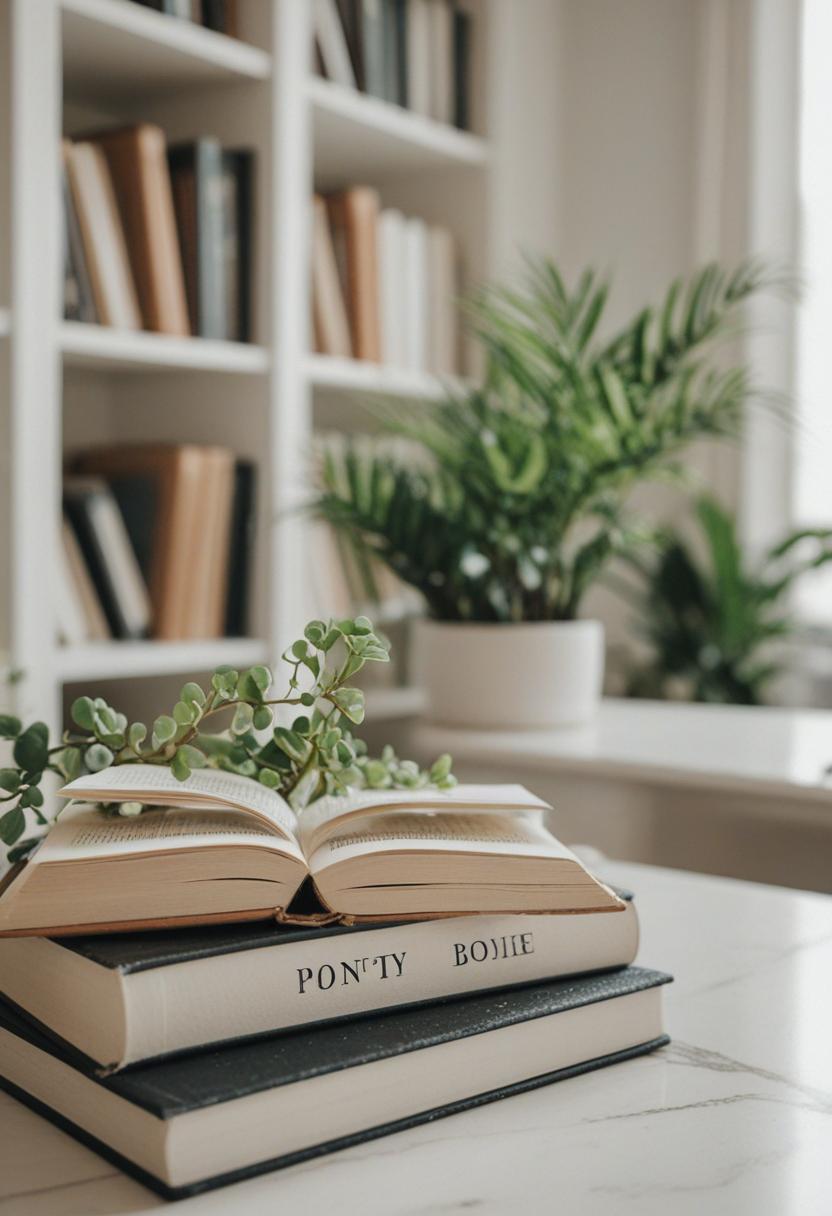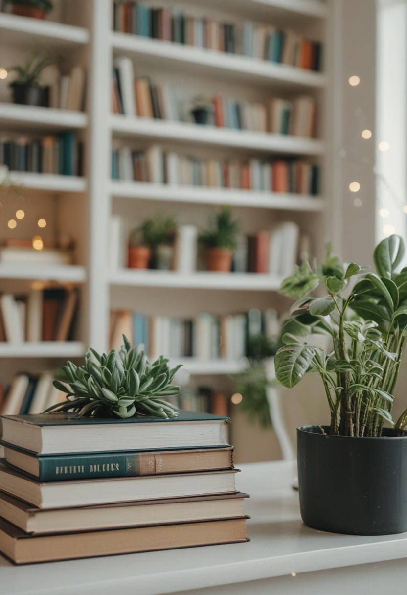 6. A cozy corner filled with books, plants, and a warm aesthetic. Shelves overflow with novels, while greenery adds a touch of nature. The scene exudes calm and creativity, perfect for a reading nook or study space.