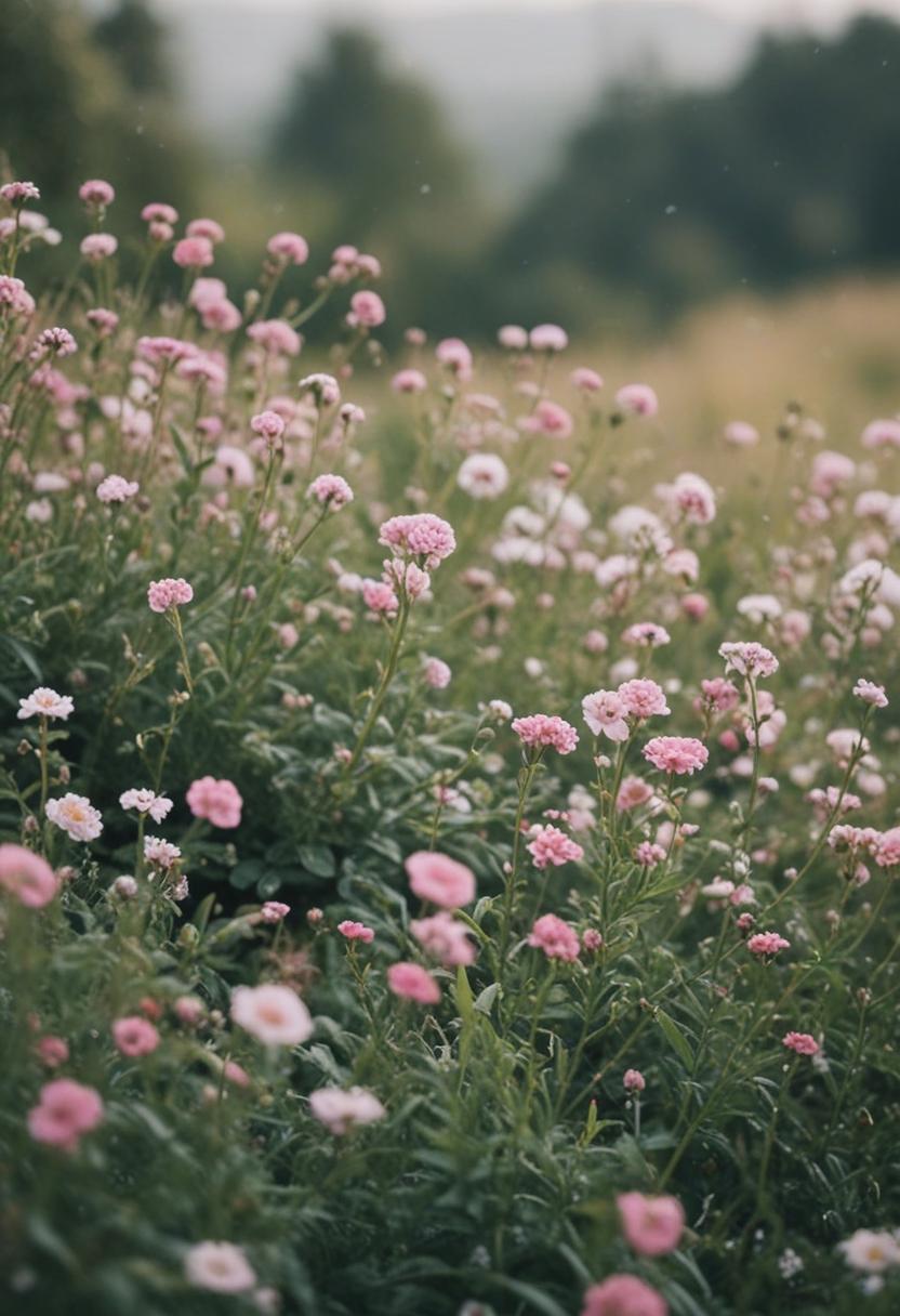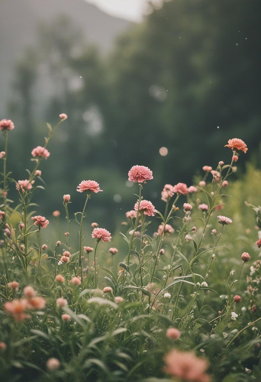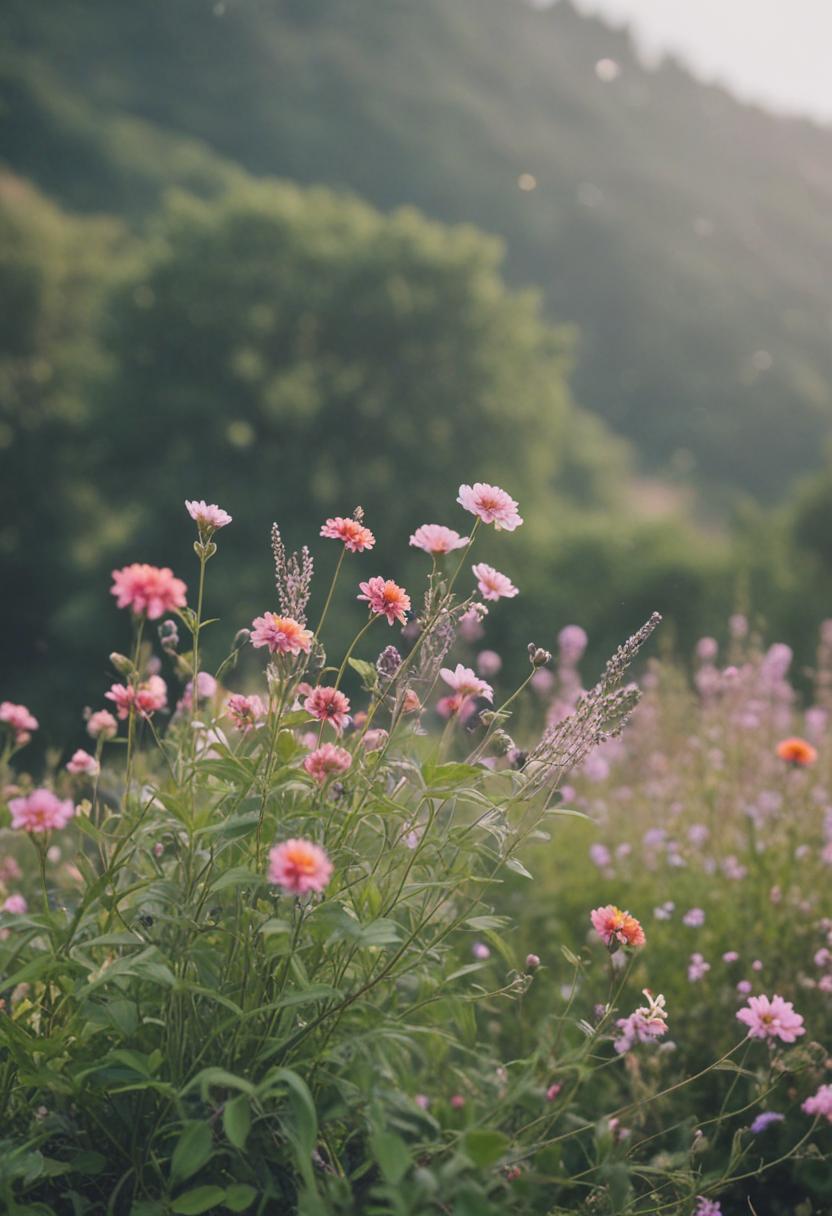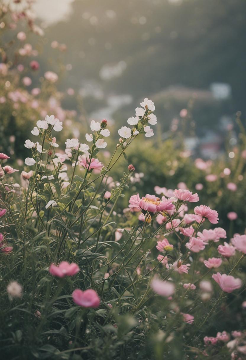 1. A vibrant arrangement of blooming flowers and green plants, exuding a serene and natural beauty. Soft pastel colors and lush foliage create a calming, aesthetic atmosphere perfect for relaxation and inspiration.