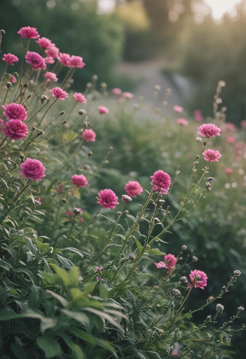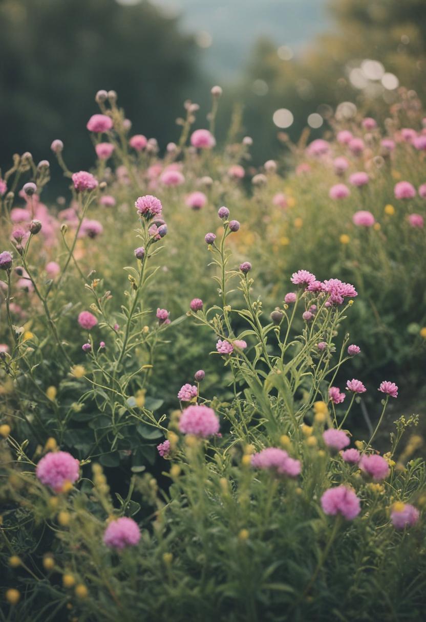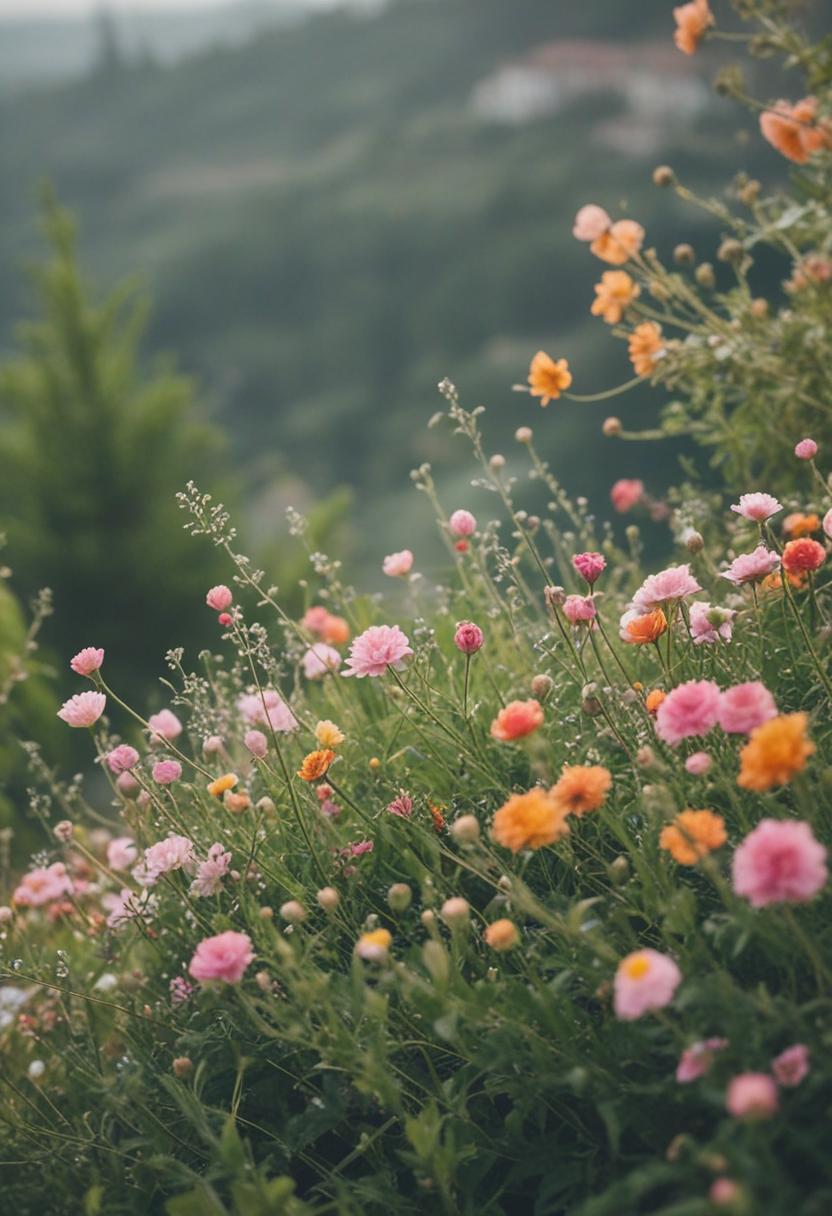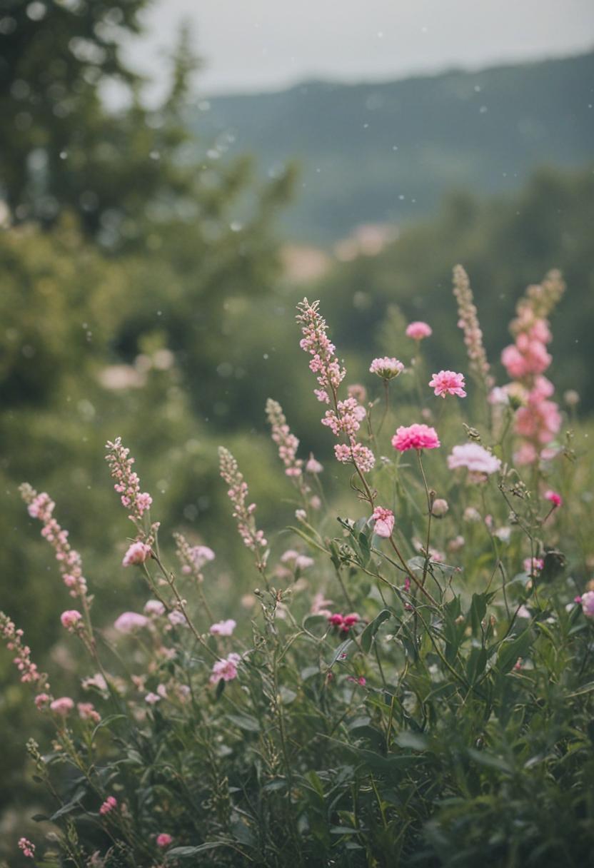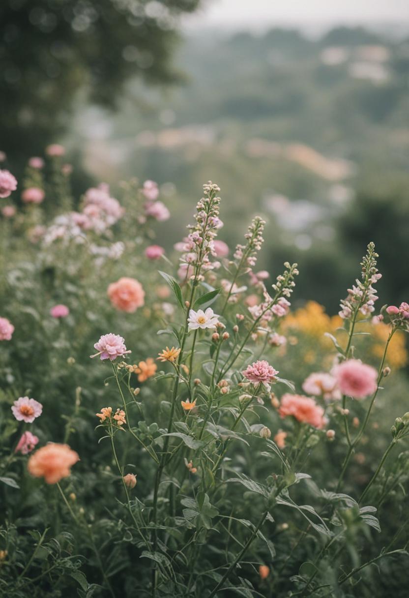 1. A vibrant arrangement of blooming flowers and green plants, exuding a serene and natural beauty. Soft pastel colors and lush foliage create a calming, aesthetic atmosphere perfect for relaxation and inspiration.