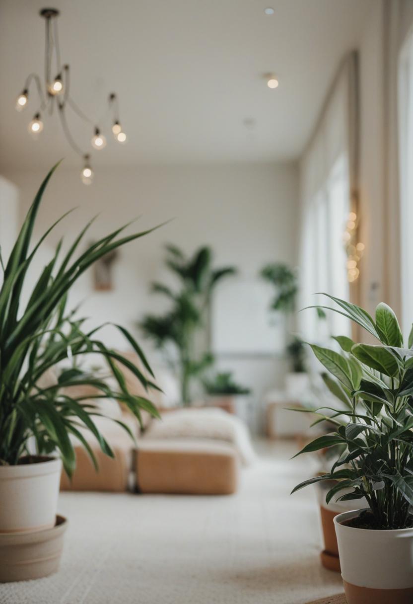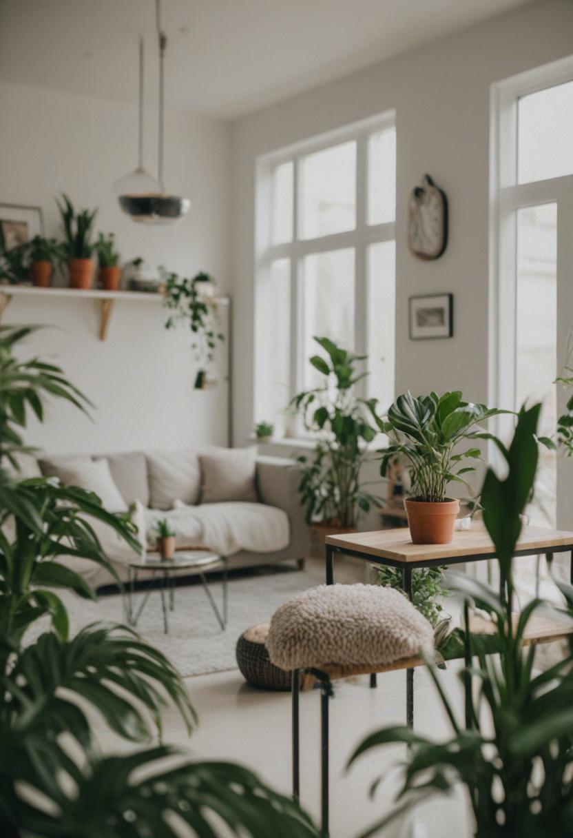 5. A cozy living space adorned with lush green plants, creating a serene and natural ambiance. Perfect blend of home decor and plant life, enhancing both style and air quality. Ideal for a peaceful, plant-filled interior.