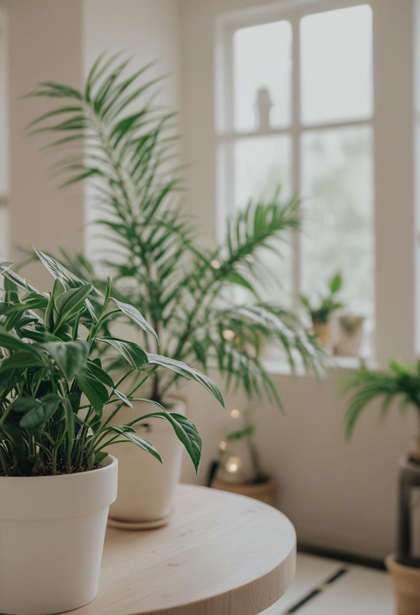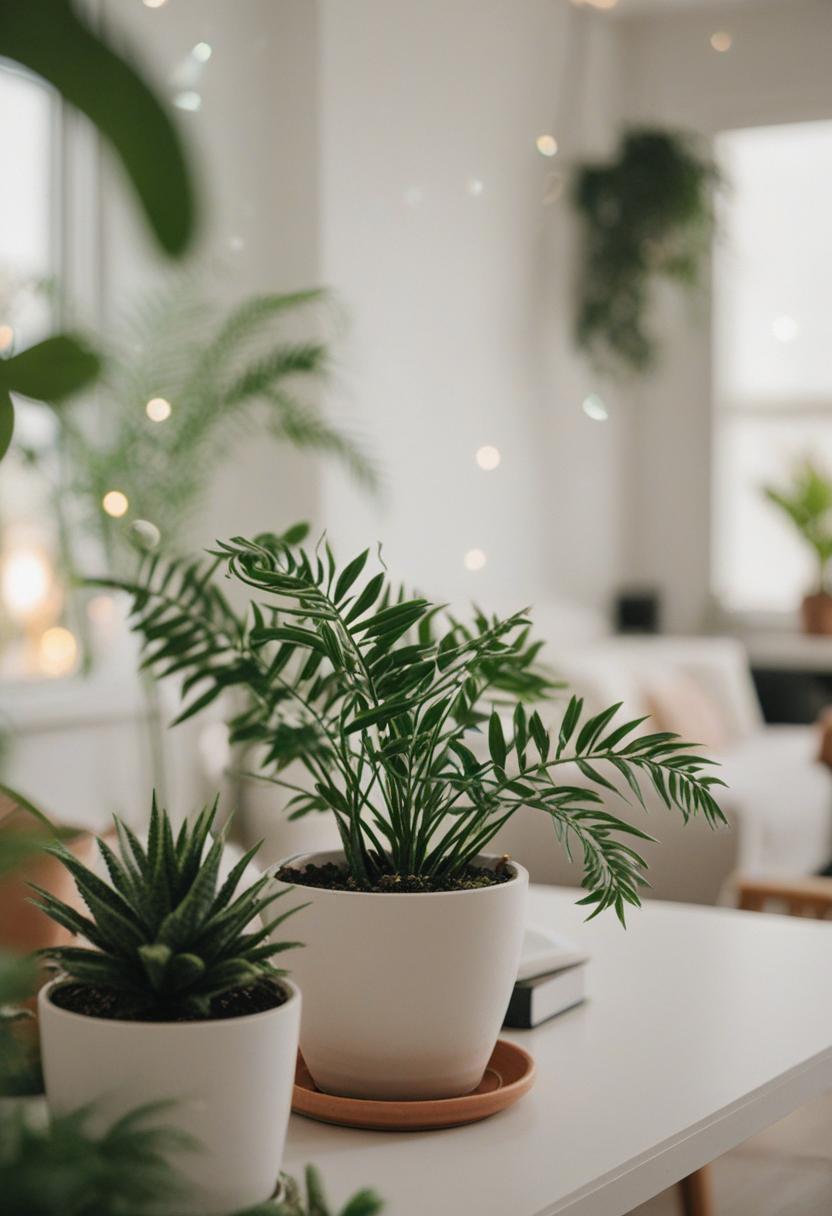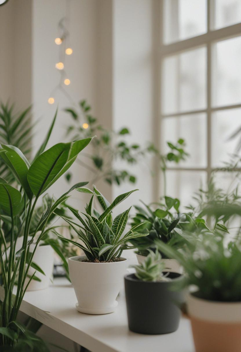 3. A serene room filled with lush green plants, soft lighting, and cozy textures, creating a calming love aesthetic vibe.