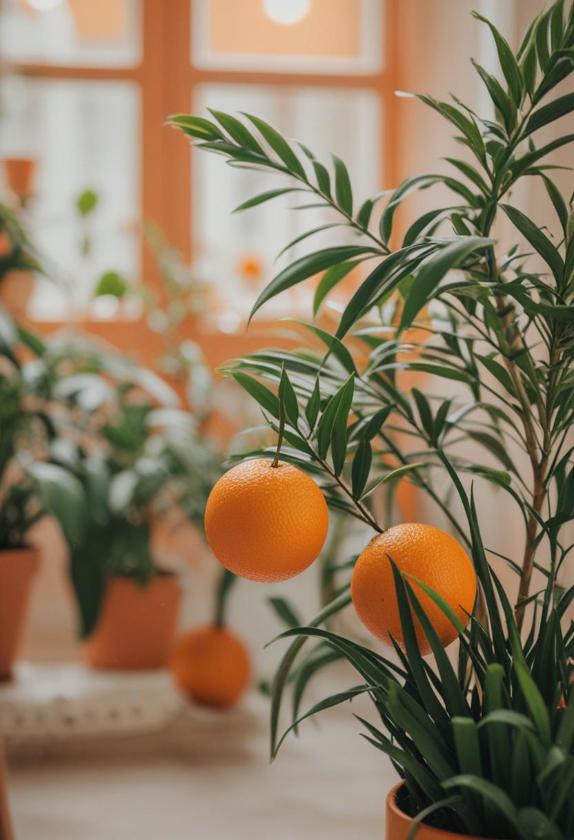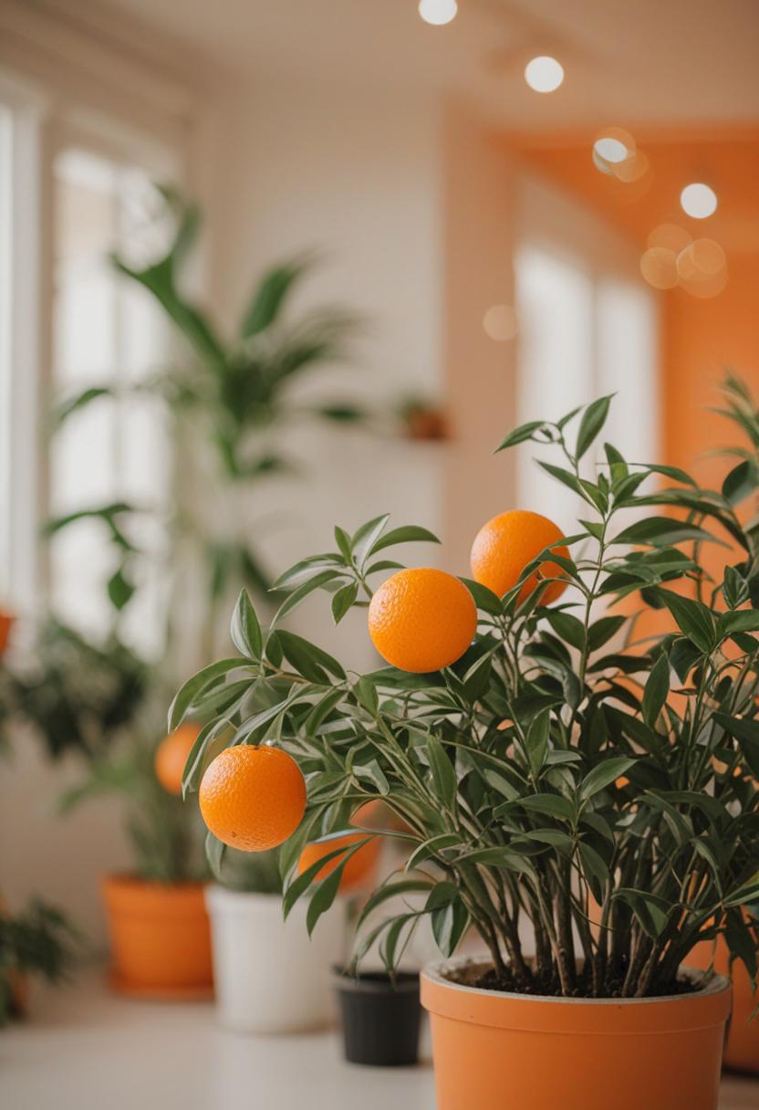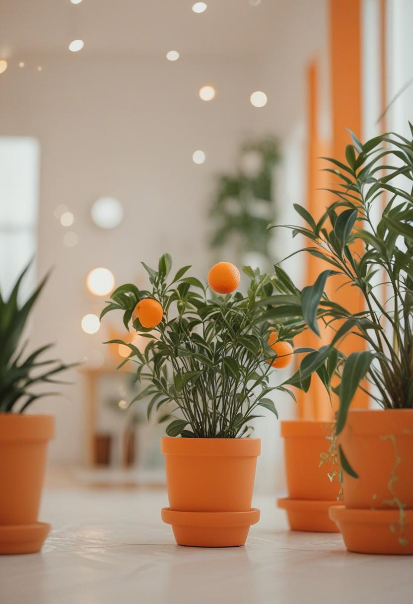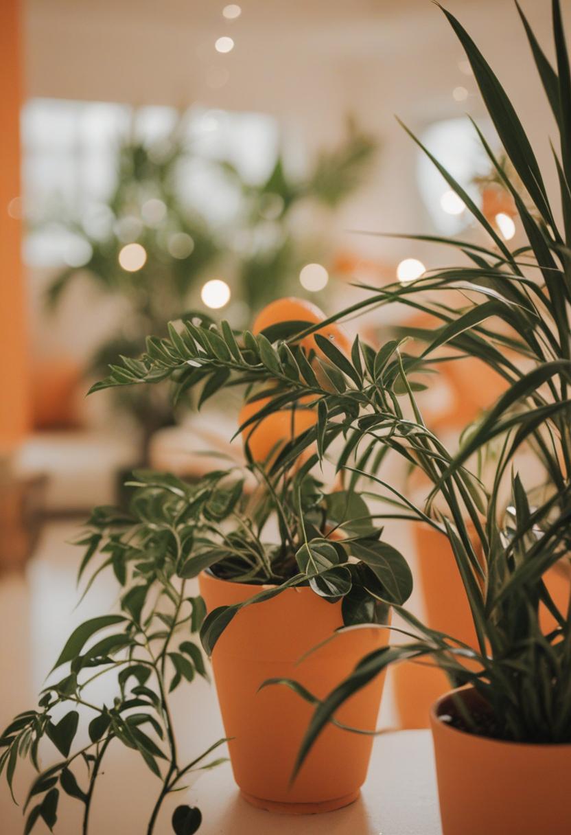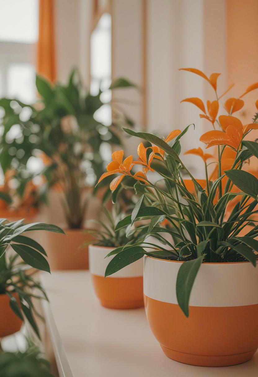 4. Vibrant orange-hued plants in a cozy, warm setting. Soft lighting highlights lush foliage and blooming flowers. A perfect blend of nature and comfort, ideal for a calming, stylish interior space.
