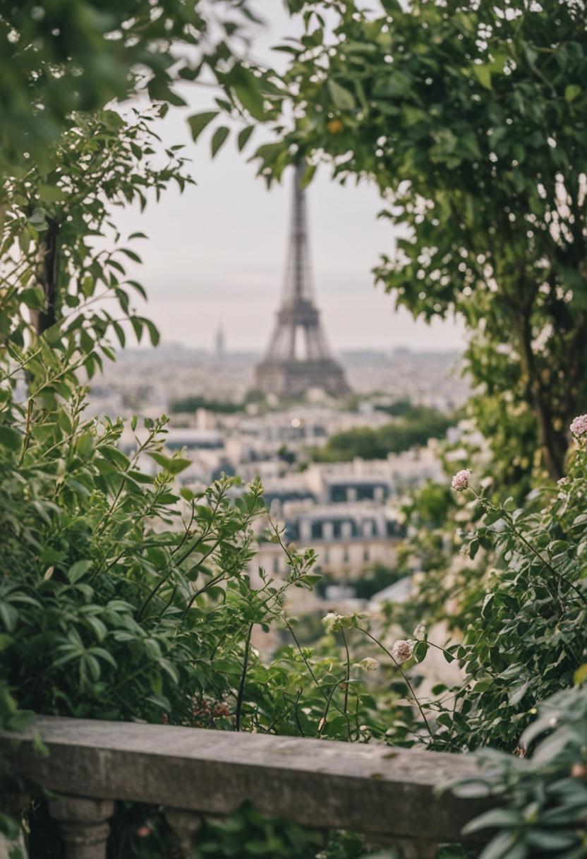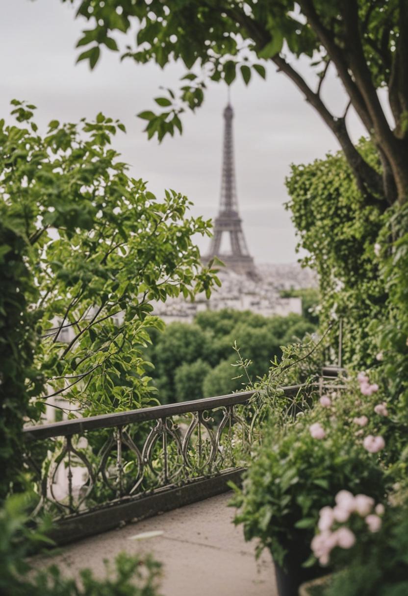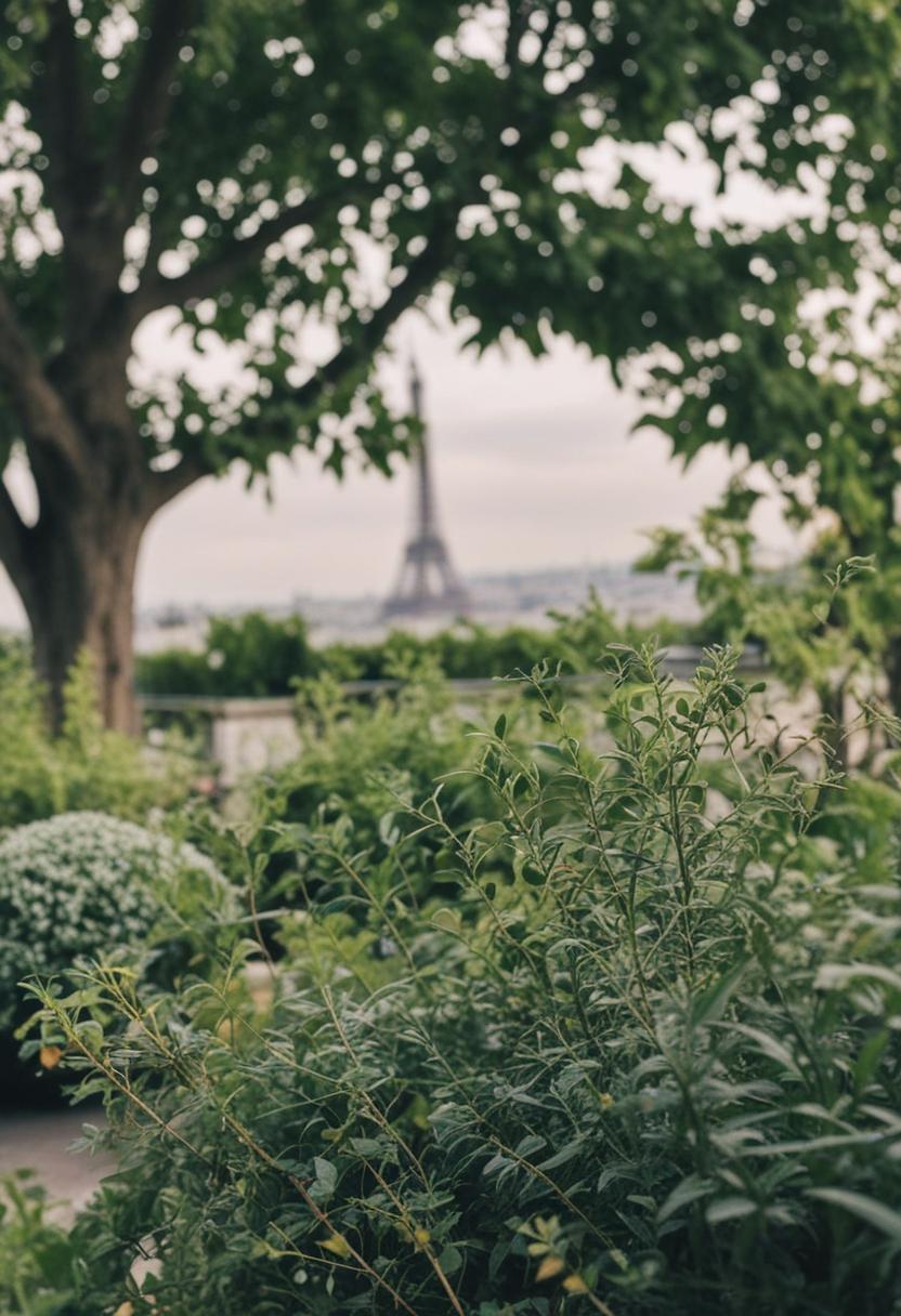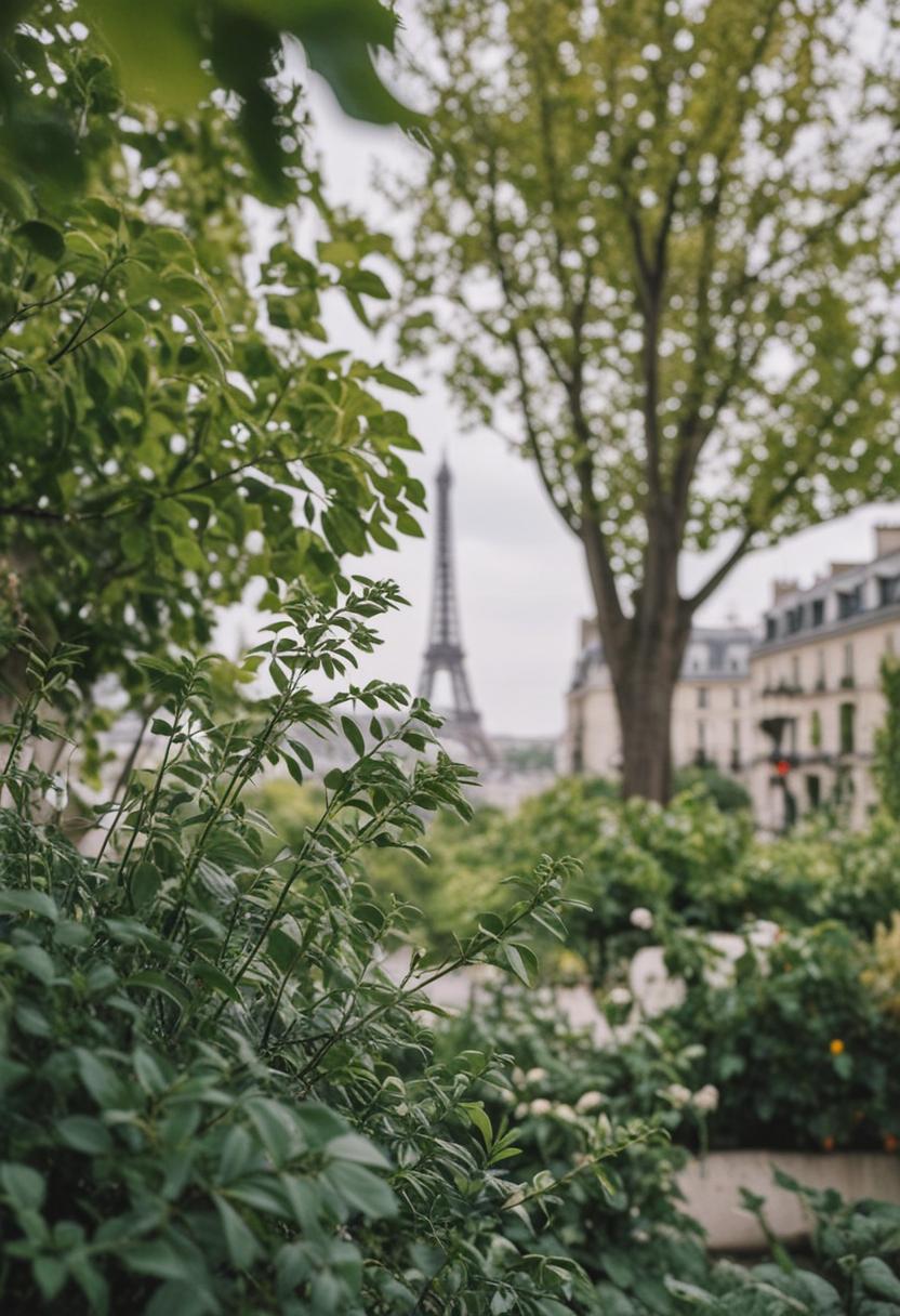 9. A serene Parisian scene featuring lush greenery, vibrant plants, and natural elements, capturing the city's timeless elegance and connection to nature.