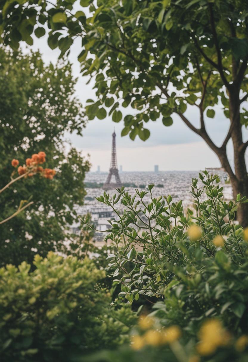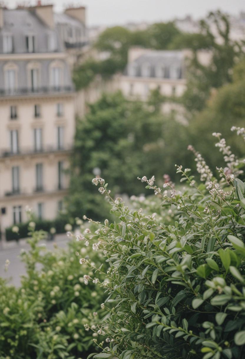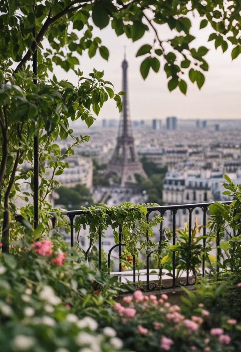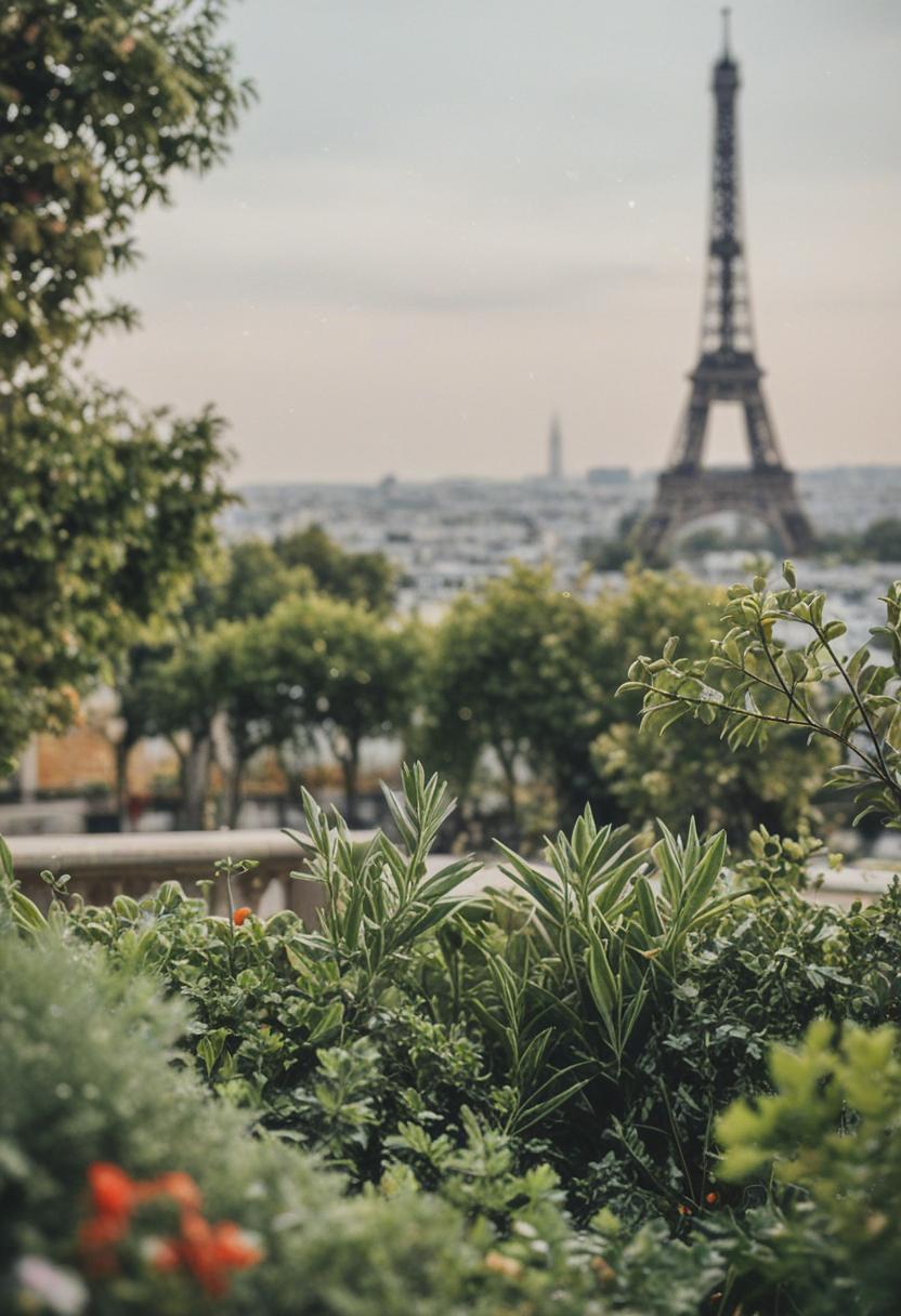 9. A serene Parisian scene featuring lush greenery, vibrant plants, and natural elements, capturing the city's timeless elegance and connection to nature.