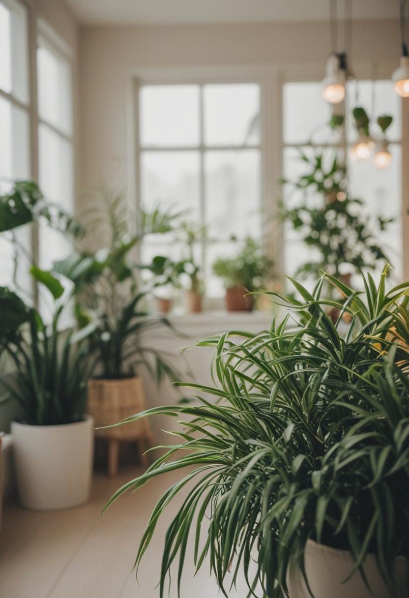 1. A serene arrangement of lush, aesthetic plants in a modern indoor setting, blending nature with design. Vibrant greens and soft textures create a calming, stylish atmosphere perfect for a minimalist or bohemian space.