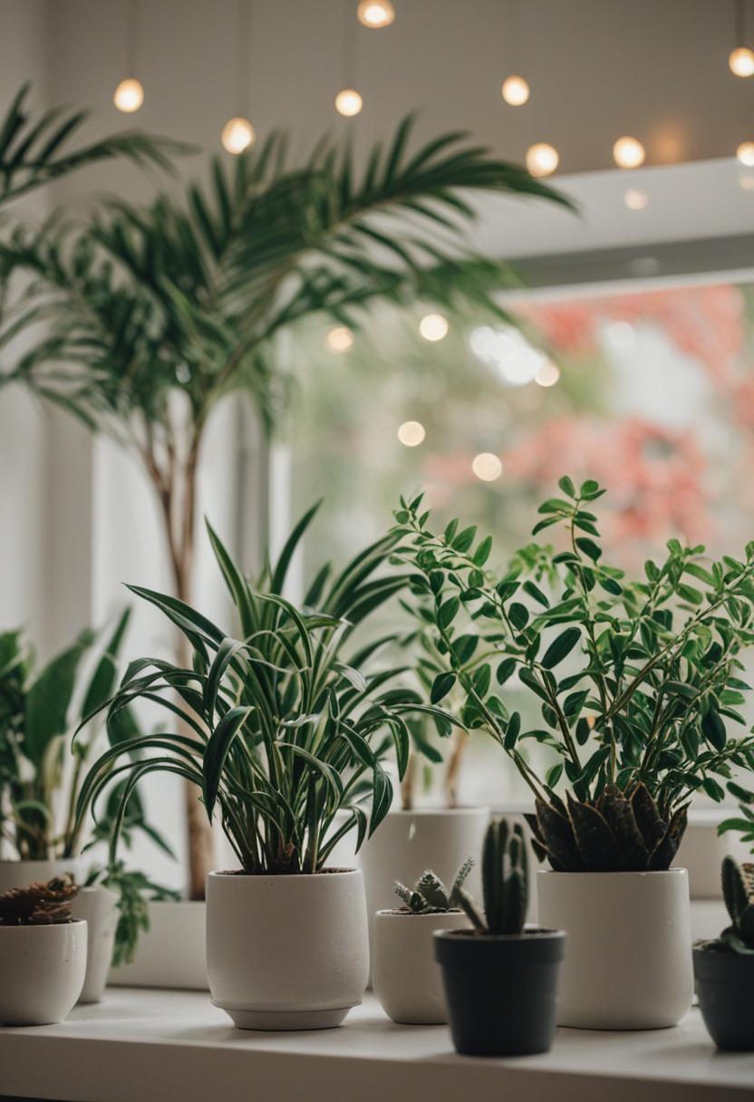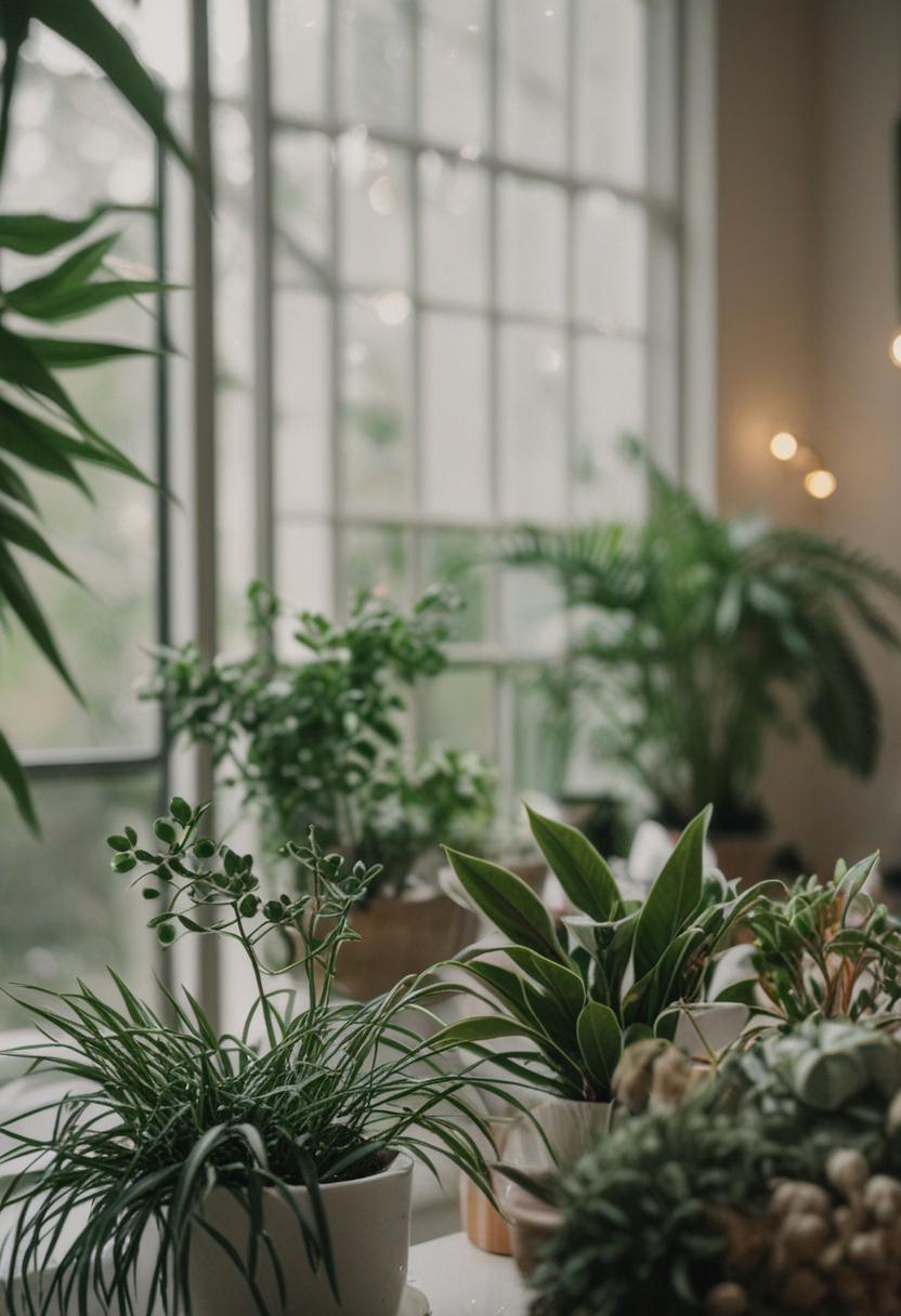 6. A serene arrangement of lush, aesthetic plants with soft greenery and delicate flowers, creating a calming and stylish natural ambiance.