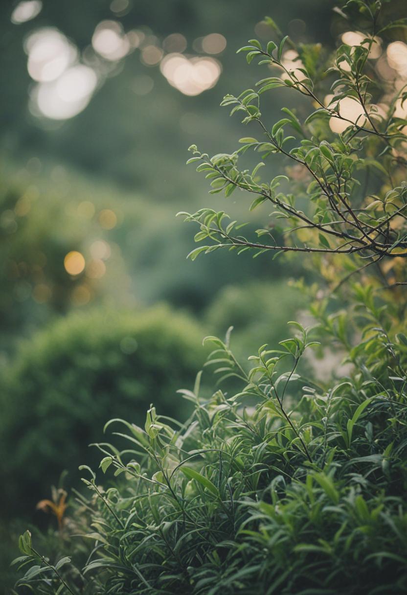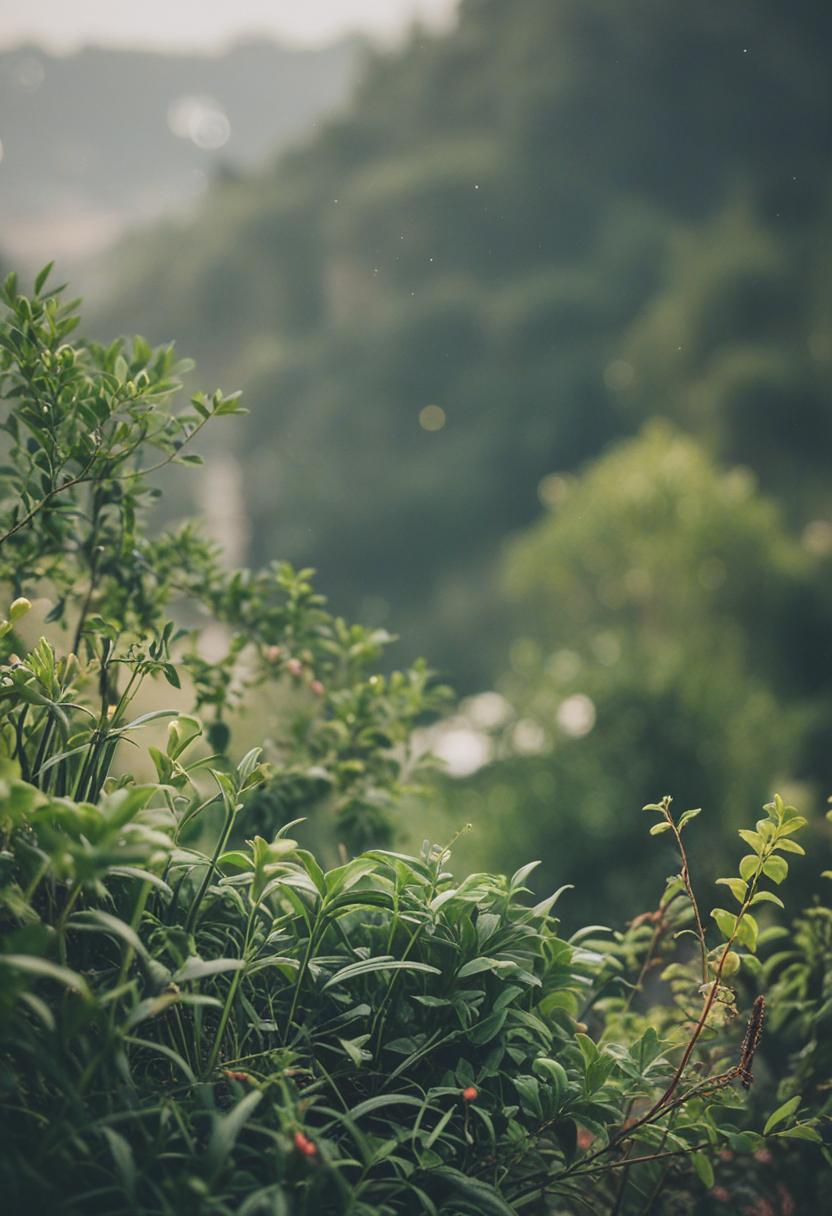 9. A serene image of aesthetic plants, showcasing lush greenery and delicate blooms in a peaceful, nature-inspired setting. The composition highlights soft textures and vibrant colors, evoking calm and tranquility.