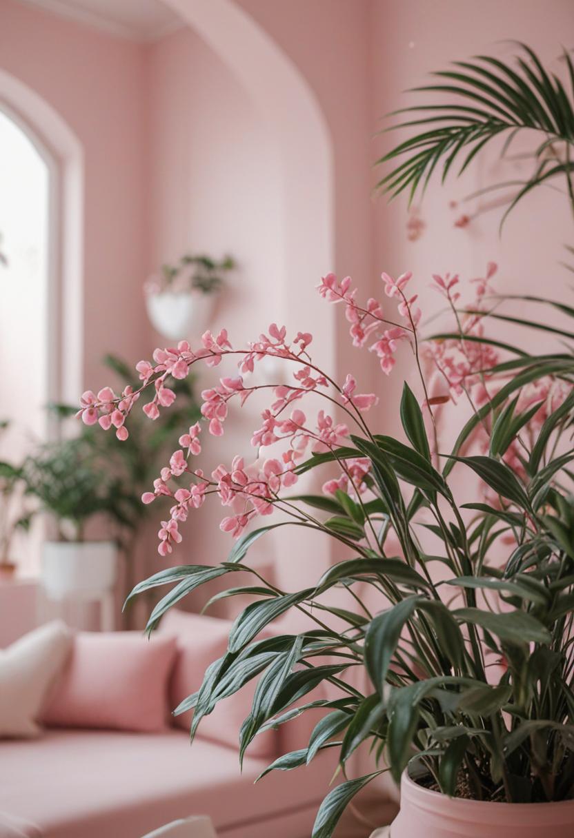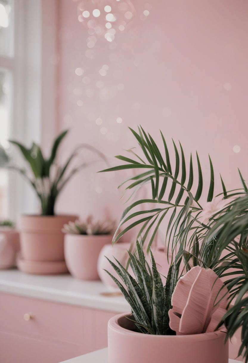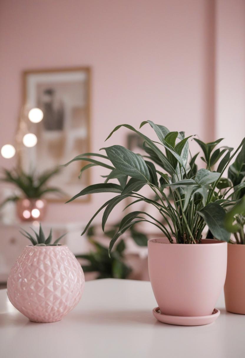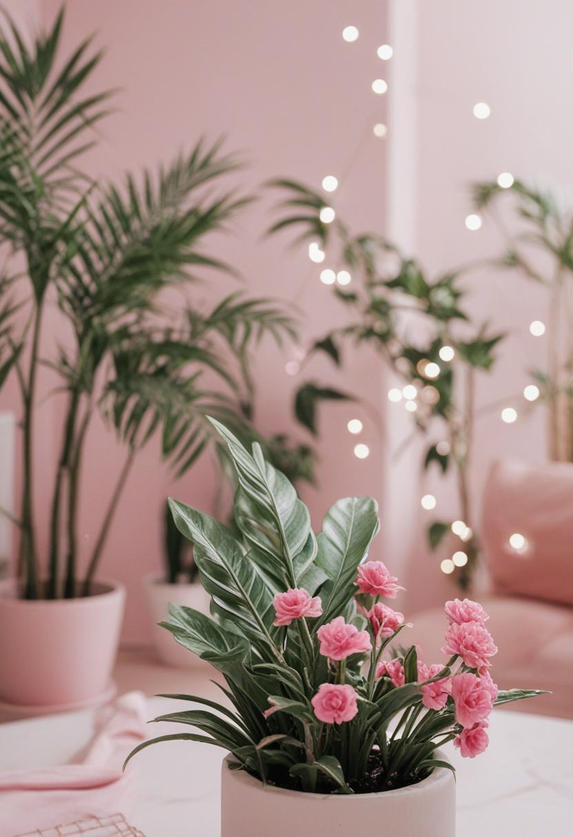 It blends soft pastel tones with lush greenery to create a calming and visually appealing environment. This style is often associated with a sense of tranquility and femininity. The use of pink flowers, vases, and decorative elements adds a touch of elegance to any space. Combining plants with pink decor can enhance both the beauty and air quality of a room.
