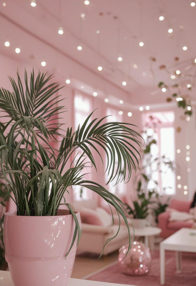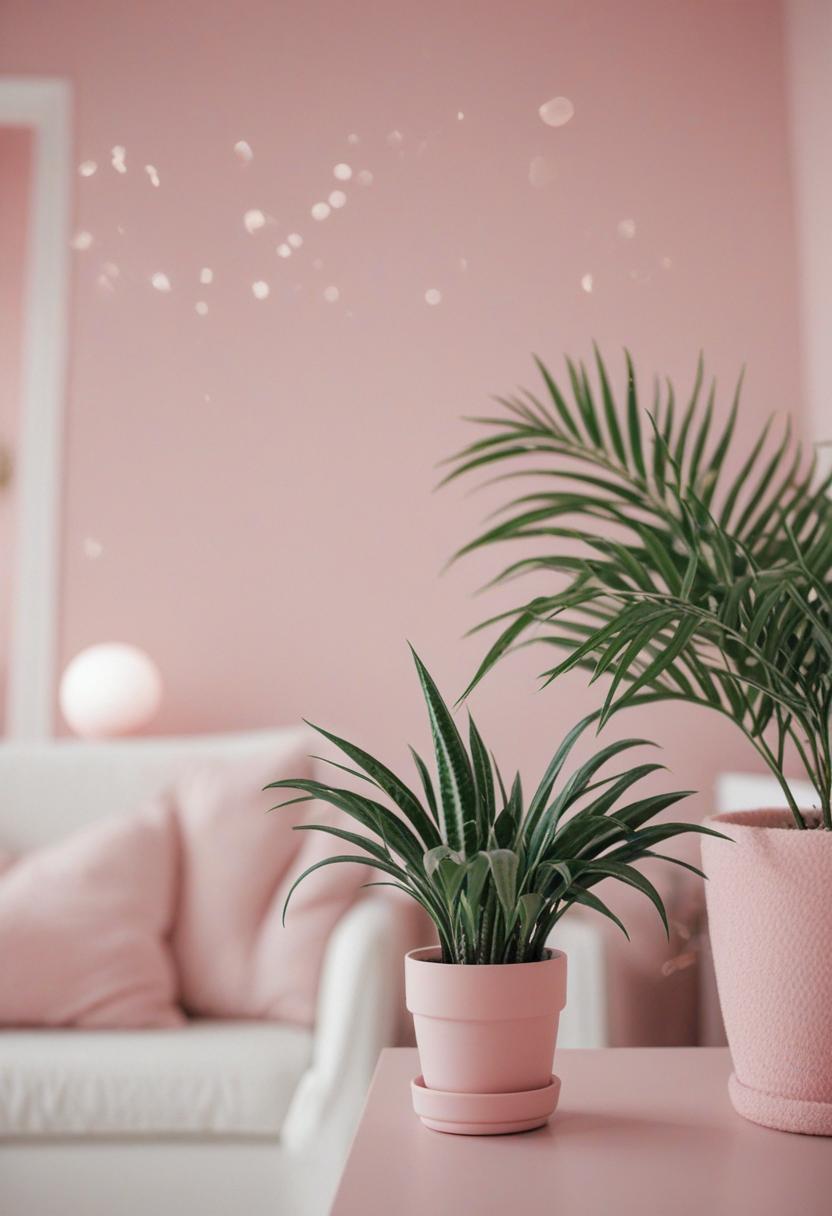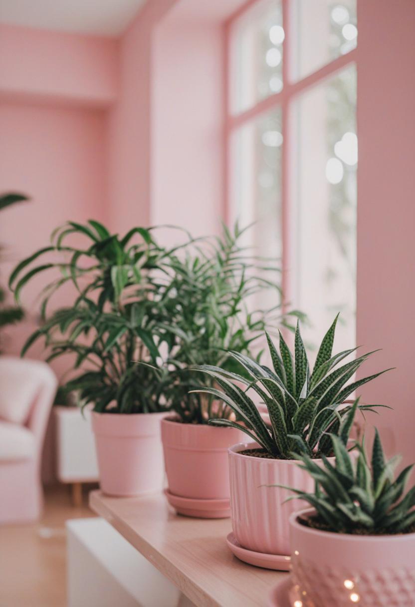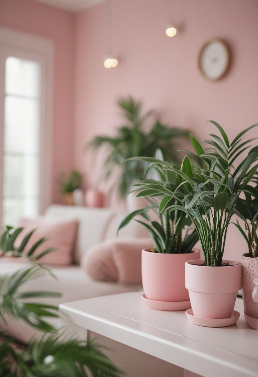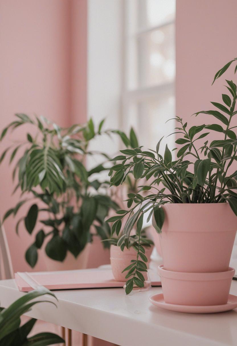It blends soft pastel tones with lush greenery to create a calming and visually appealing environment. This style is often associated with a sense of tranquility and femininity. The use of pink flowers, vases, and decorative elements adds a touch of elegance to any space. Combining plants with pink decor can enhance both the beauty and air quality of a room.