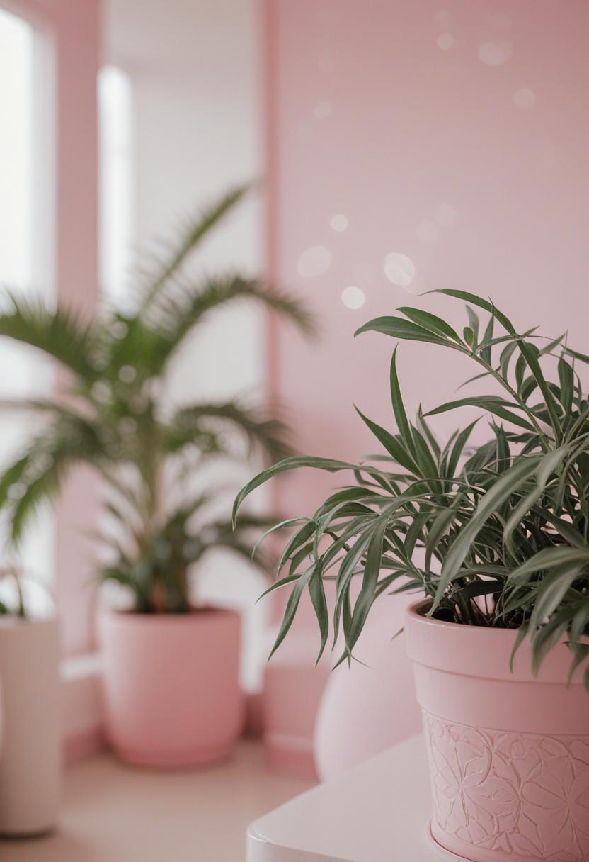 7. Soft pastel pink foliage and blooming flowers create a dreamy, serene atmosphere. The image captures a lush, calming plant arrangement with a gentle, ethereal pink aesthetic, perfect for a cozy, nature-inspired space.