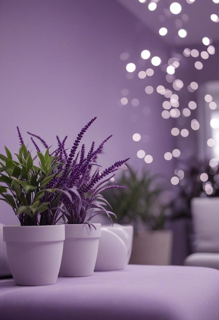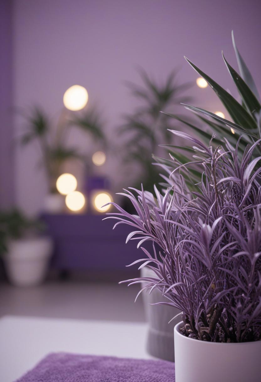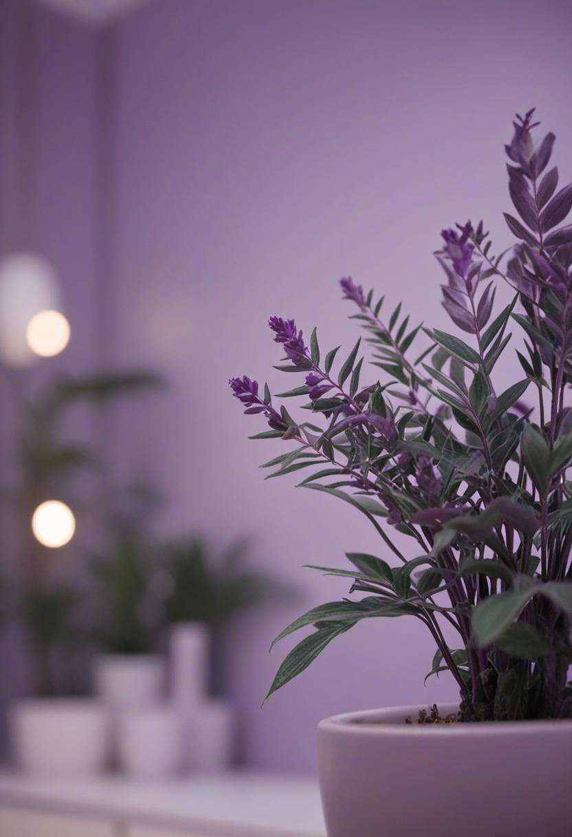 10. A serene scene of purple-hued plants under soft lighting, exuding a calming, mystical vibe. Rich purples and deep blues blend with greenery, creating a dreamy, nature-inspired atmosphere perfect for a calming retreat.