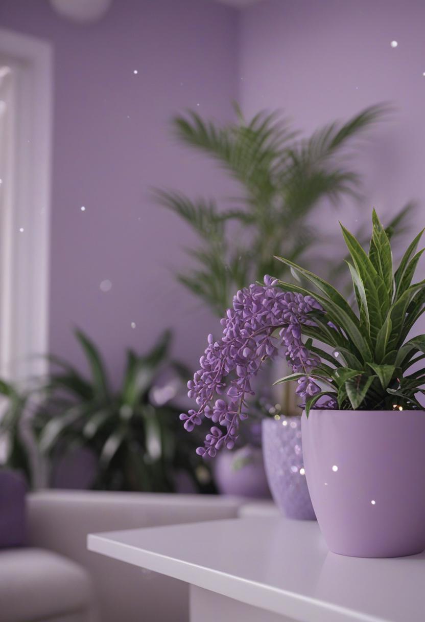 9. A lush, purple-hued plant arrangement with soft pastel tones, evoking a calming, mystical vibe. The imagery blends nature and fantasy, perfect for a dreamy, ethereal aesthetic.
