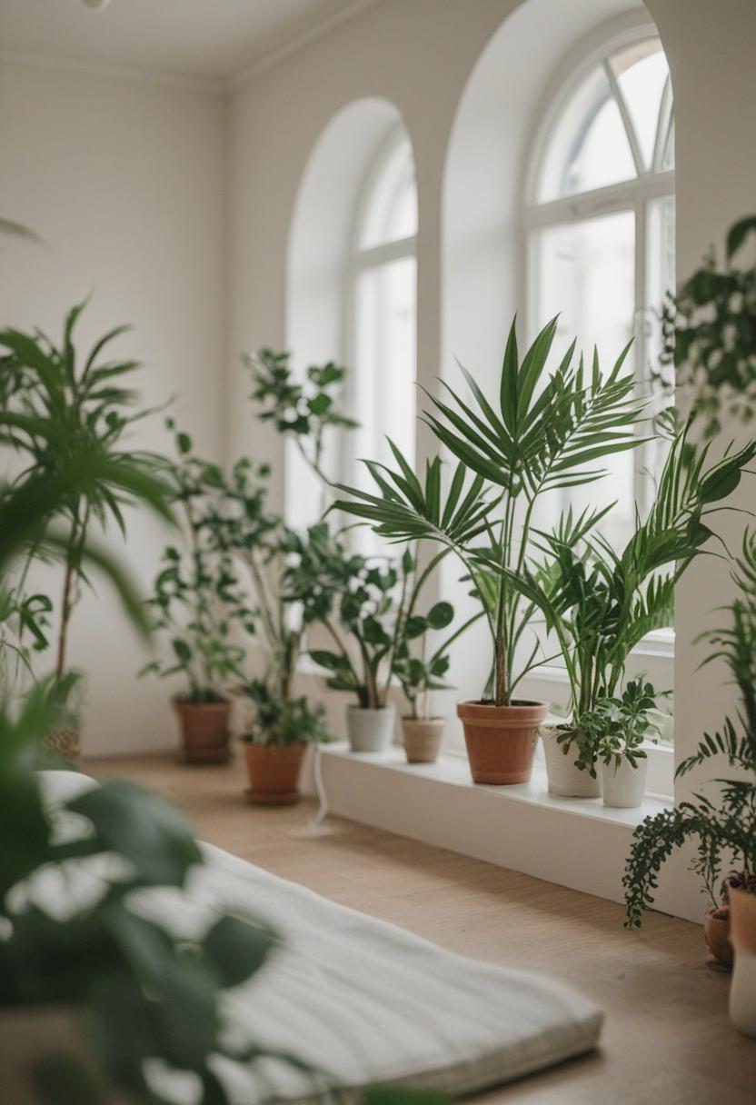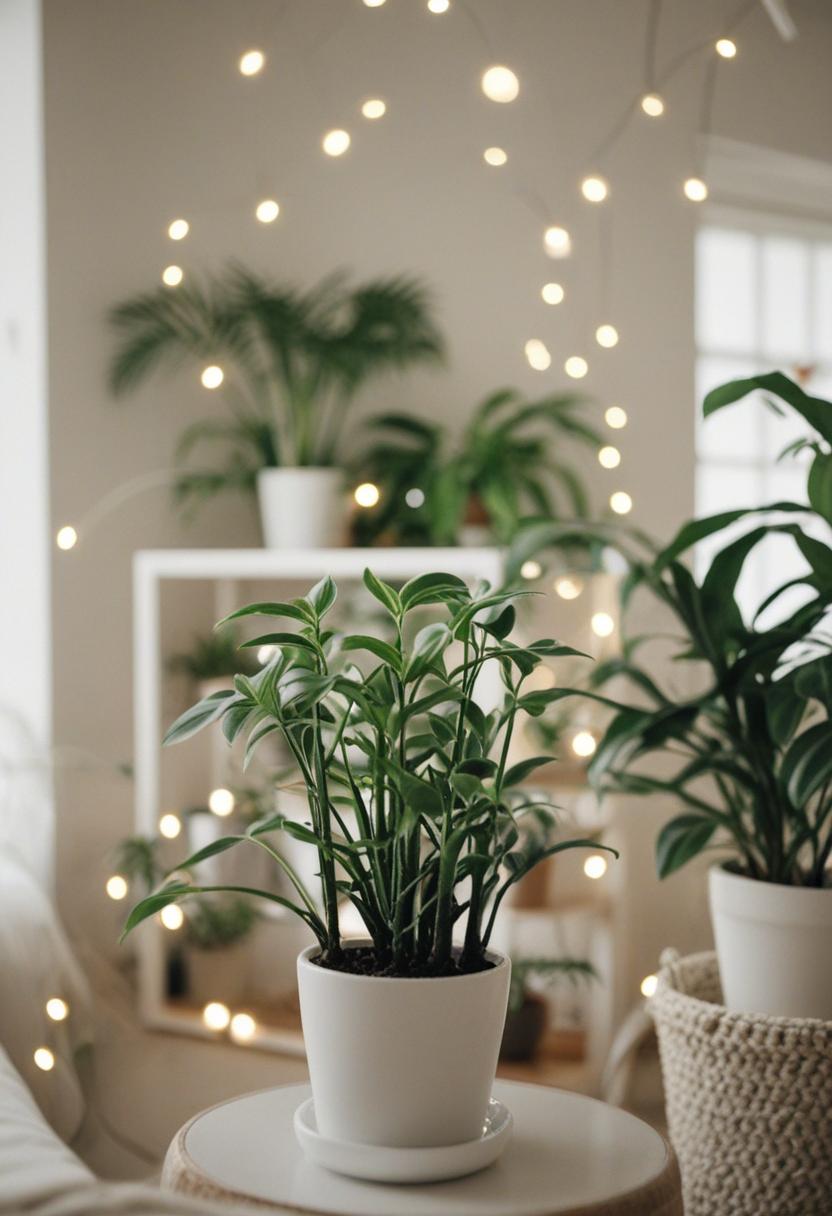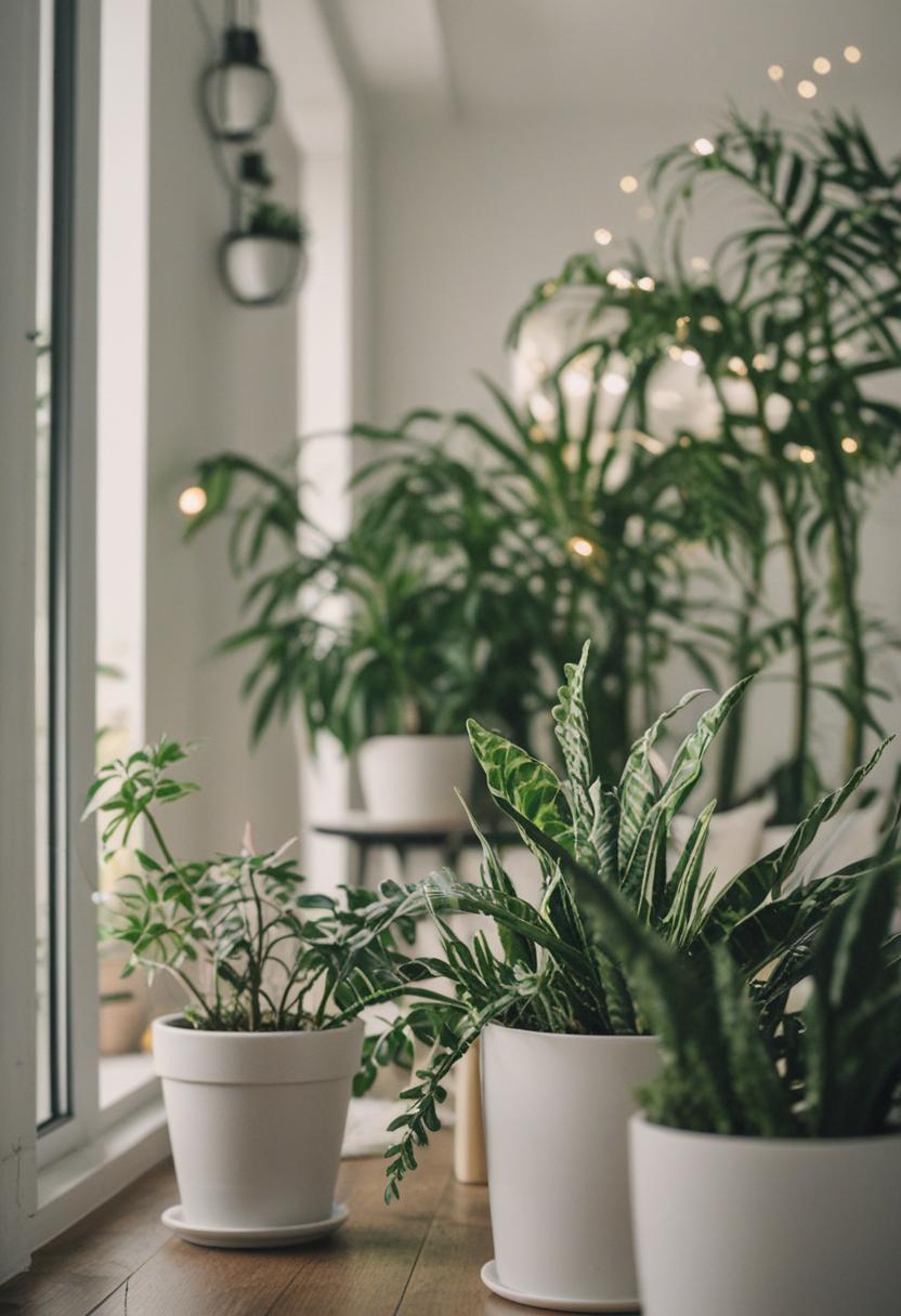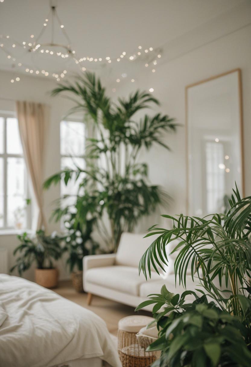 3. A cozy room adorned with lush green plants, soft lighting, and decorative accents, creating a calming and stylish indoor garden atmosphere.