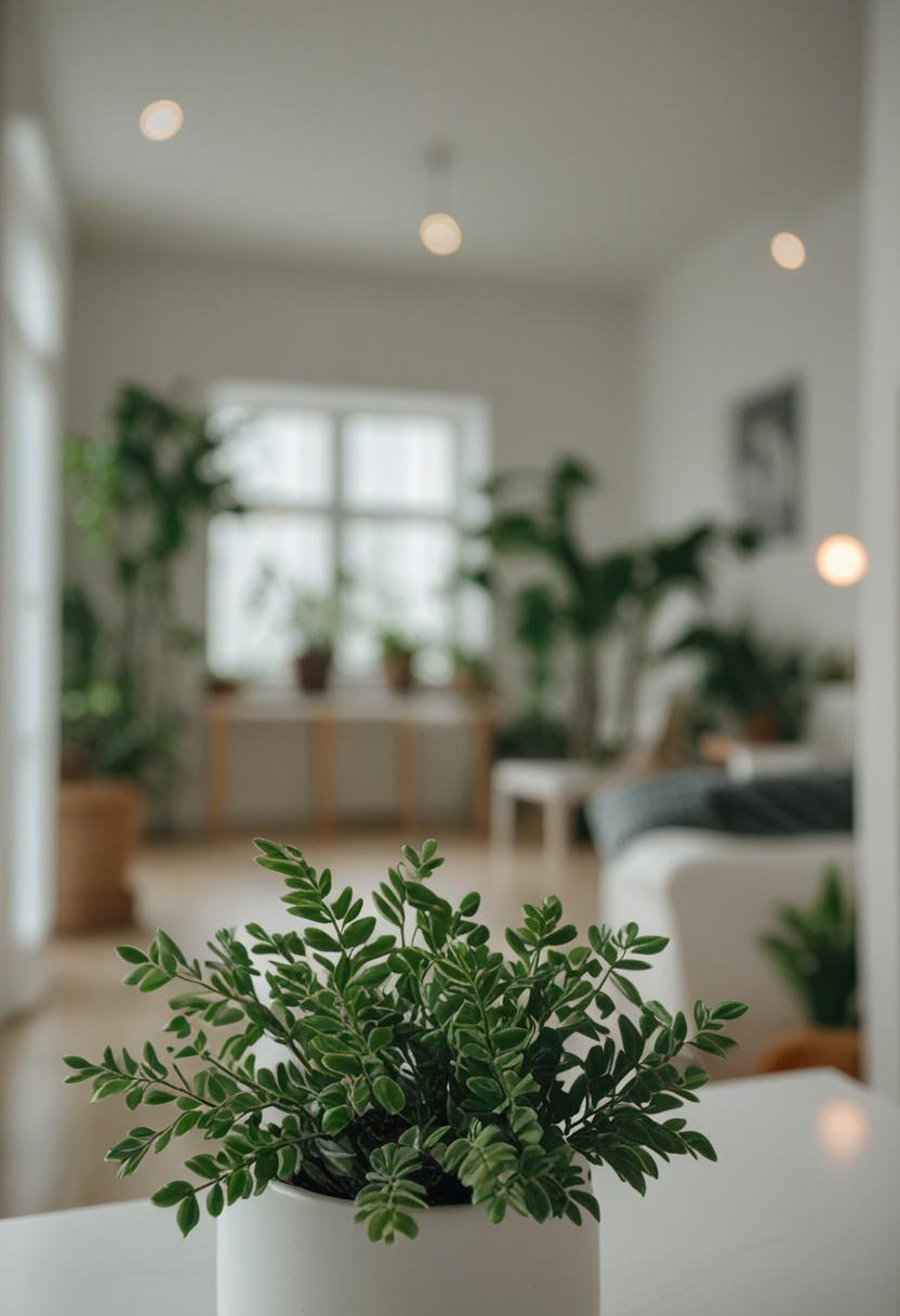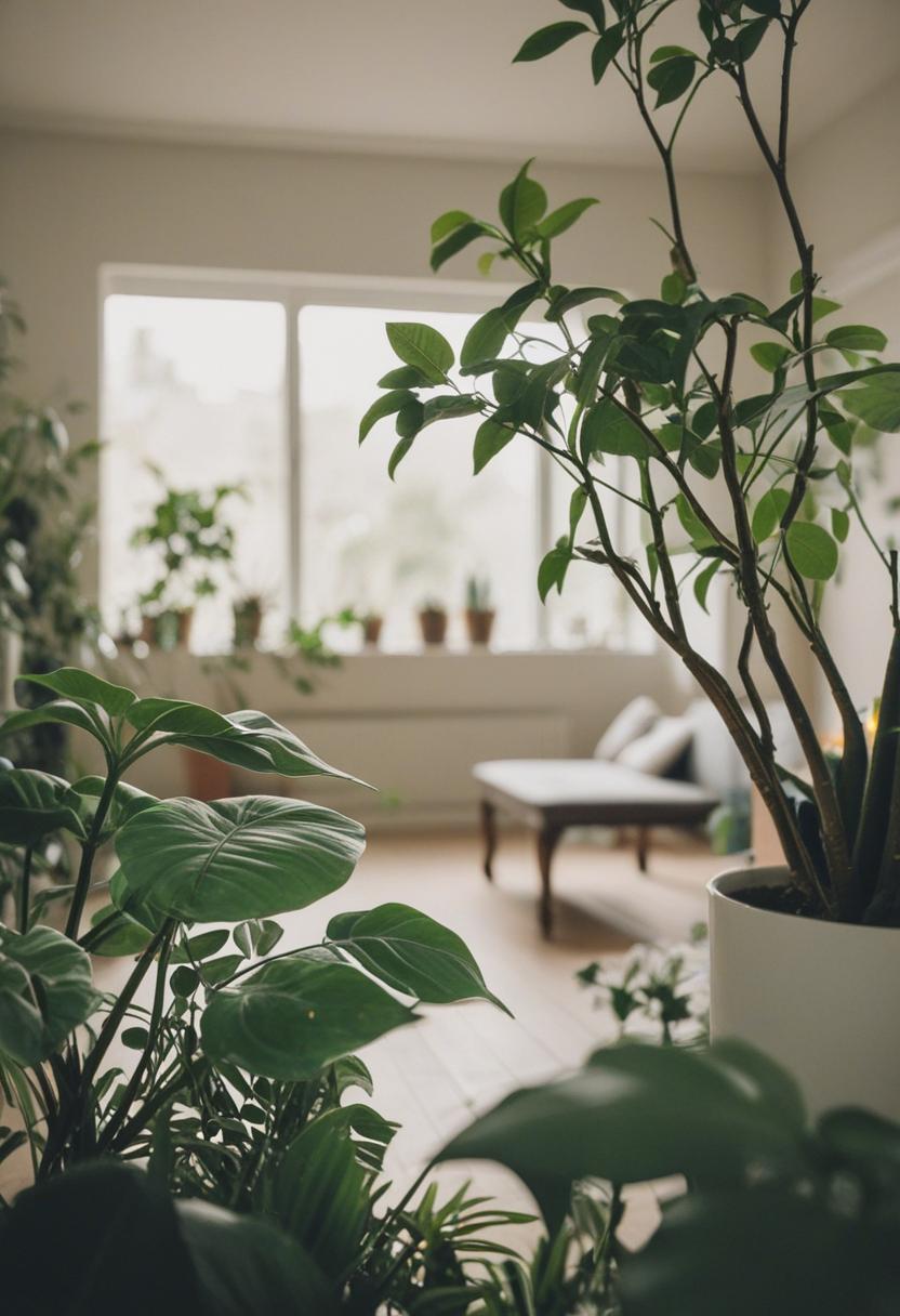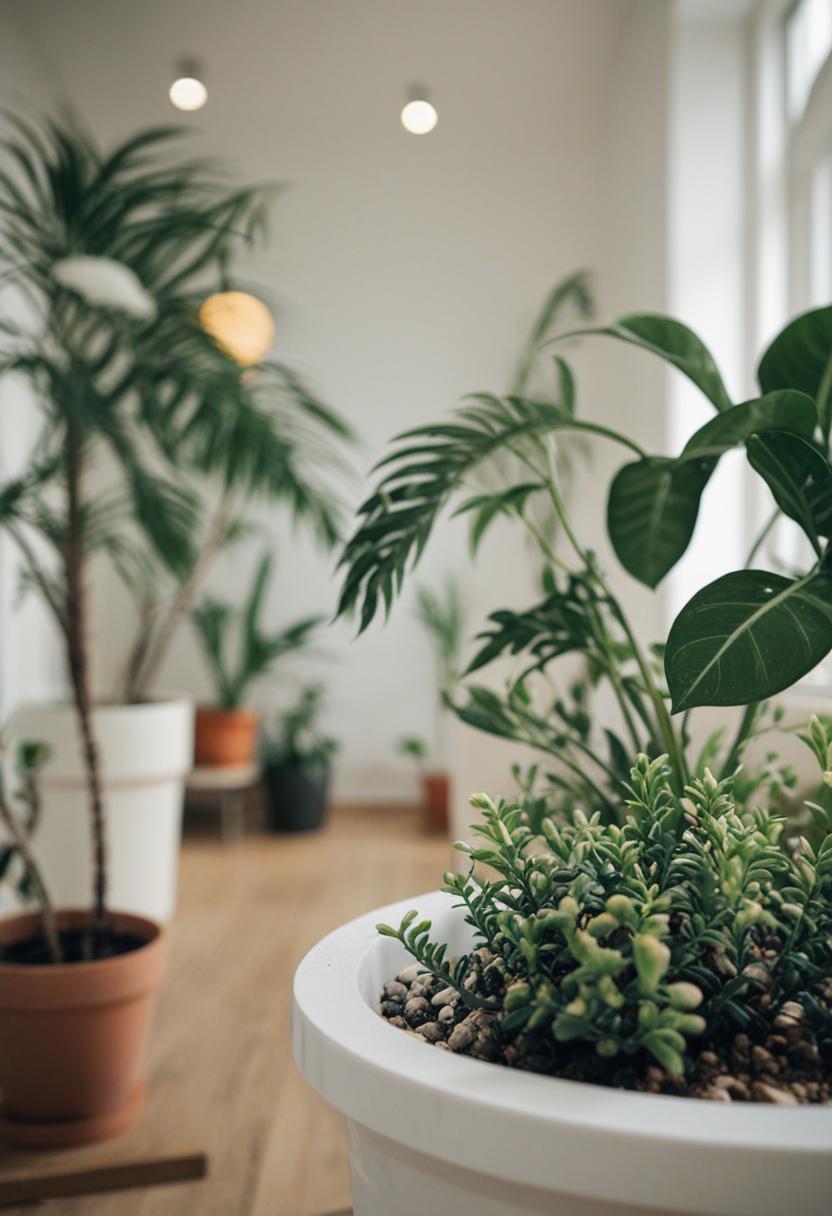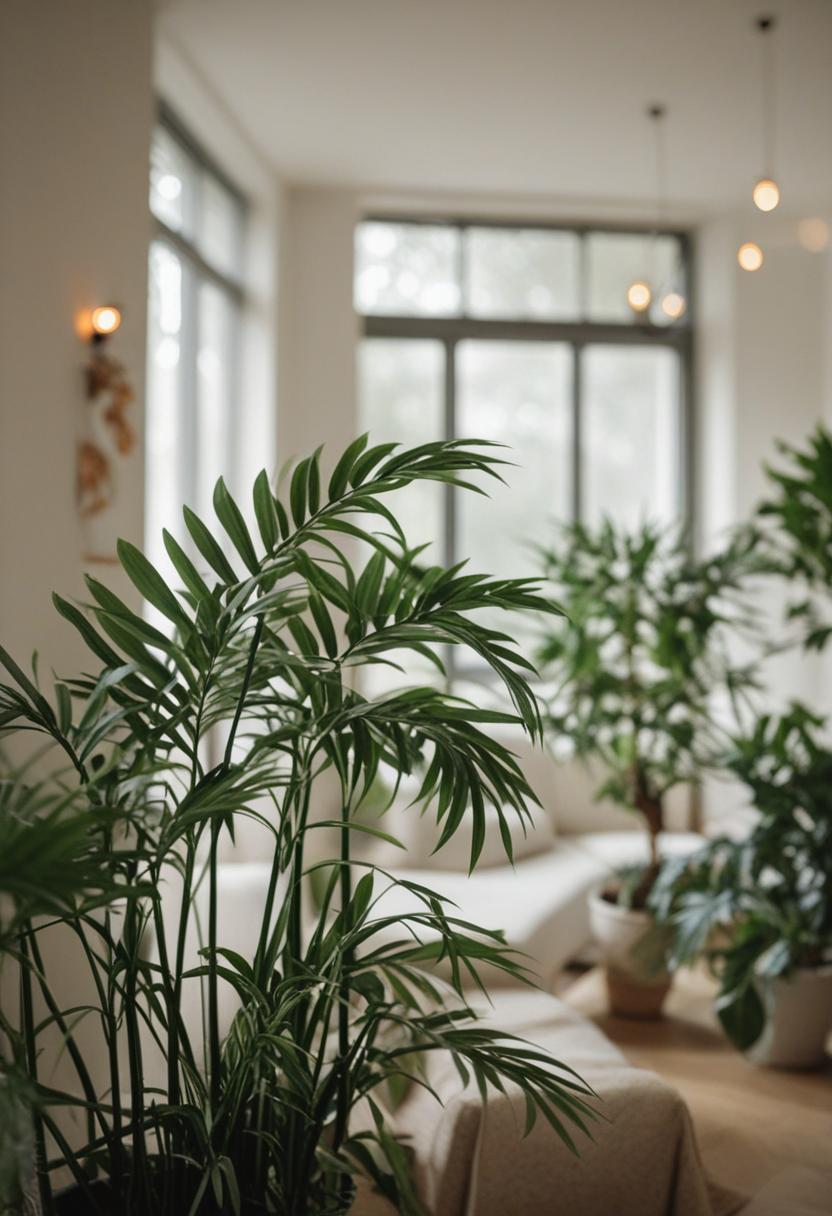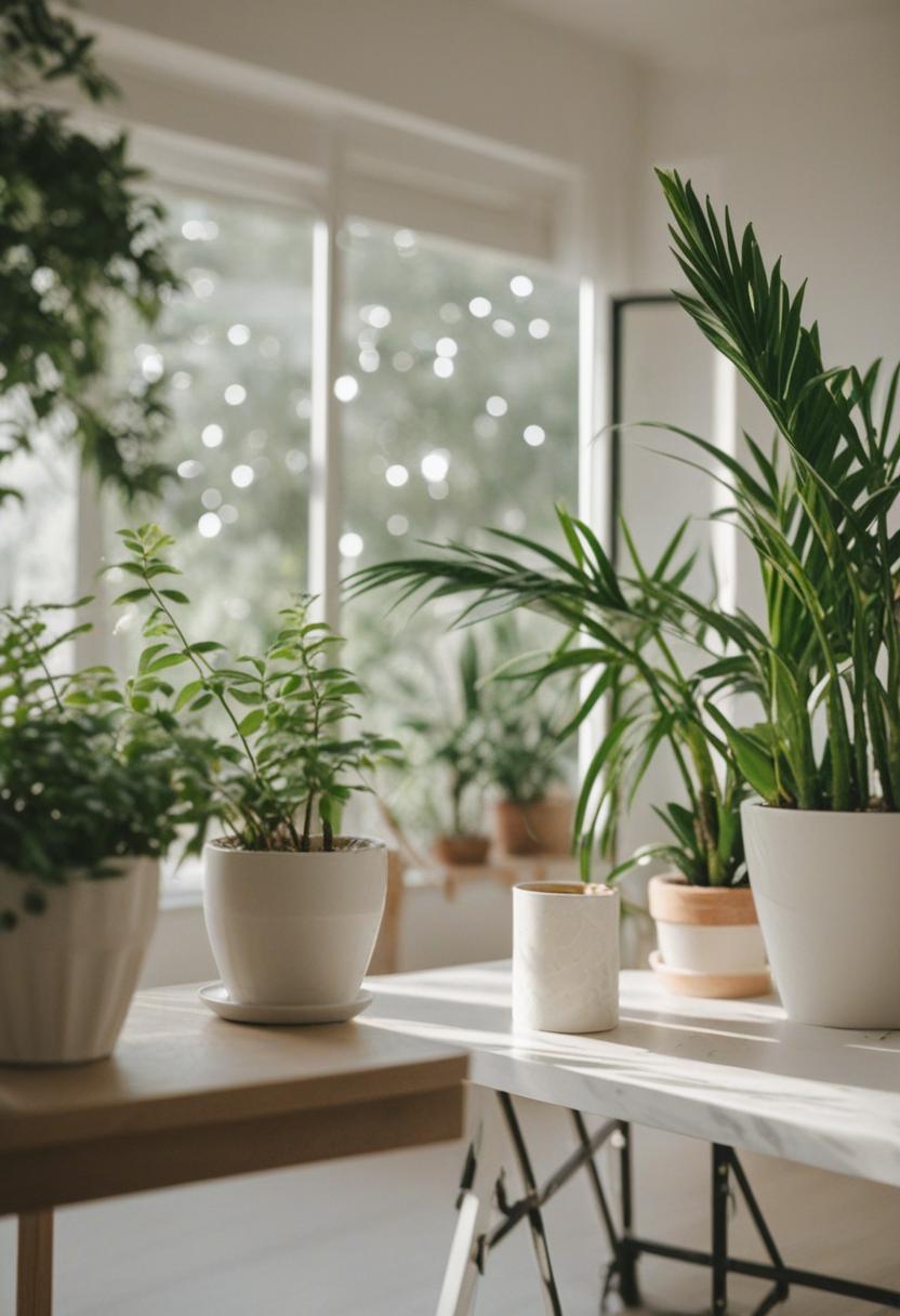 3. A cozy room adorned with lush green plants, soft lighting, and decorative accents, creating a calming and stylish indoor garden atmosphere.