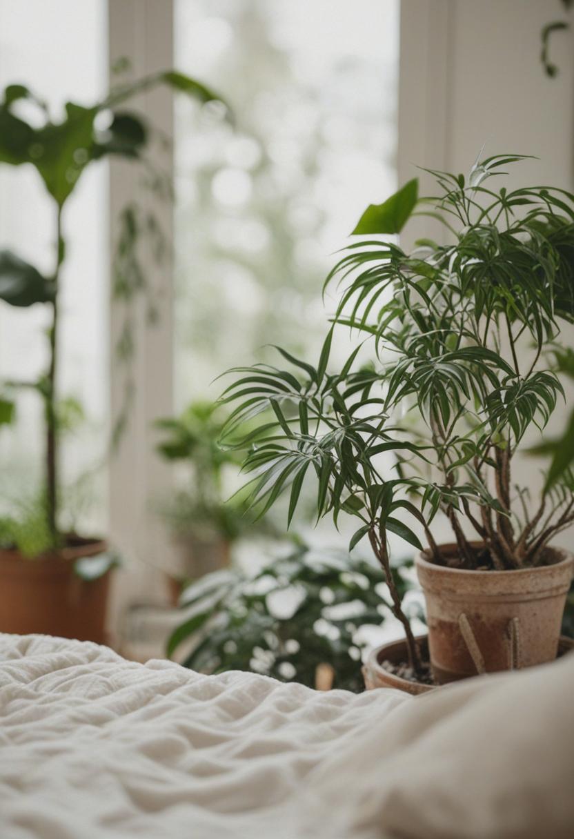4. A cozy room filled with greenery, featuring potted plants, soft lighting, and decorative accents that create a calming, nature-inspired aesthetic.