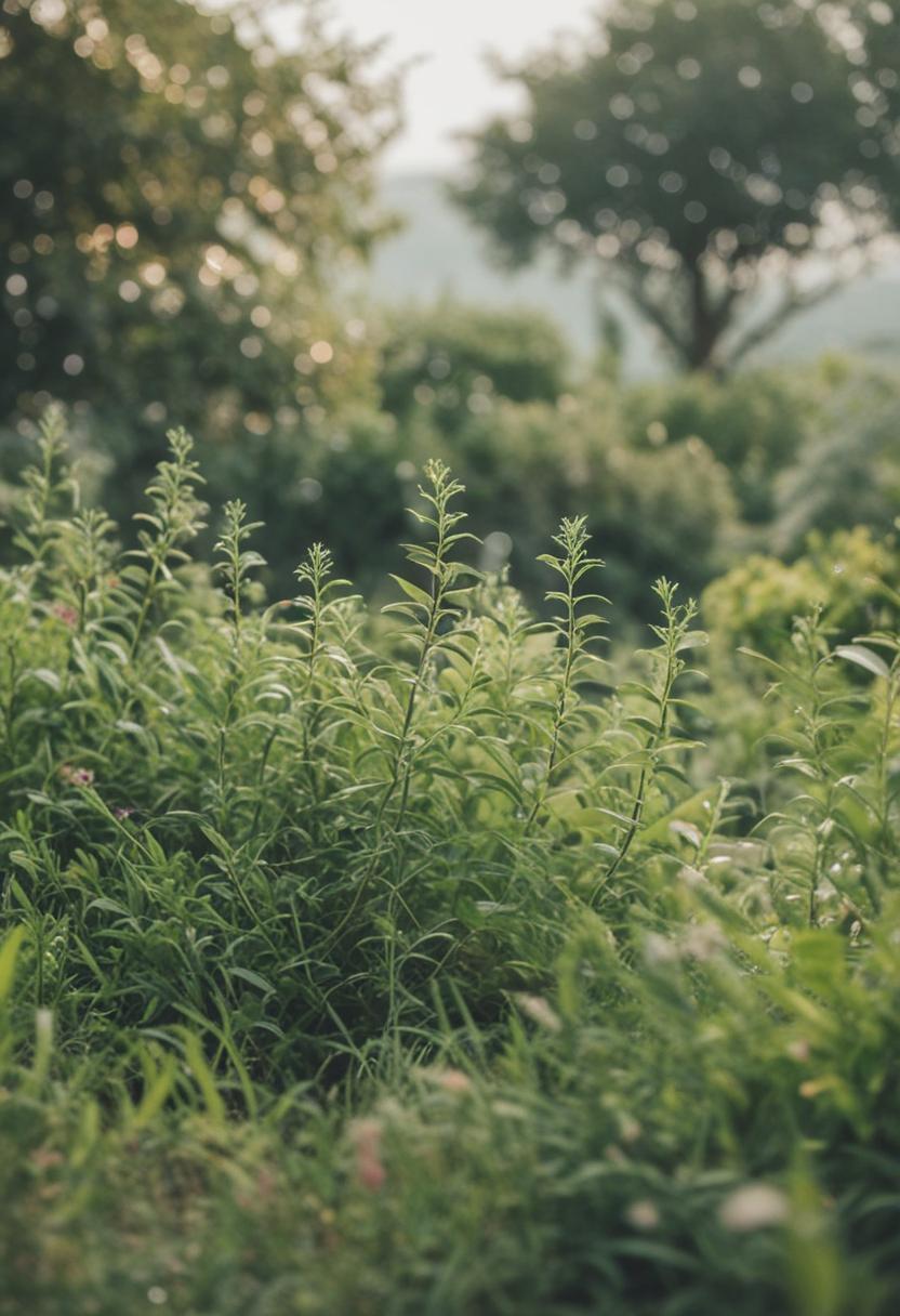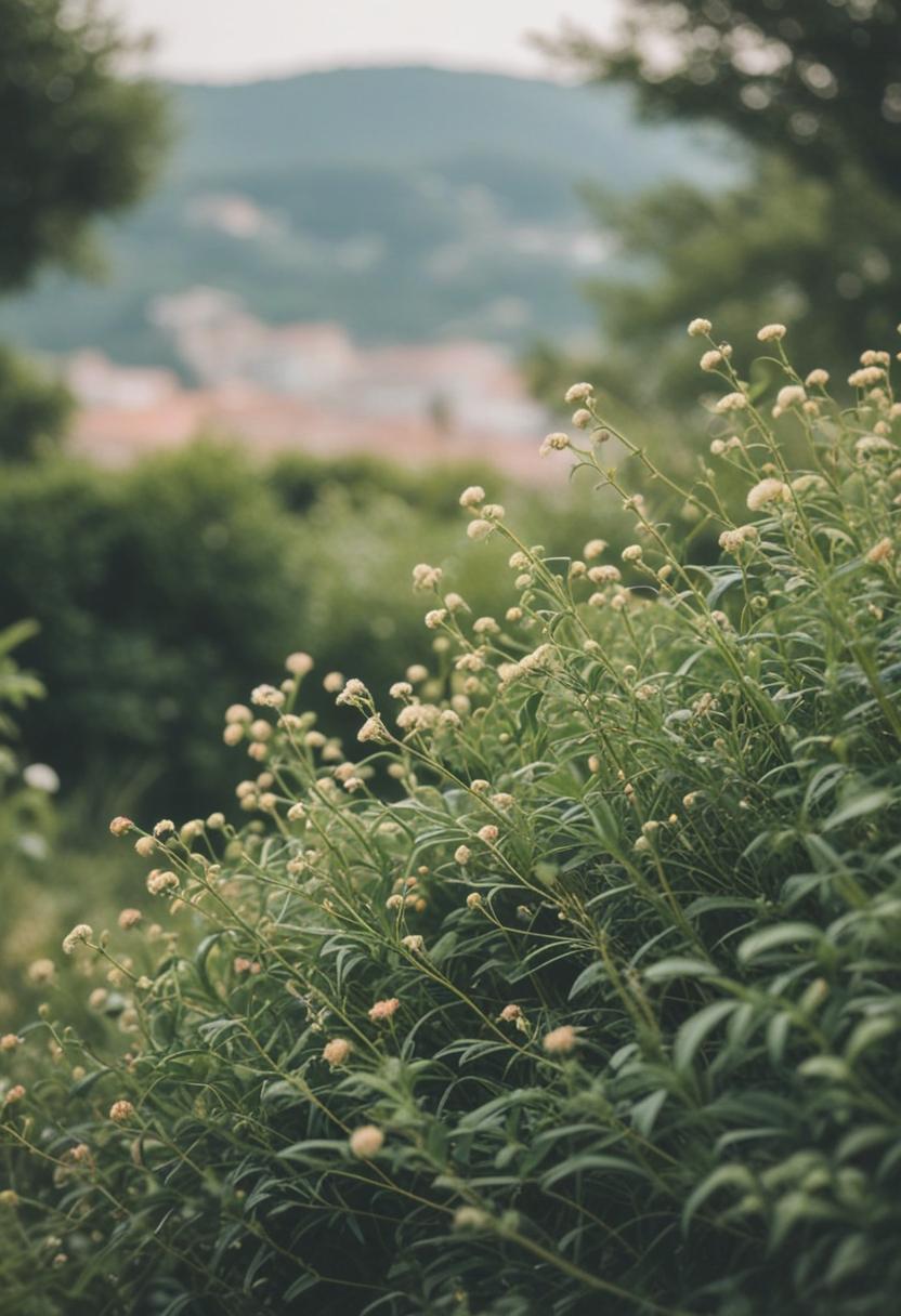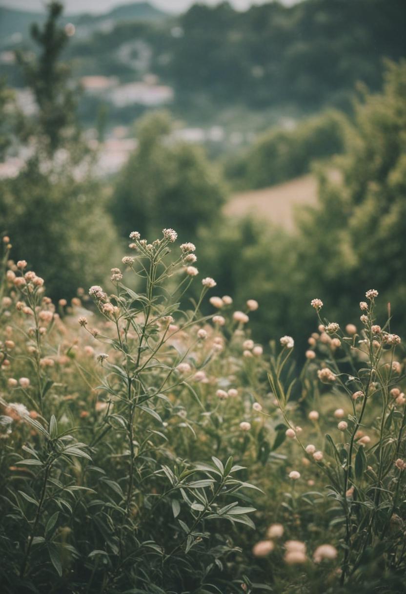 1. A vibrant summer scene featuring lush green plants, bright flowers, and natural textures, evoking a fresh, breezy, and carefree summer vibe with a focus on botanical beauty and soft, warm lighting.