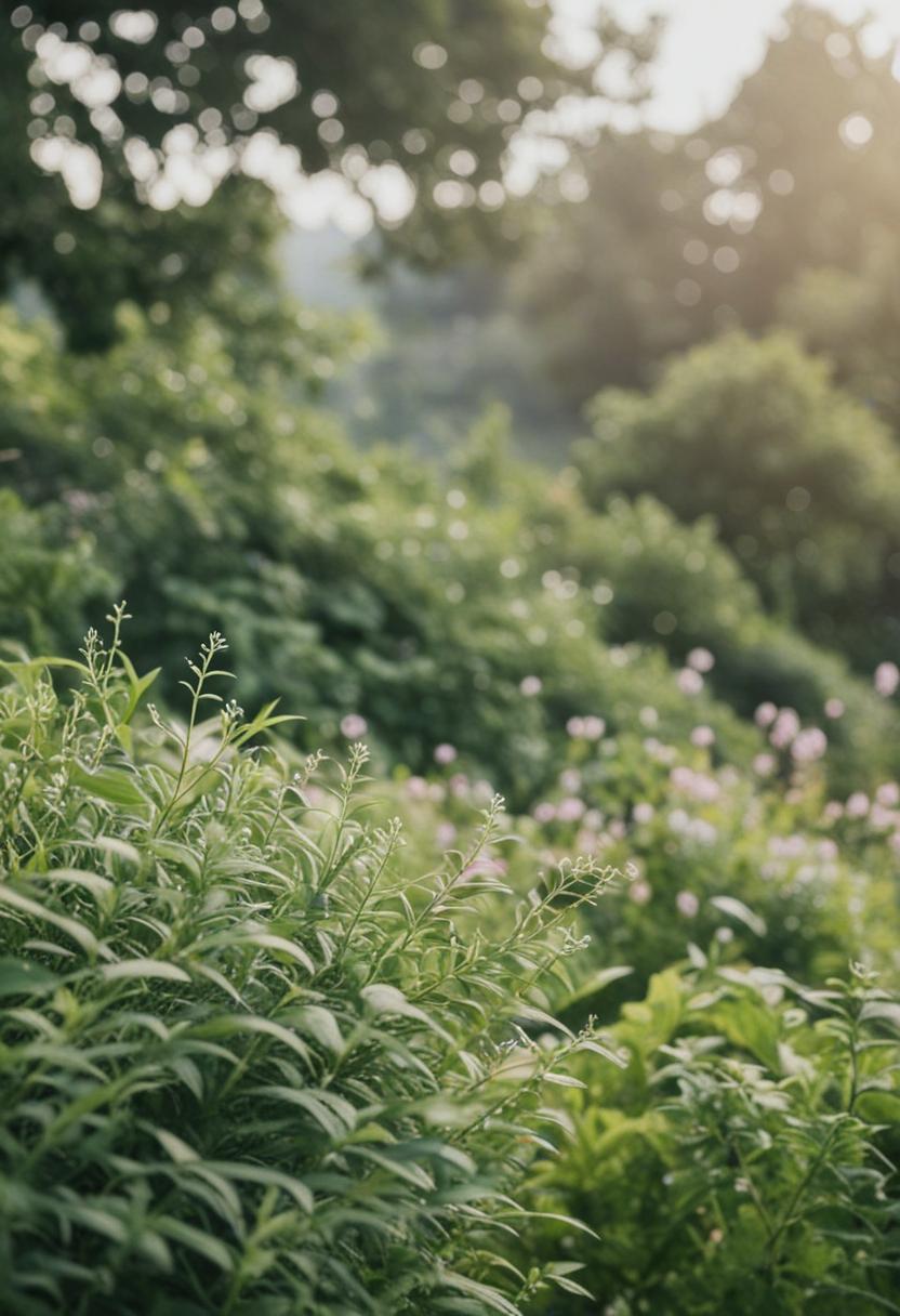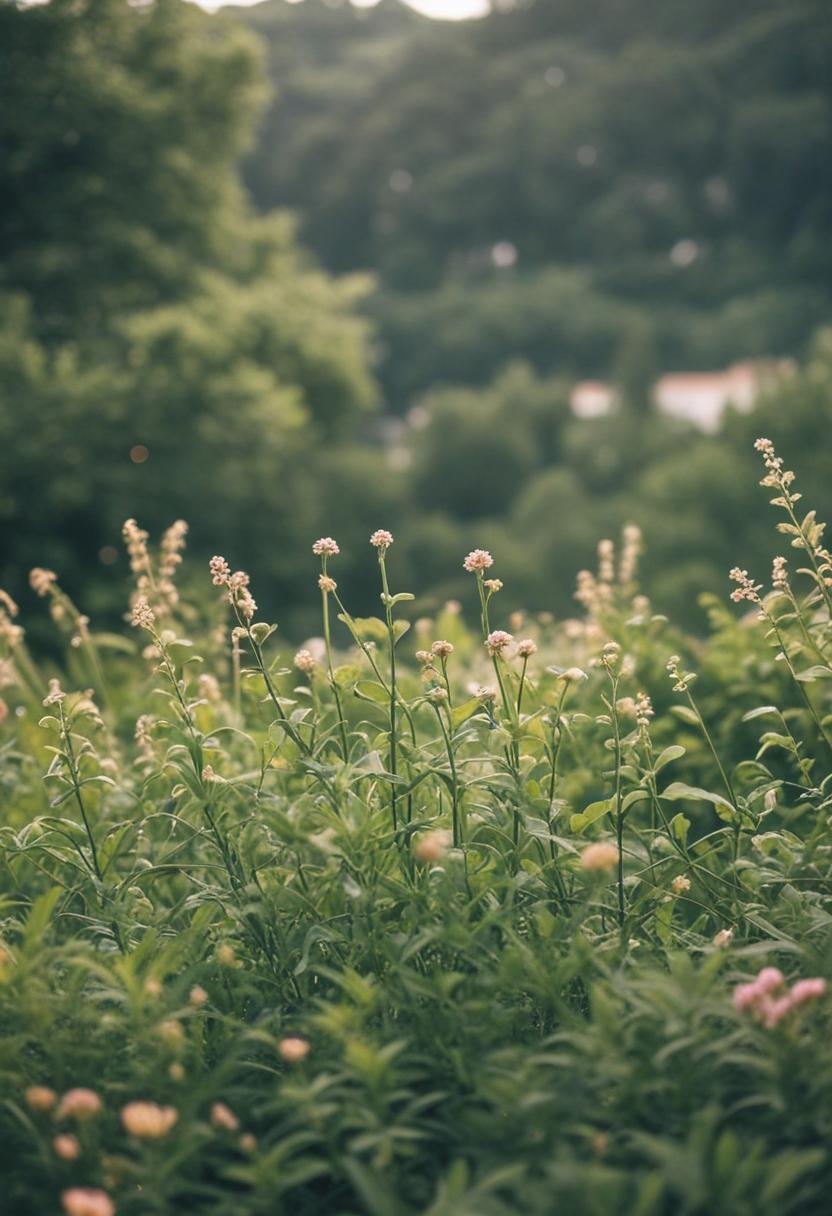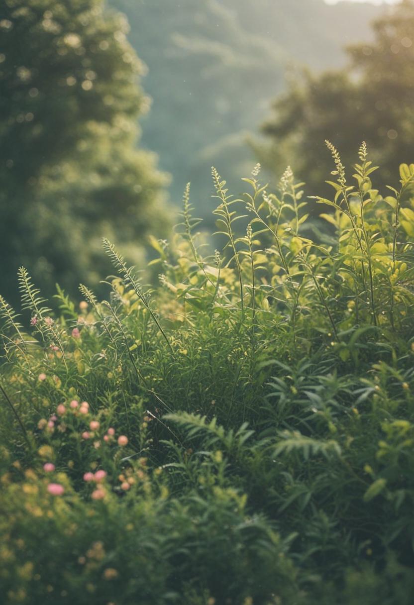 5. A vibrant summer scene featuring lush green plants, soft pastel flowers, and natural textures, evoking a serene, peaceful atmosphere perfect for a summer aesthetic.