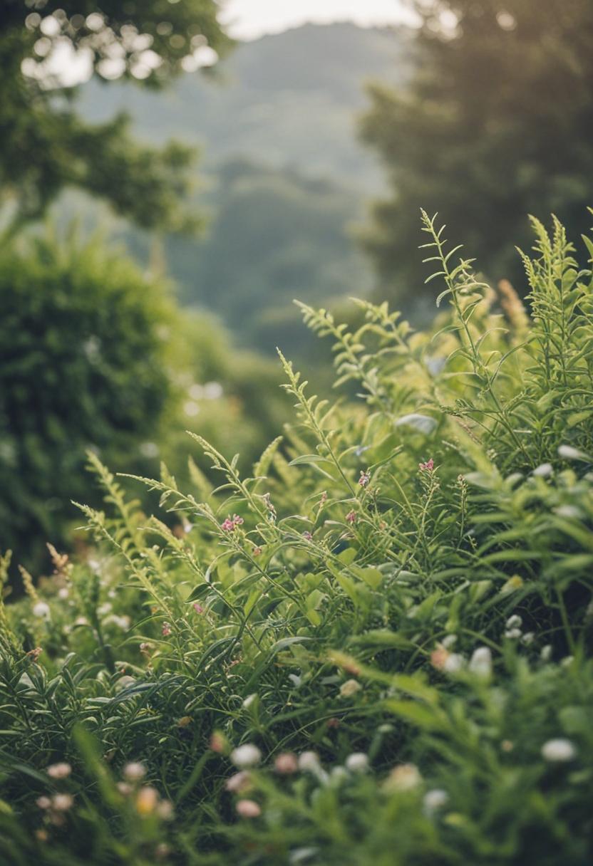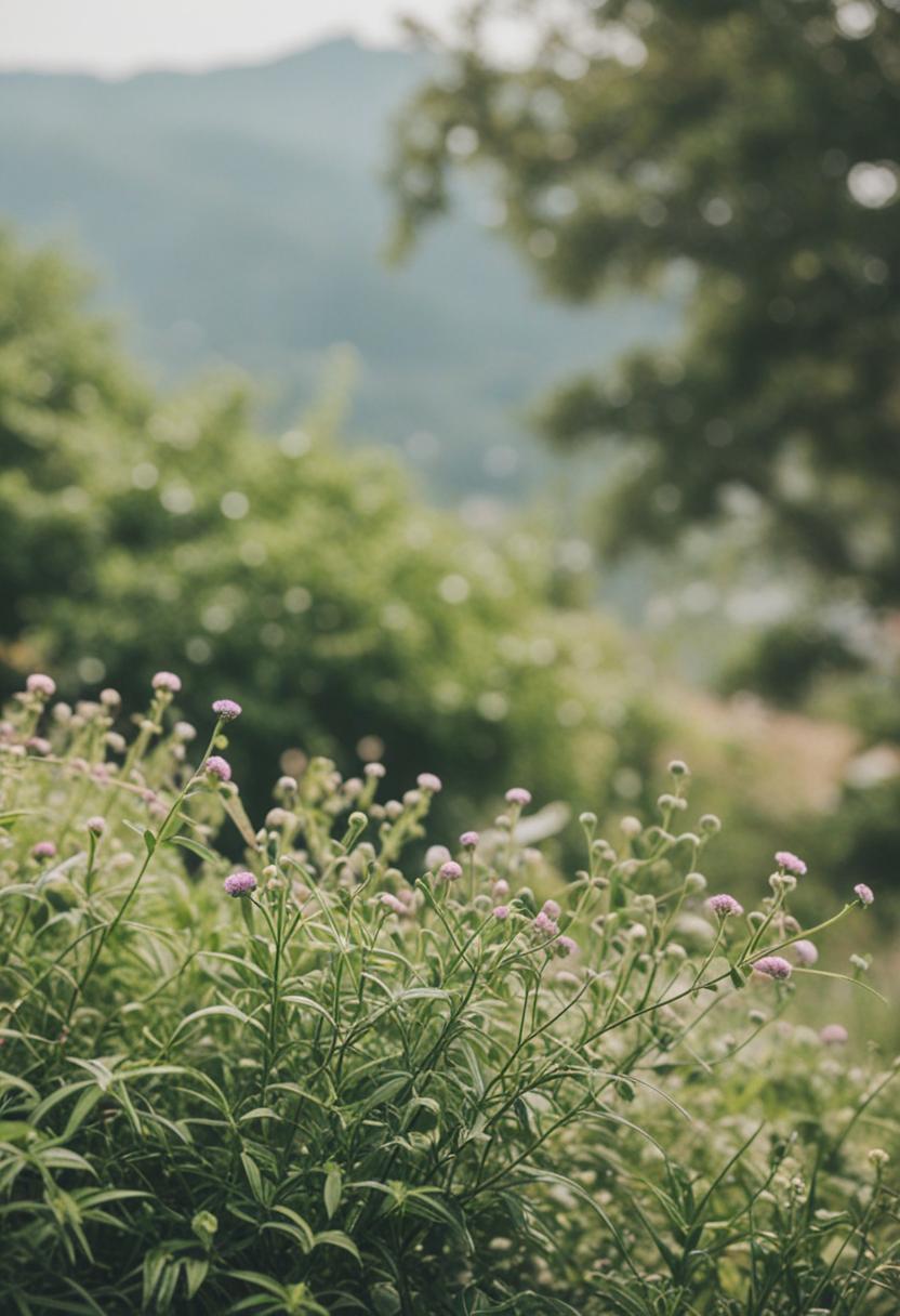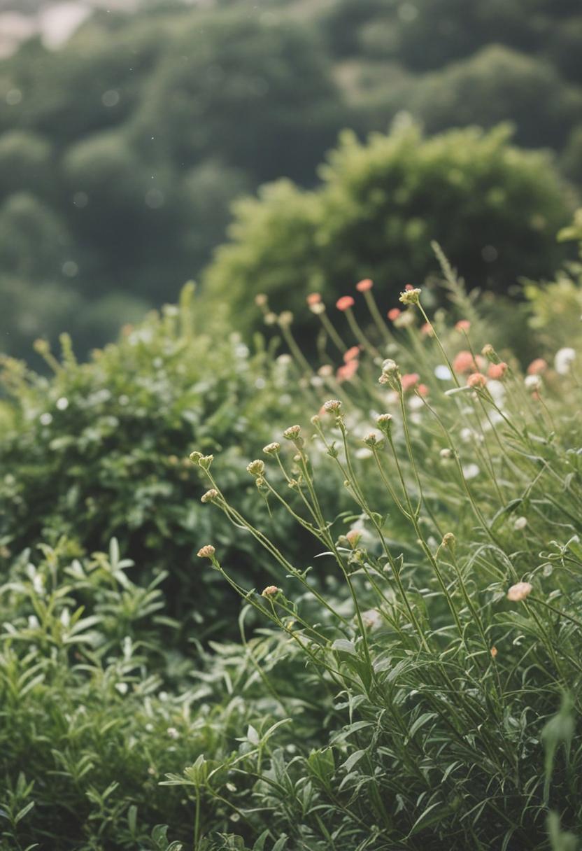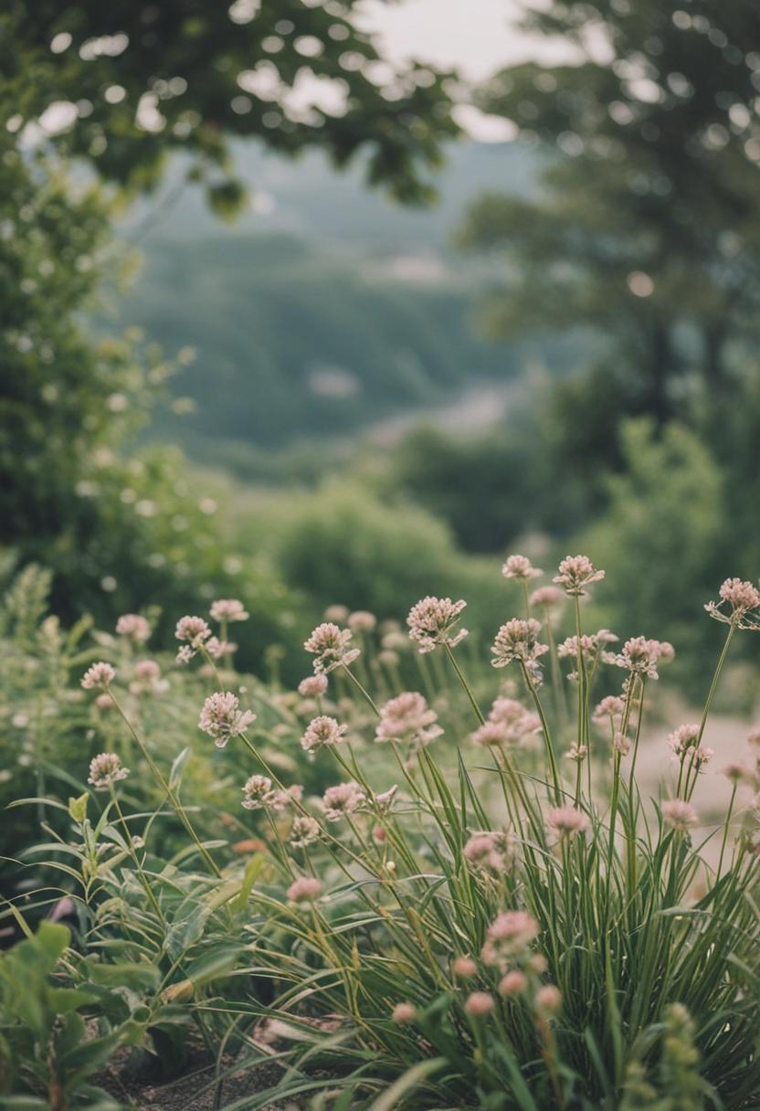 5. A vibrant summer scene featuring lush green plants, soft pastel flowers, and natural textures, evoking a serene, peaceful atmosphere perfect for a summer aesthetic.