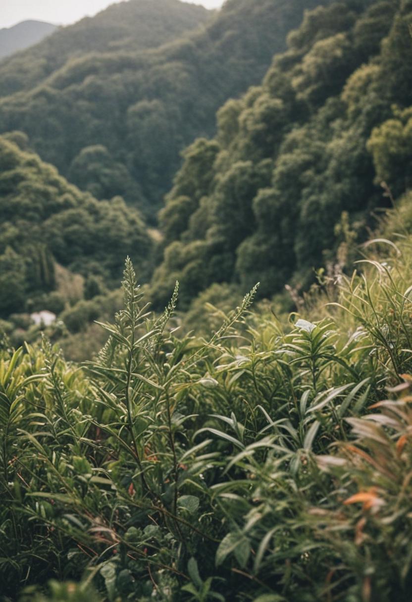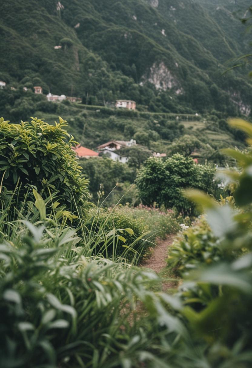6. A serene travel aesthetic scene featuring lush green plants and wanderers exploring nature. The image captures the essence of adventure and tranquility, blending travel with a love for botanical beauty.