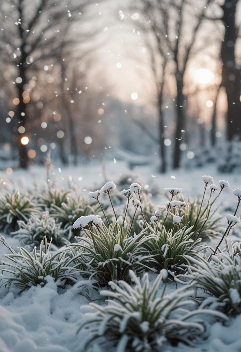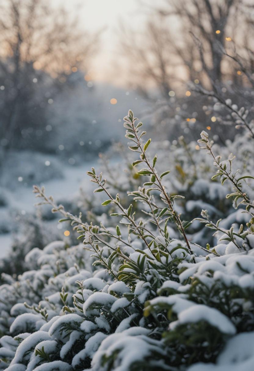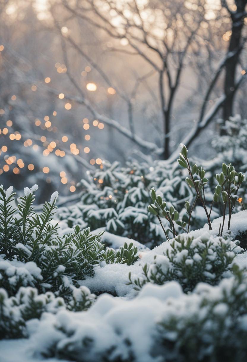 6. A serene winter scene with frost-covered plants, soft white snow, and muted greenery, creating a calm, elegant winter aesthetic.