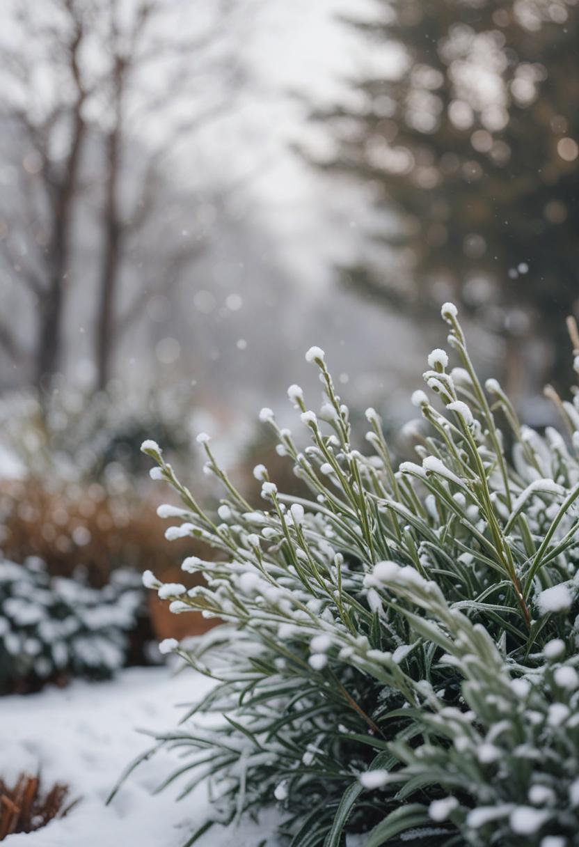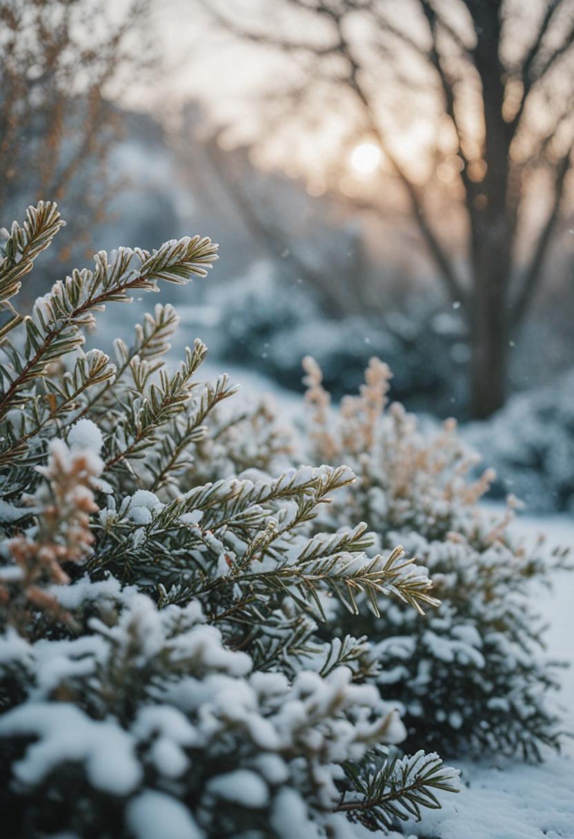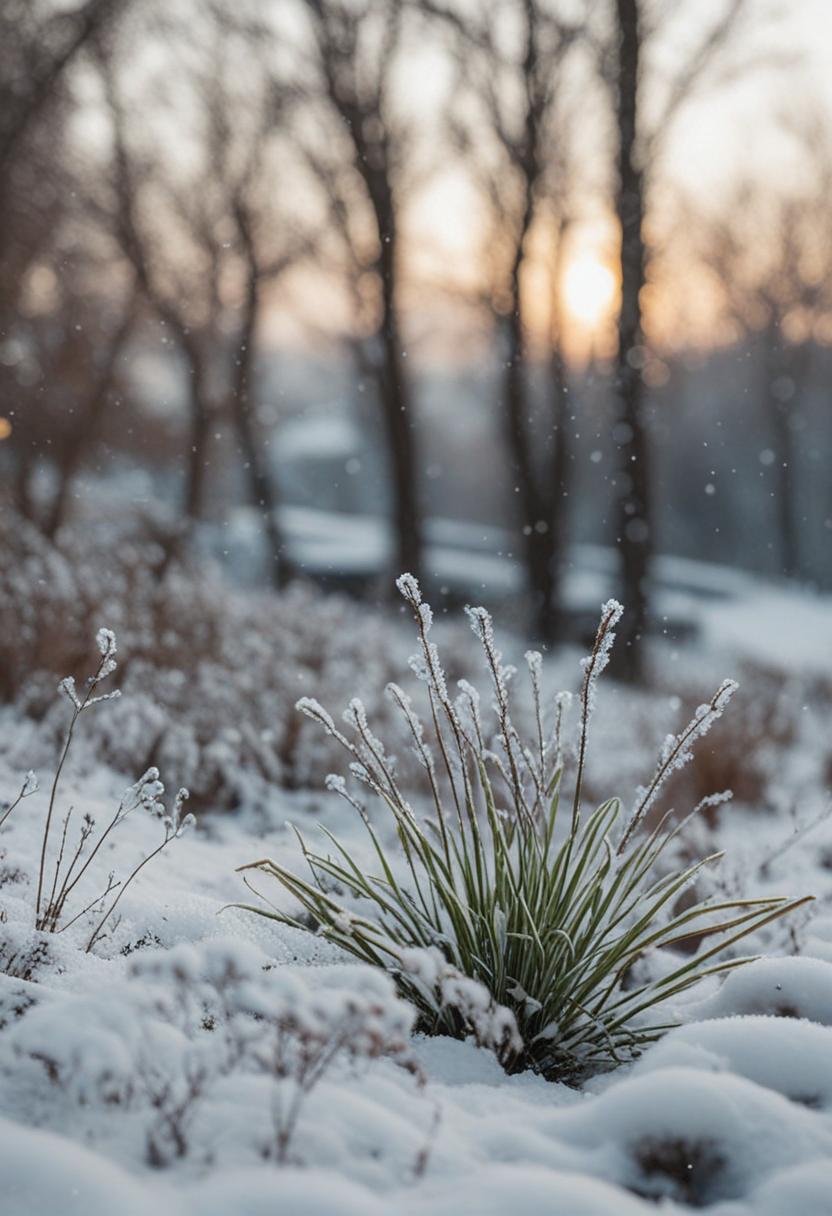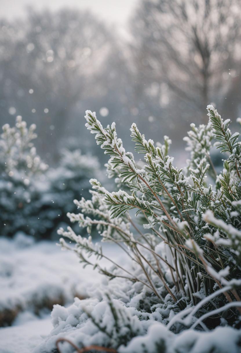 6. A serene winter scene with frost-covered plants, soft white snow, and muted greenery, creating a calm, elegant winter aesthetic.