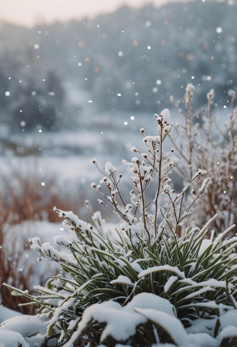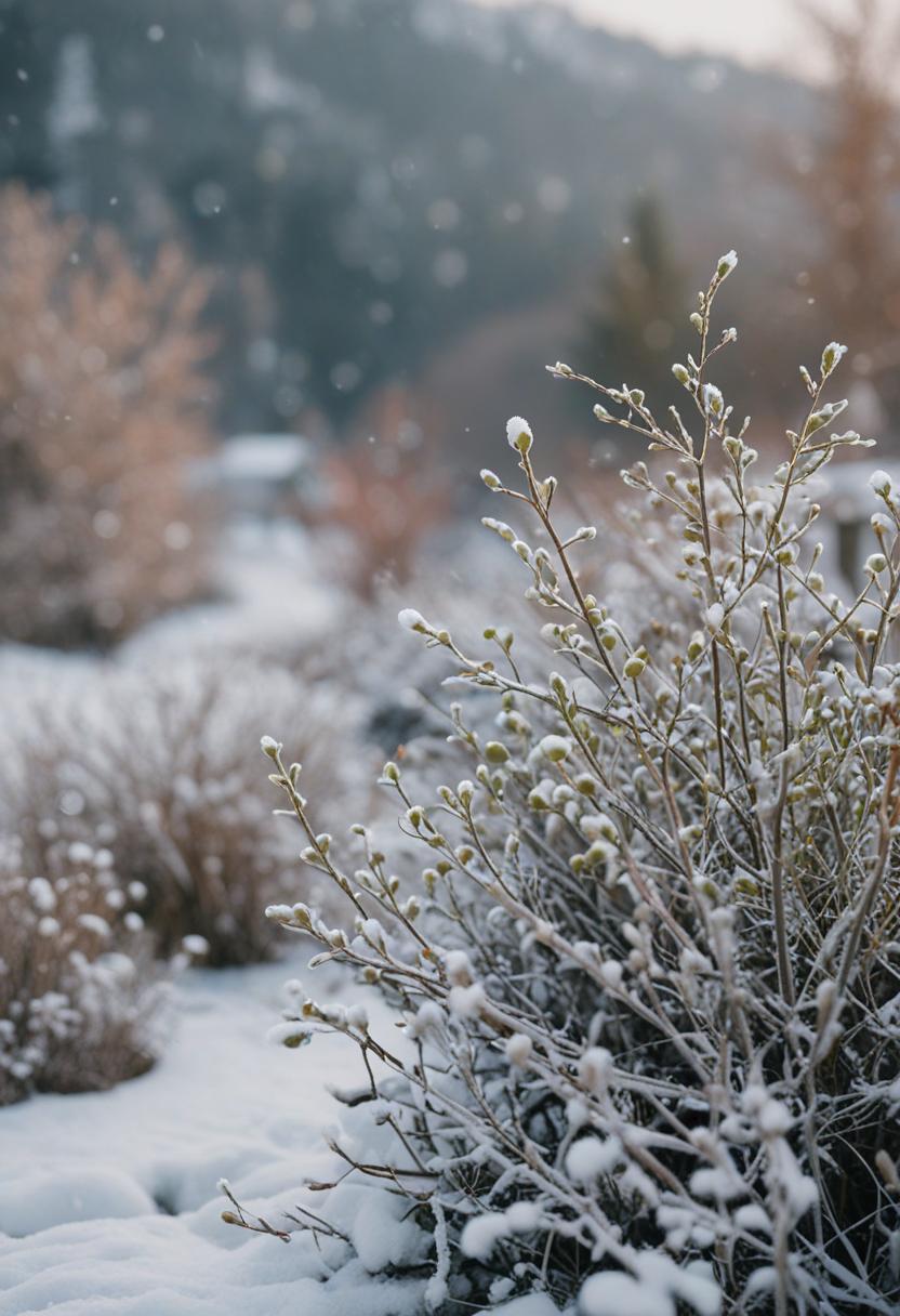 9. A serene winter scene featuring frost-covered plants, delicate snowflakes, and muted pastel tones, capturing the quiet beauty of nature during the cold season.