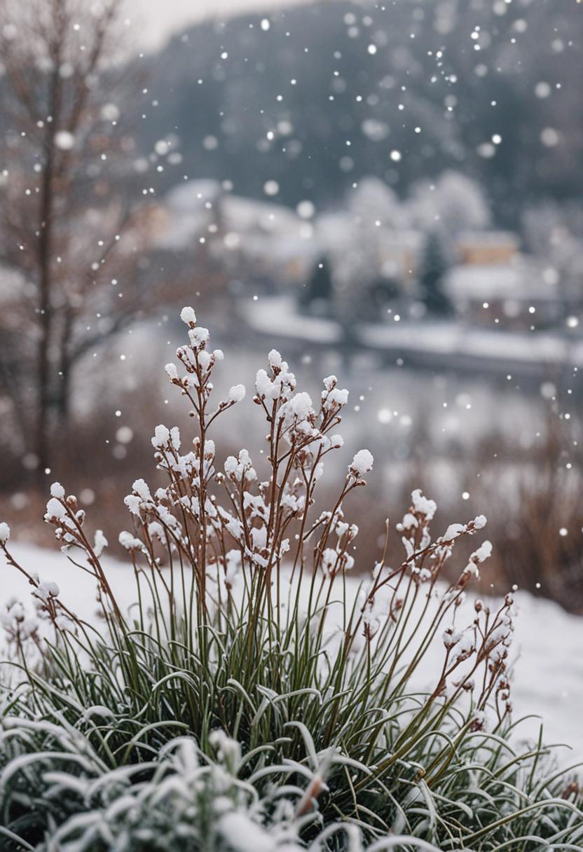 1. A serene winter scene featuring frost-kissed plants, with delicate snowflakes, evergreen branches, and blooming winter flowers, creating a peaceful, icy, and elegant winter aesthetic.
