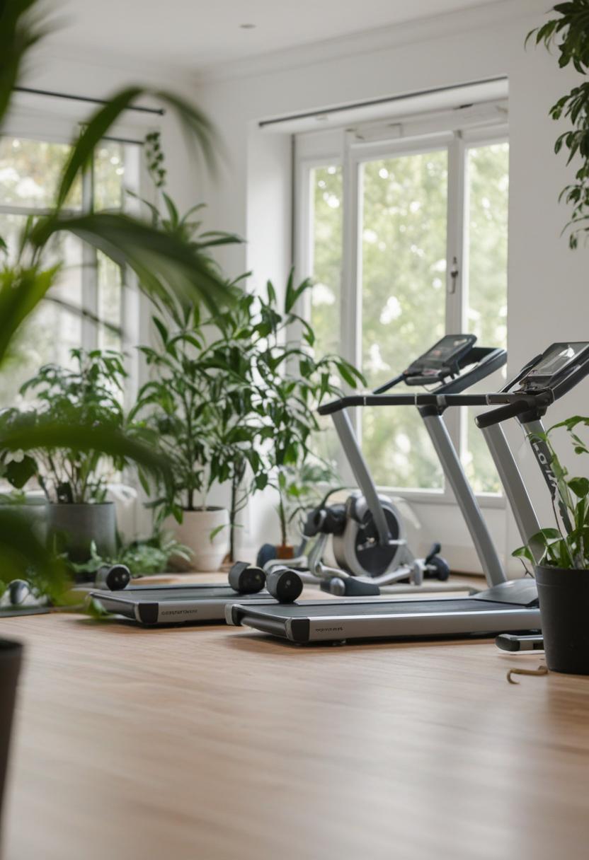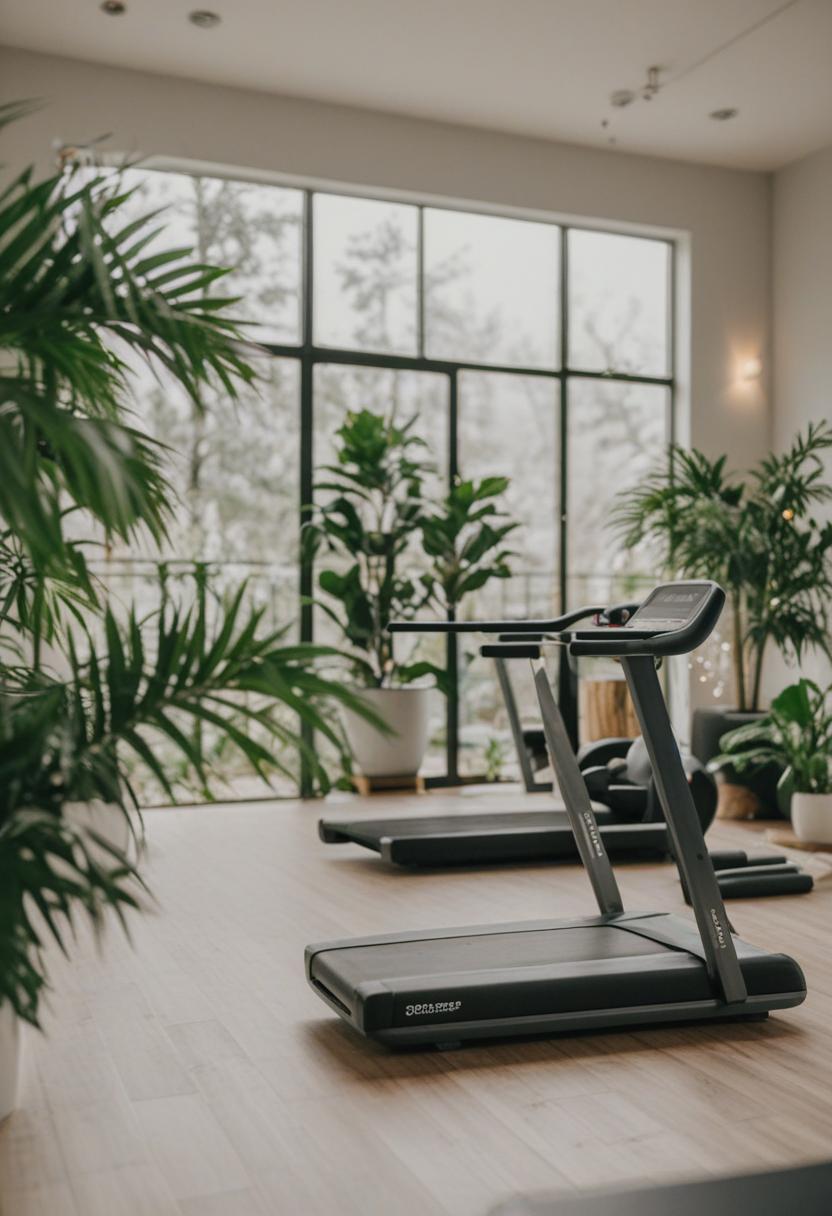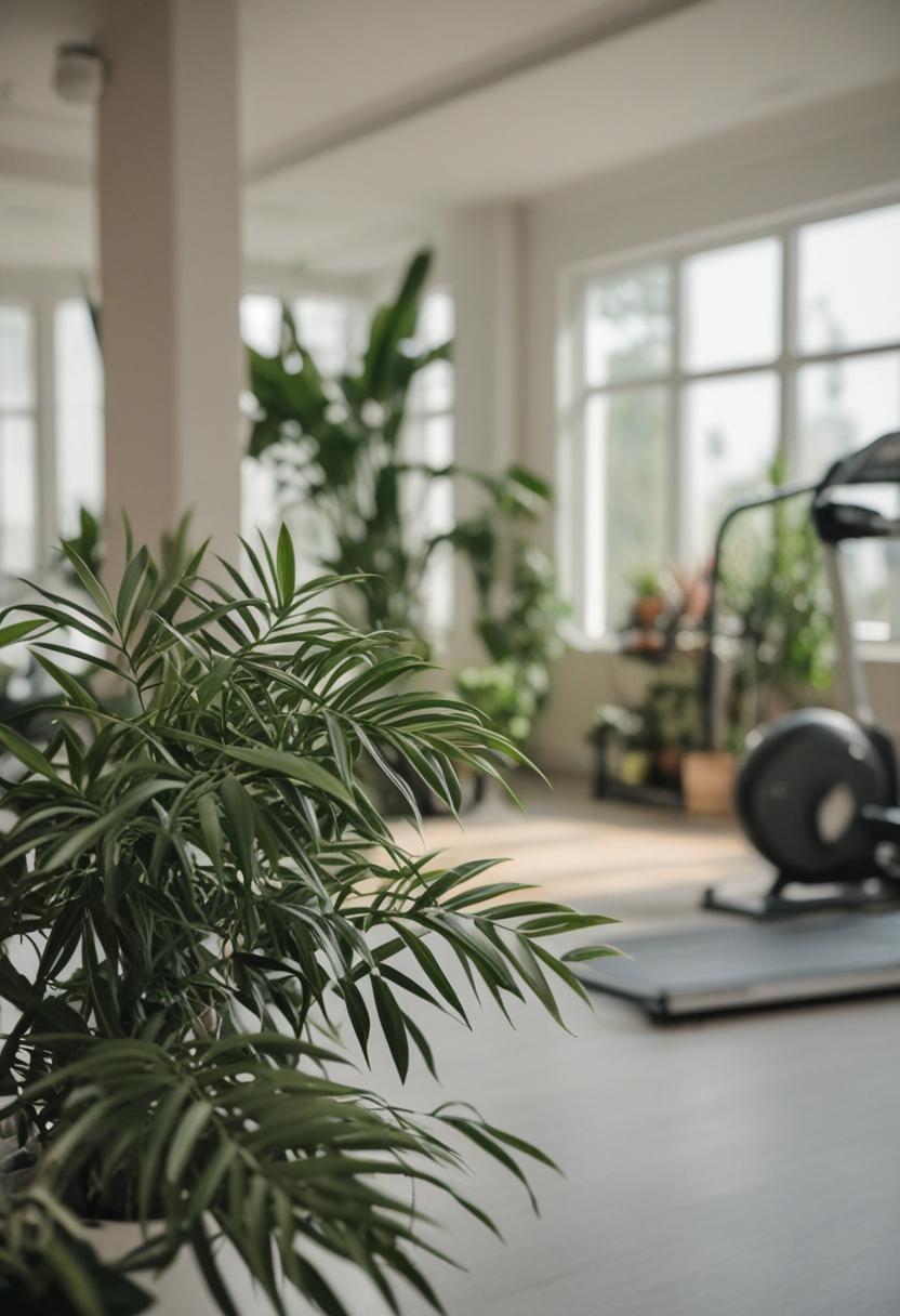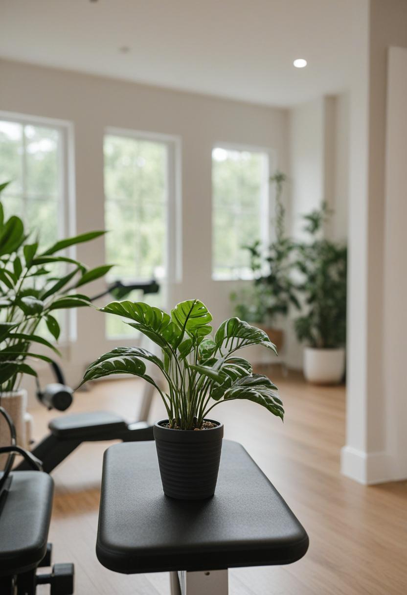 10. A fitness enthusiast in a gym setting, surrounded by sleek, modern plants that blend seamlessly with the workout aesthetic, creating a stylish and refreshing training environment.