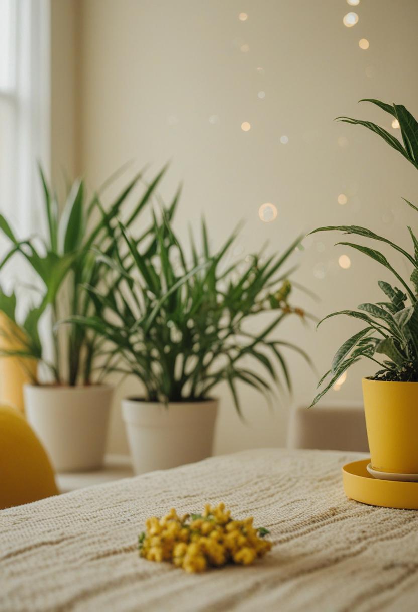 3. Soft, yellow-hued plants in a serene, sunlit setting evoke a warm, calming vibe. The gentle tones and natural textures create a peaceful, minimalist atmosphere perfect for a cozy indoor space.