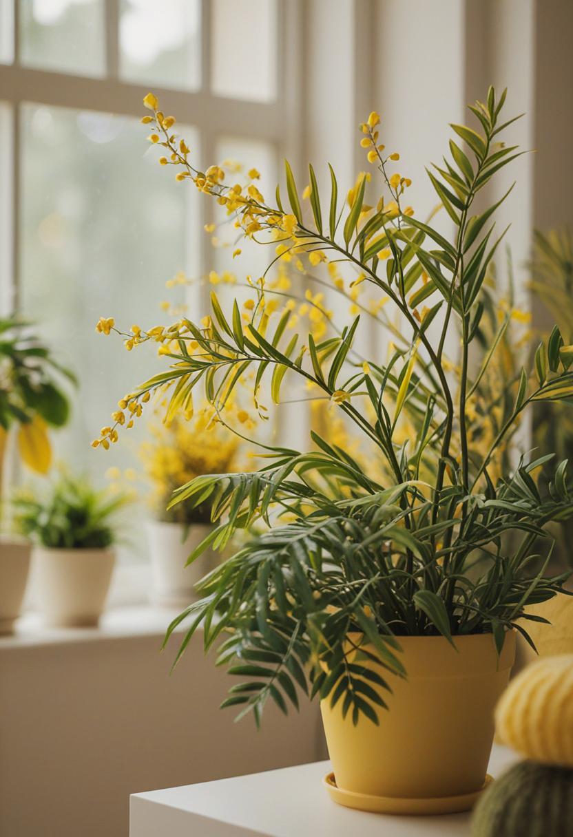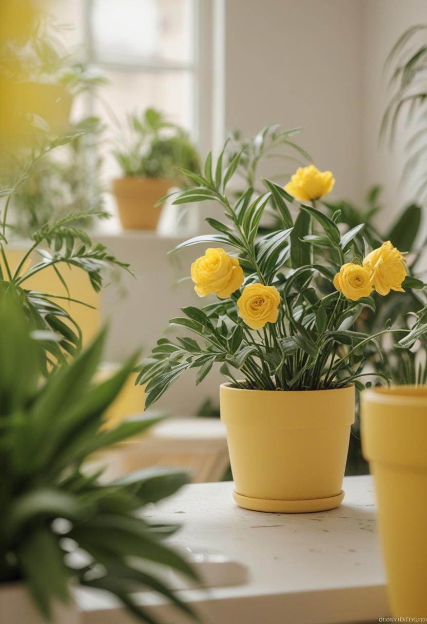 4. Soft, warm tones of yellow and gold blend with lush greenery, creating a serene, sunlit indoor garden. The plants thrive in natural light, adding a cheerful, calming vibe to any space.