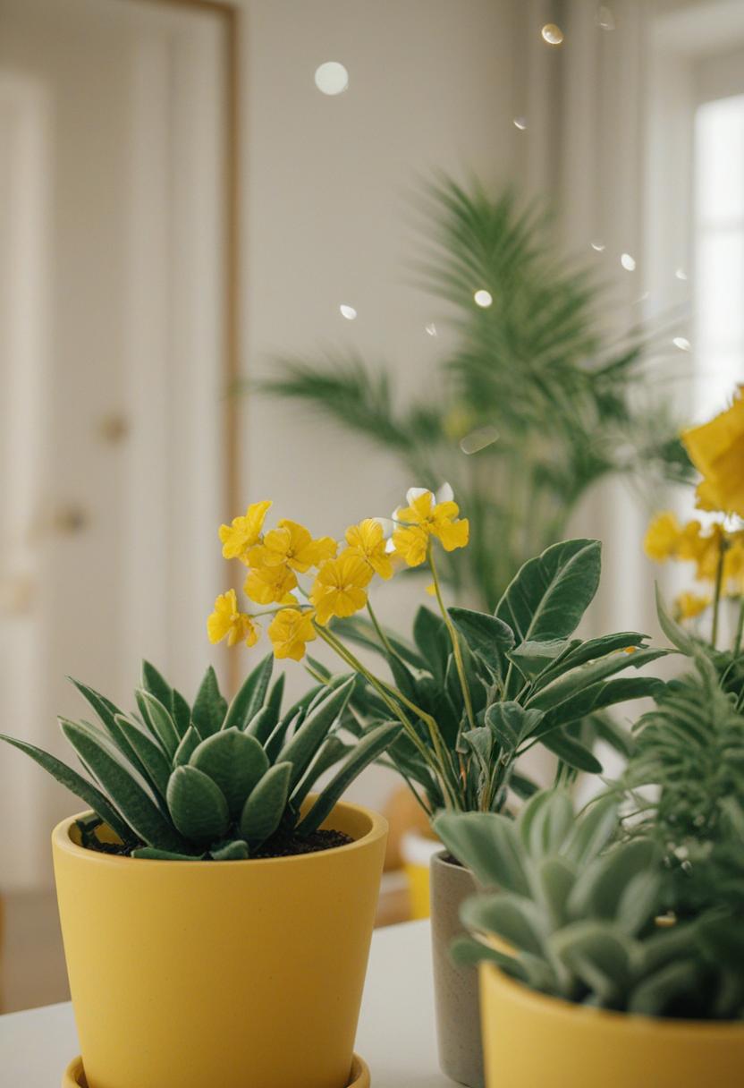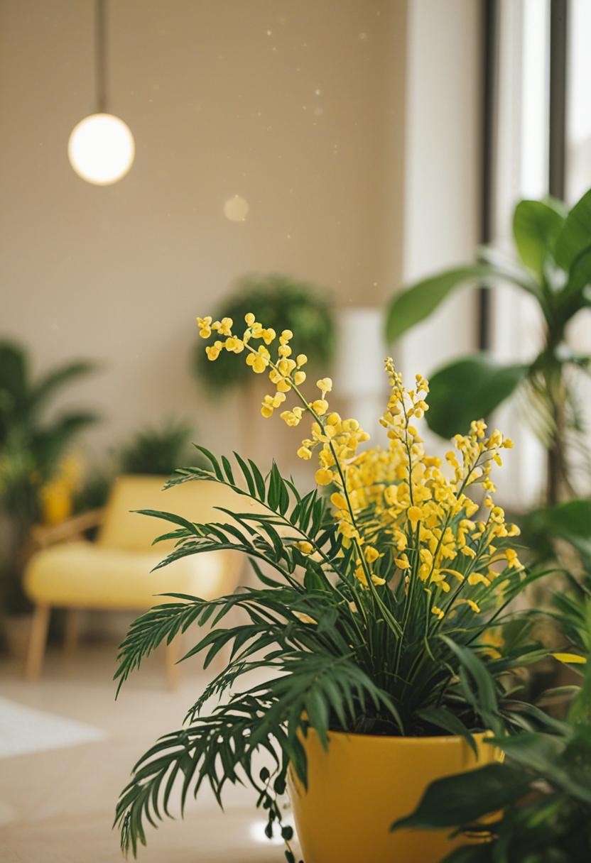 8. Soft, sunlit yellow plants thrive in a warm, cozy setting, exuding a calm and cheerful vibe. The vibrant hues and natural textures create a peaceful, inviting atmosphere perfect for a serene indoor space.