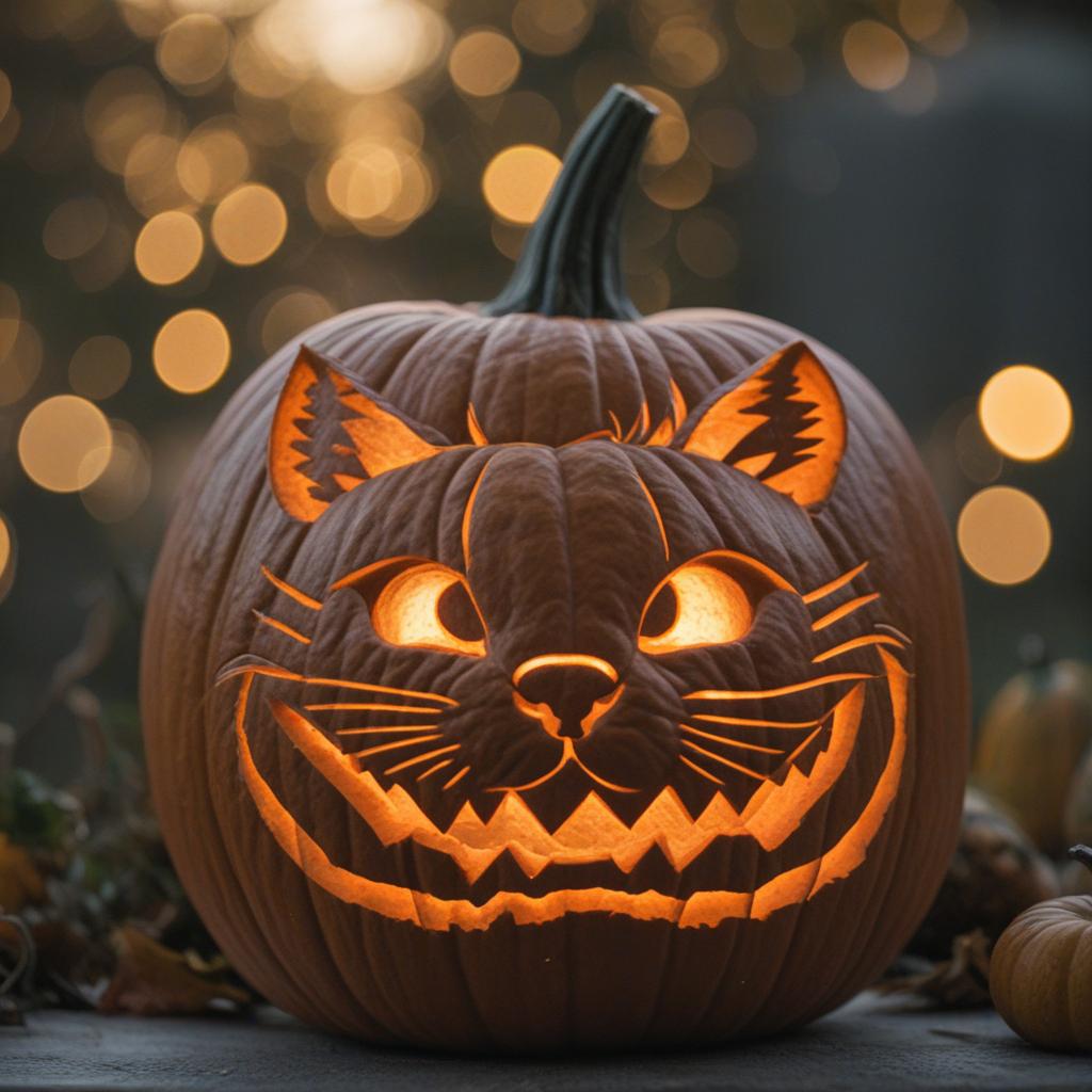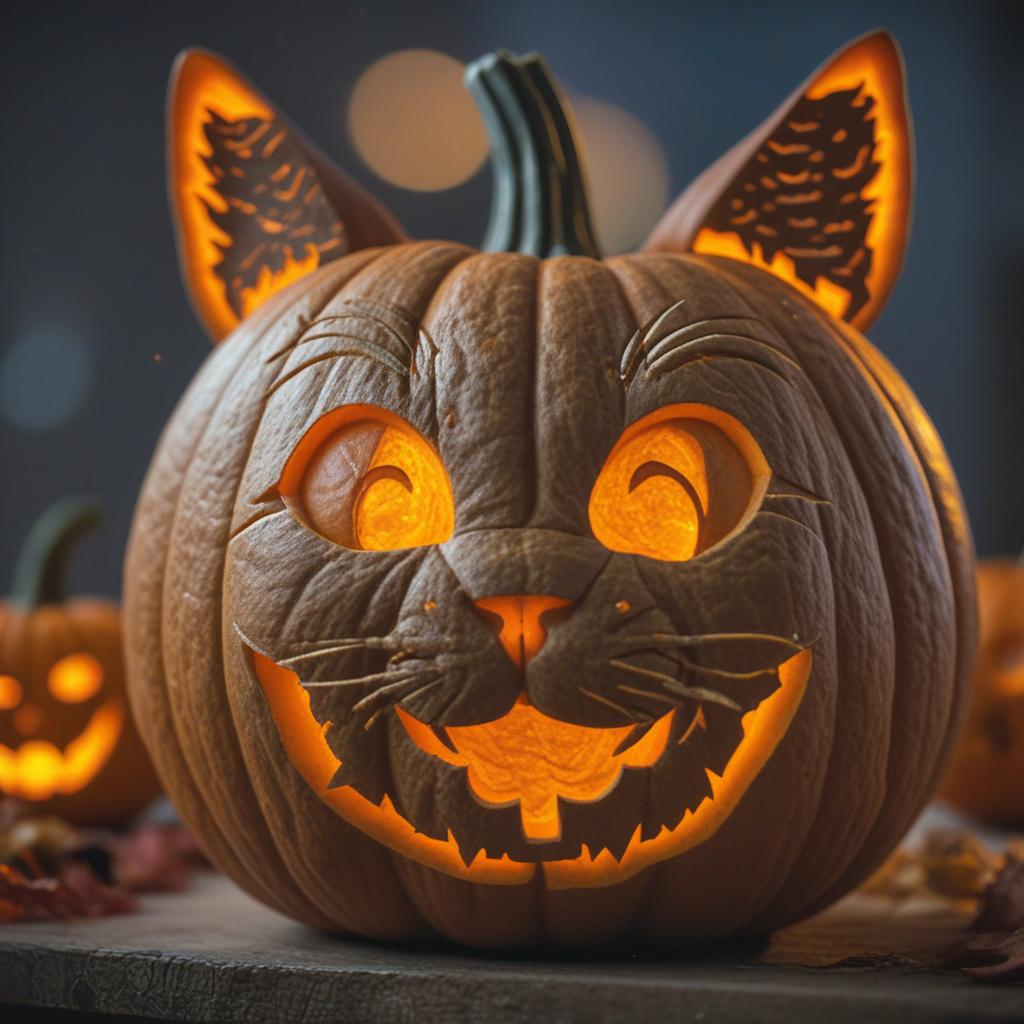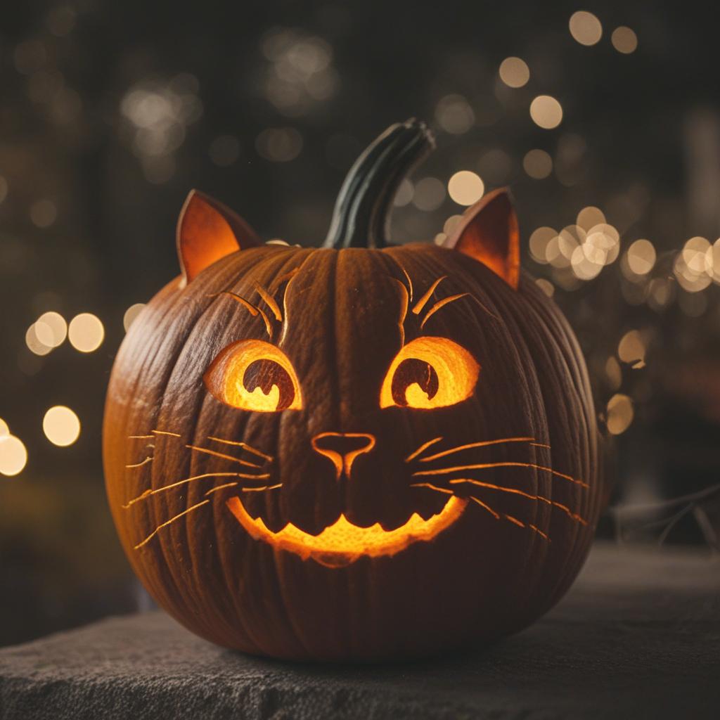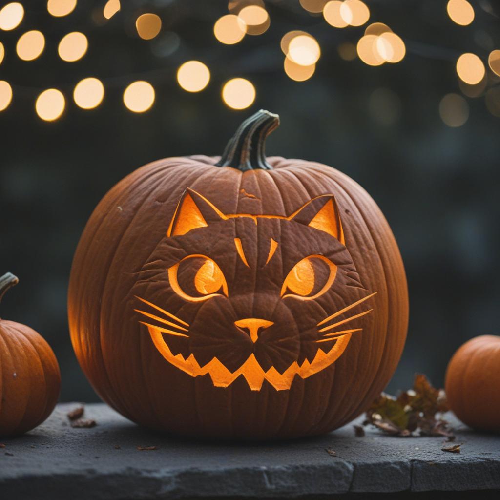 3. Creative pumpkin carving ideas featuring a cat theme, such as a smiling cat face, a cat with a collar, or a cat in a pumpkin costume. These designs add a playful and spooky twist to Halloween decorations.
