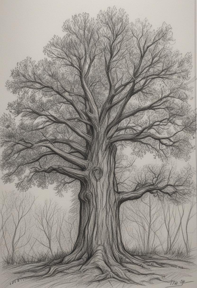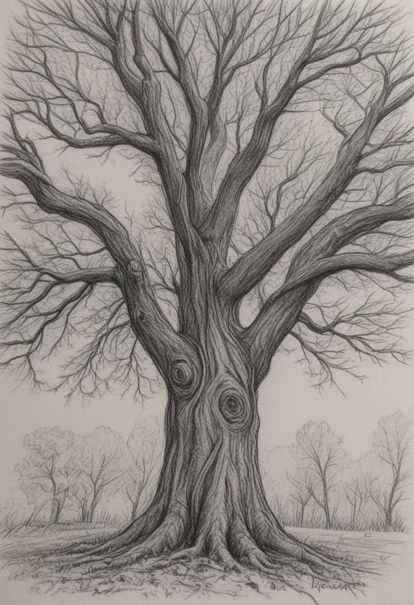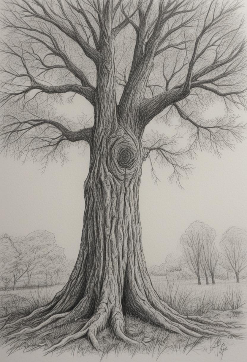 4. A delicate tree drawing artwork, featuring intricate lines and shading to create a realistic yet artistic representation of a tree, capturing the essence of nature through careful detail and creative expression.