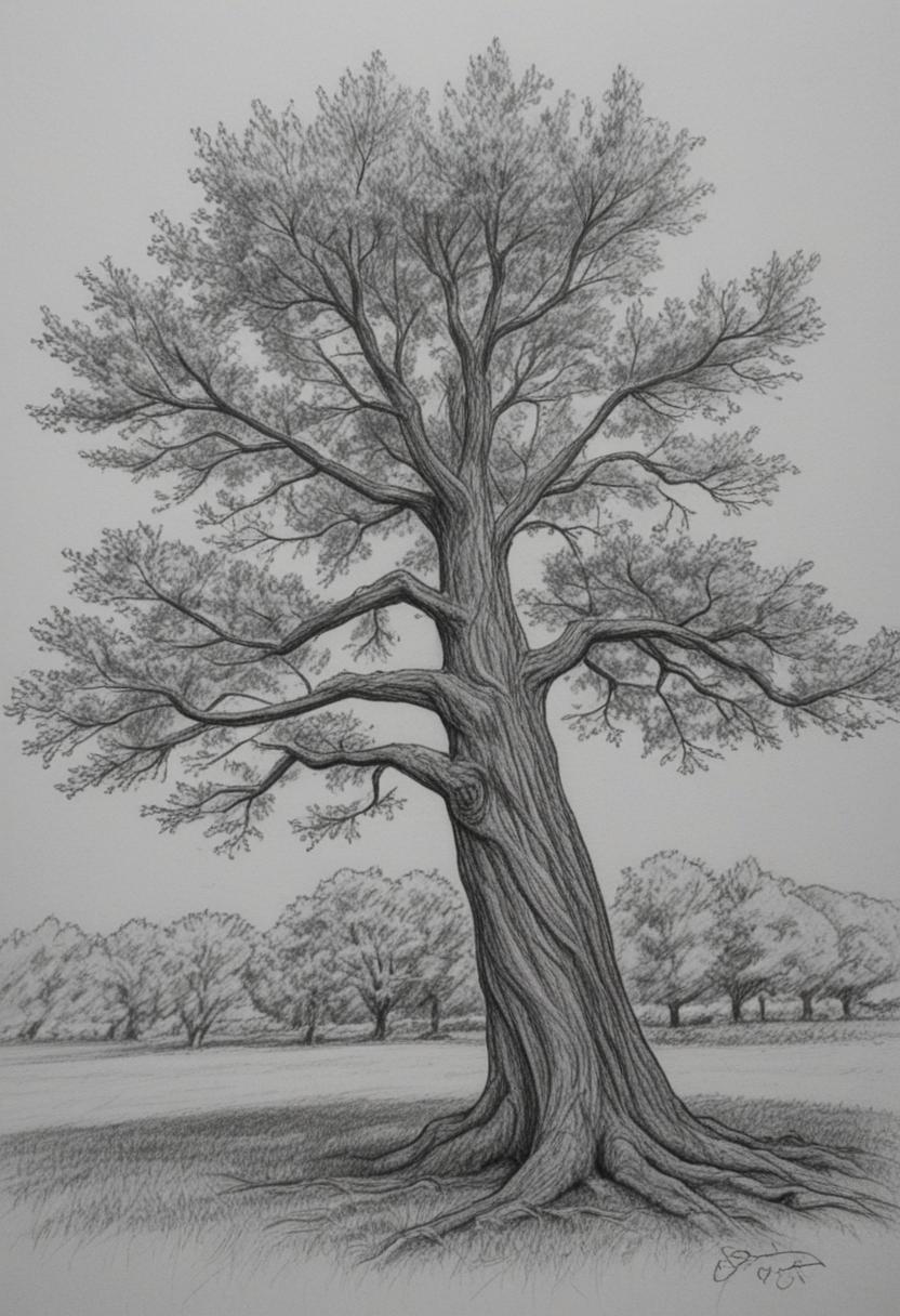 7. A graceful tree drawing art depicts a tall, slender tree with intricate branches and leaves, rendered in delicate pencil strokes, capturing the essence of nature's quiet beauty.