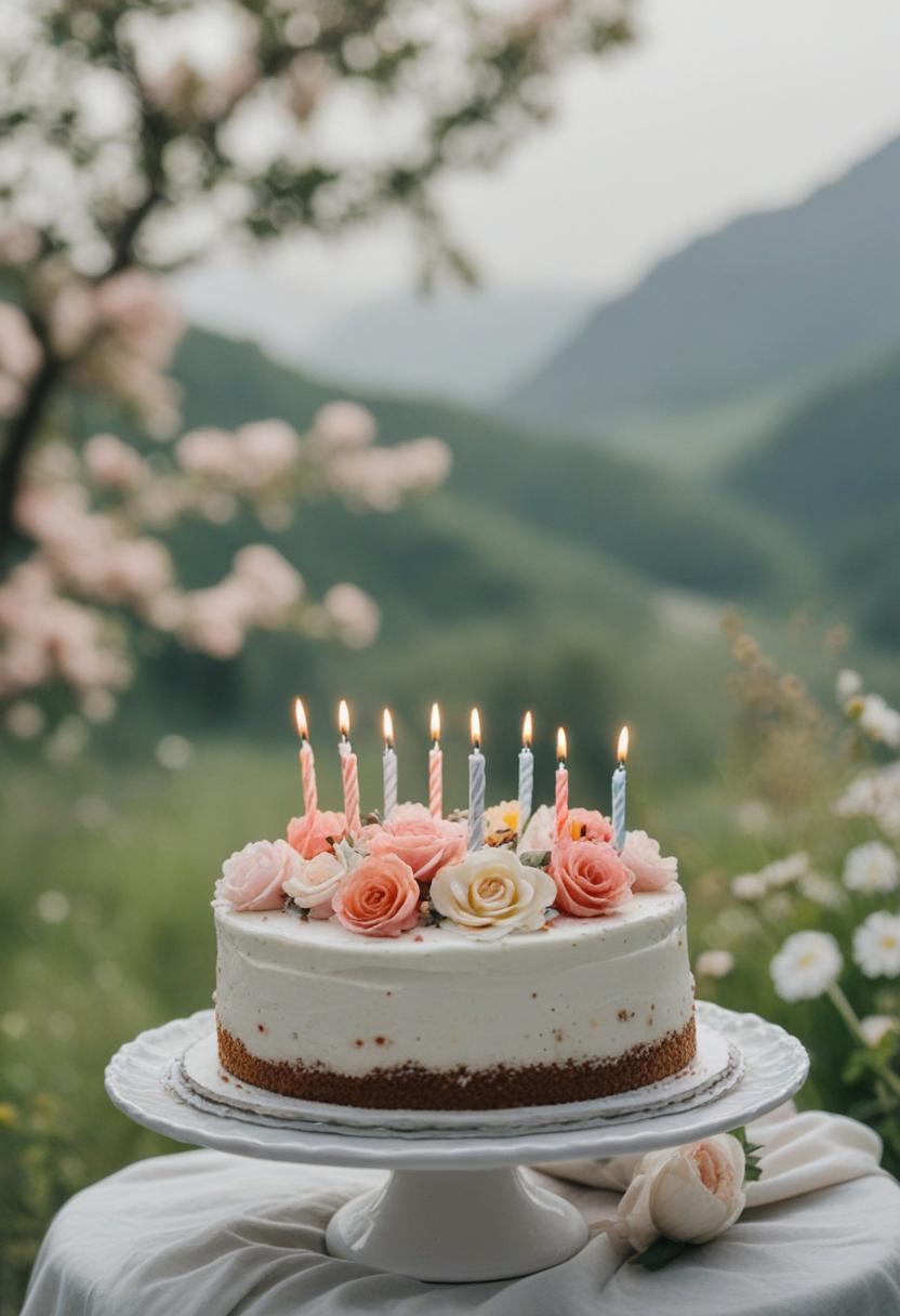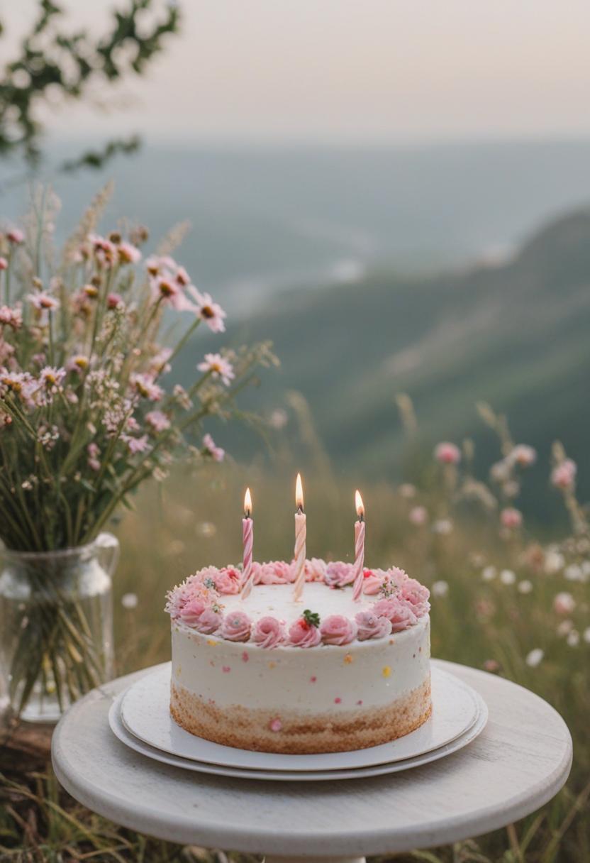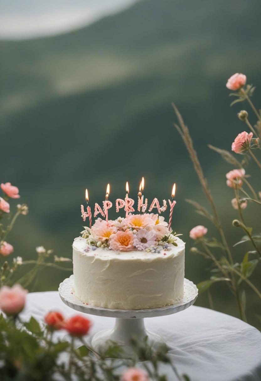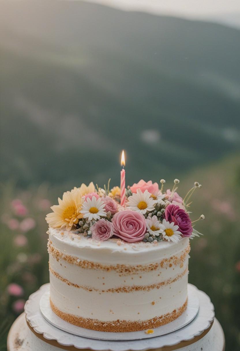 1. A vibrant birthday cake aesthetic featuring pastel flowers, soft lighting, and a sweet, celebratory vibe. Delicate petals, colorful frosting, and a joyful atmosphere perfect for a special occasion.