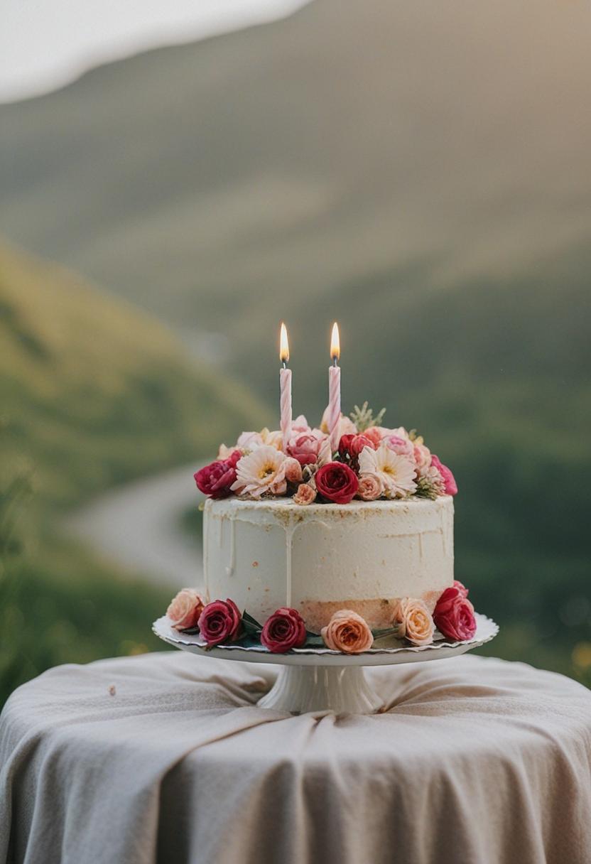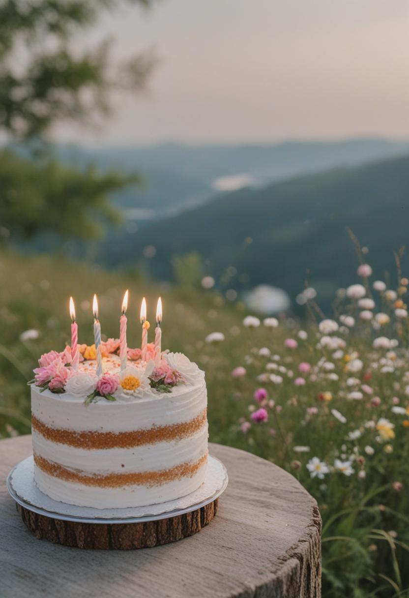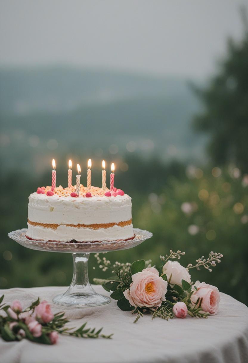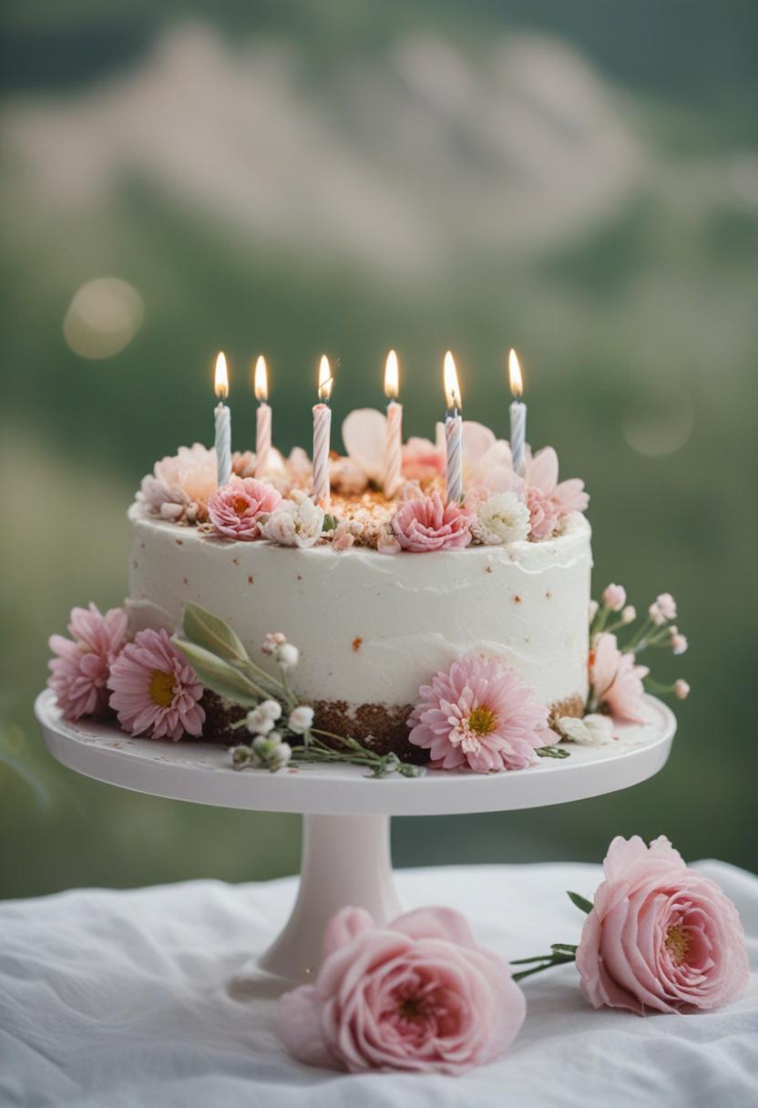 1. A vibrant birthday cake aesthetic featuring pastel flowers, soft lighting, and a sweet, celebratory vibe. Delicate petals, colorful frosting, and a joyful atmosphere perfect for a special occasion.