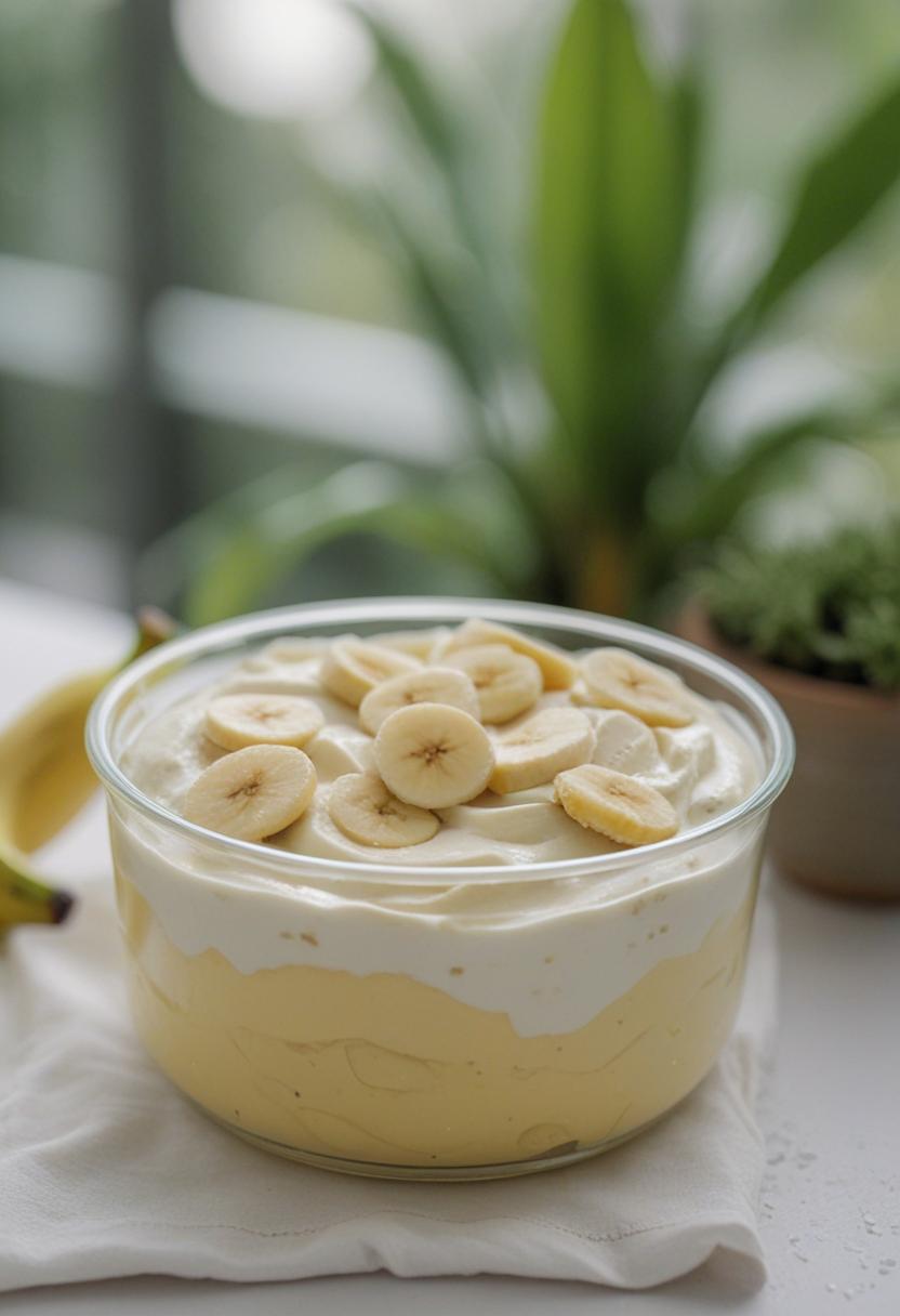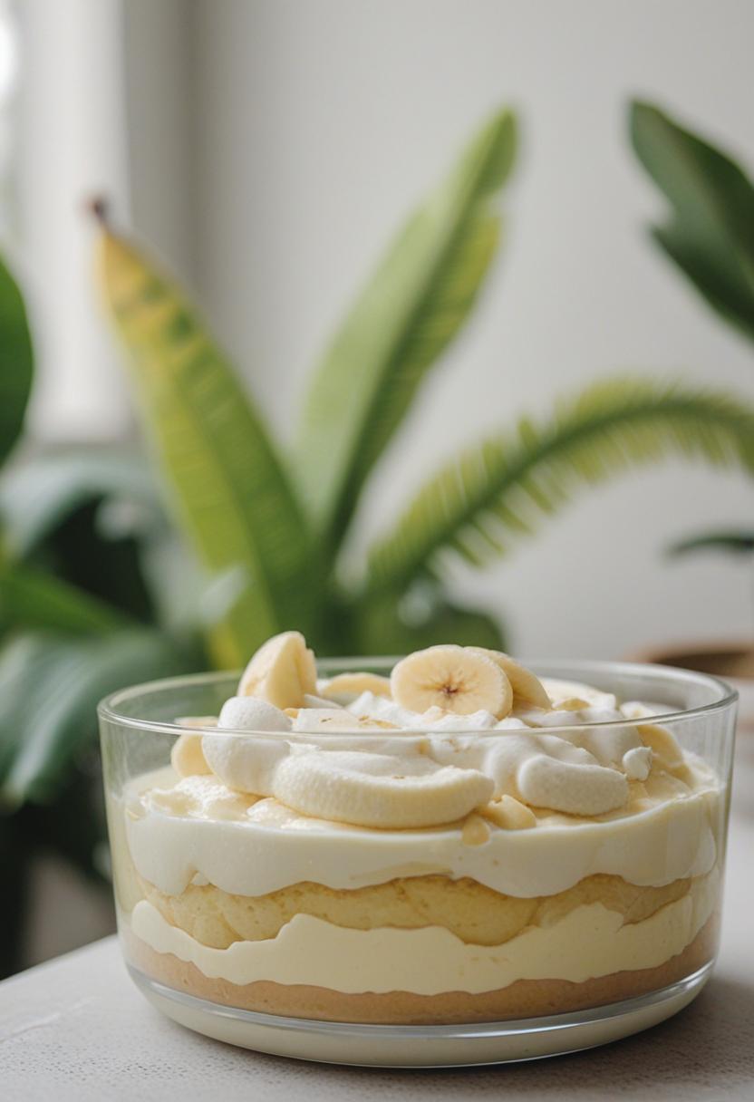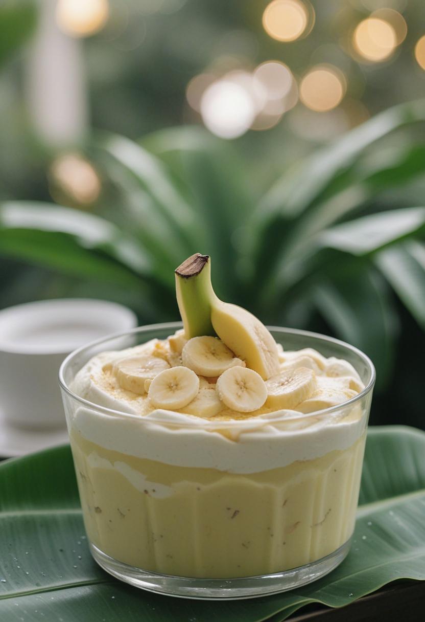 8. A whimsical blend of banana pudding and plant life, featuring pastel hues, fluffy textures, and sweet, sugary elements fused with lush greenery, creating a dreamy, dessert-inspired botanical vibe.